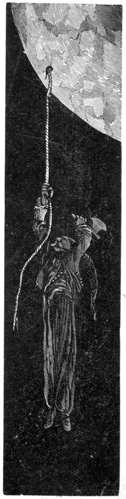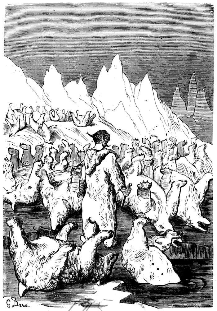 Jeg speidet rundt omkring i alle retninger, men kunde ikke se andet end vand. Forskjellen mellem det klimat hvor jeg nu var, og det som jeg var vant til hos Vulkan, begyndte ogsaa at bli ubehagelig. Tilsidst fik jeg langt borte øie paa en gjenstand som saa ut som en uhyre klippe og som øiensynlig kom imot mig. Jeg saa snart, at det var et isberg. Jeg undersøkte længe førend jeg fandt en revne, ved hvis hjelp jeg kunde komme op. Tilsidst lykkedes det mig dog, og jeg klatret op paa dets top, men til min store ærgrelse kunde jeg her heller ikke opdage land paa nogen kant.