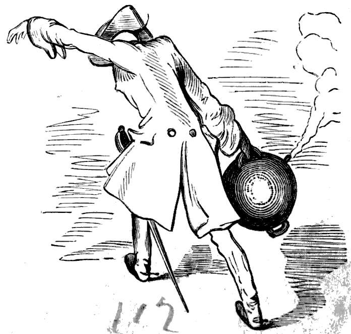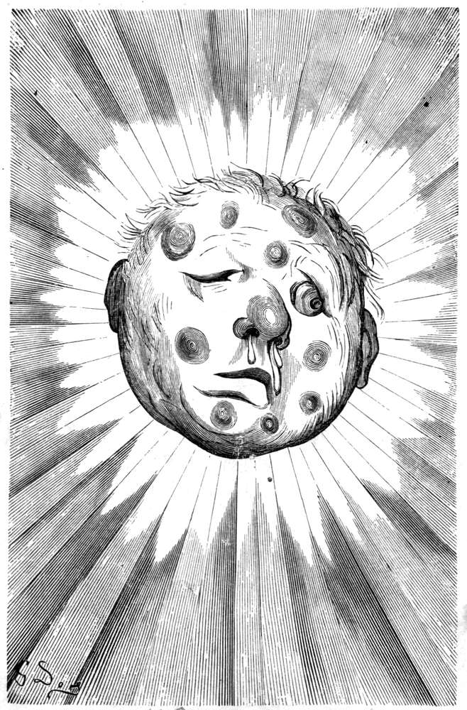 Jeg hadde ofte lagt merke til, at generalen hadde den vane fra tid til anden at løfte paa hatten; men jeg hadde ikke lagt nogen videre vegt herpaa, da det bare var aldeles rimelig, at han maatte være varm i toppen og kunde trænge til at kjøle sig. Endelig opdaget jeg, at hver gang han lettet paa hatten medfulgte den sølvplate, som tjente ham som hjerneskalle istedetfor det bortskutte stykke, og alle de flytende varer som han hadde indtat i aftenens løp, gik da ut i form av lette damper. Saaledes var hemmeligheten opklaret. Jeg fortalte et par av mine venner min opdagelse og vi besluttet at gjøre en prøve paa rigtigheten av den. Jeg stillet mig med min pipe bak generalen og tændte en fidibus i samme øieblik som han lettet paa hatten. Vi blev da vidner til et høist overraskende skuespil. Den røksøile, som opsteg fra generalens hode, var nu forvandlet til en ildsøile; de dunster som var nærmest hodet, blev i den klareste blaa lue til en glorie, pragtfuldere end nogen, som har omstraalt en helgens hode. Generalen blev først litt vred over den frihet, som jeg tok mig paa hans bekostning; men da det jo gav ham et saa høist ærværdig og hellig utseende, tillot han mig snart at gjenta det saa ofte, jeg vilde.