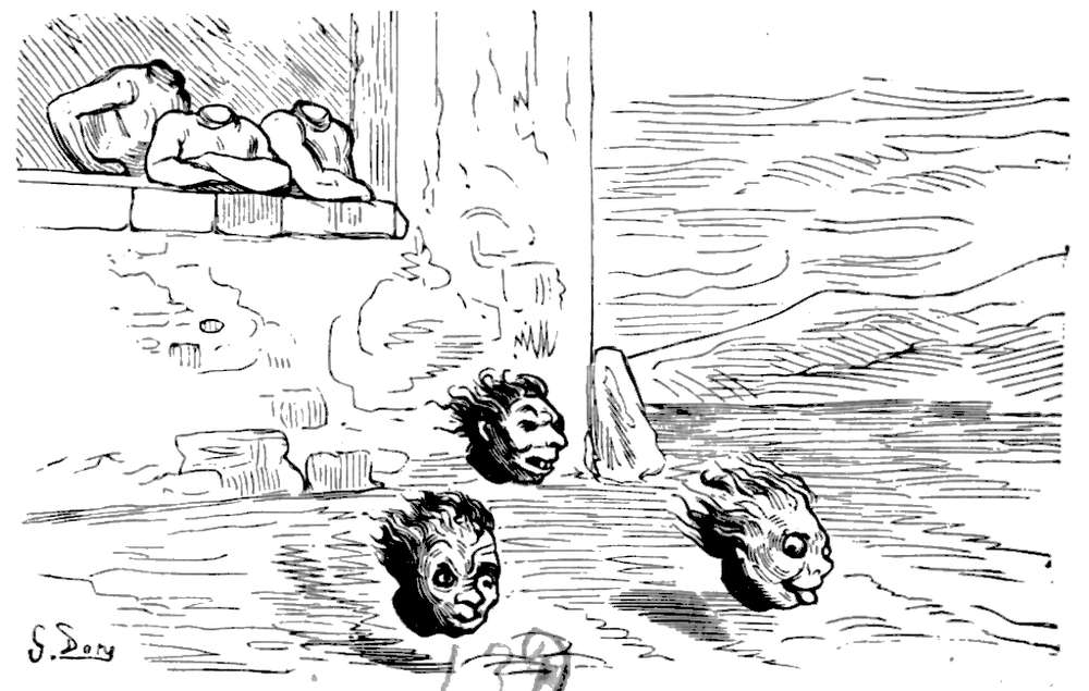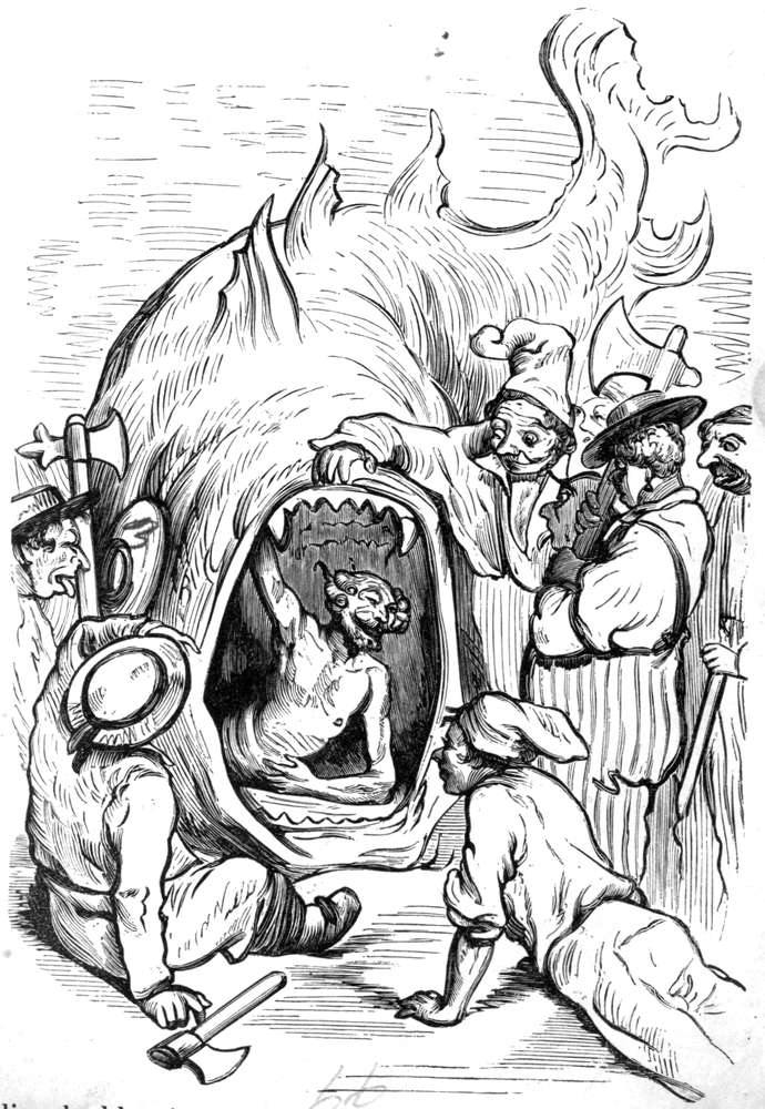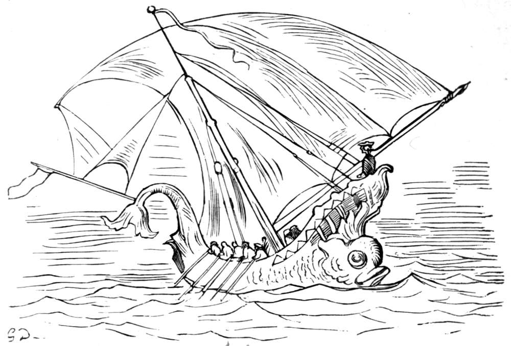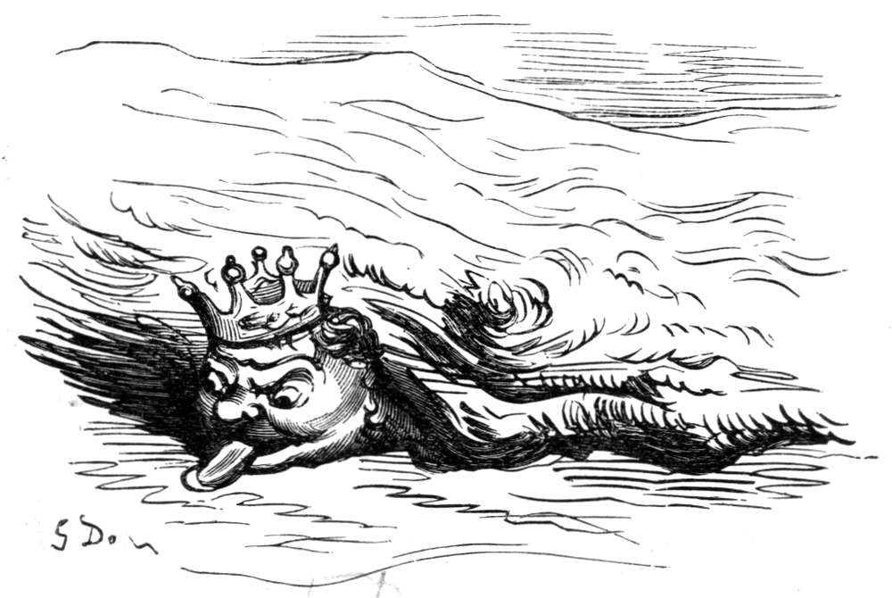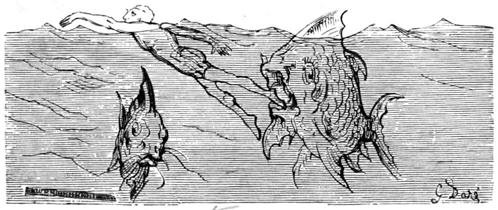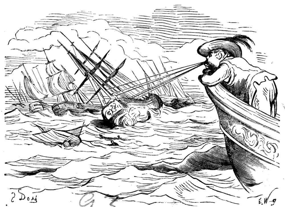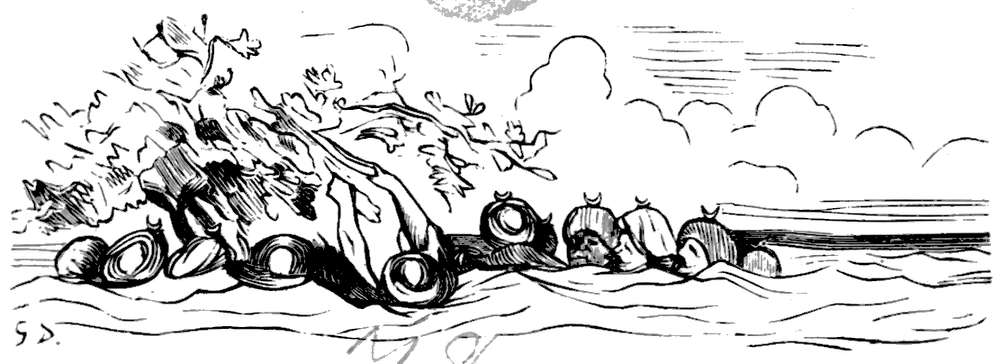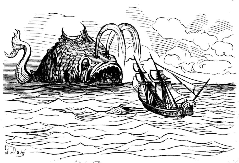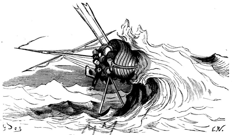 Efter nogen dages seilas, Gud ved i hvad retning, for vi var fremdeles uten kompas, blev vandet rundt omkring os aldeles sort; da vi undersøkte det nøiere, blev vi behagelig overrasket ved at finde at det var den deiligste vin istedetfor skiddent vand, som vi hadde trodd. Det var med største møie vi kunde avholde vort mandskap fra at drikke sig rent fordærvet. Men vor glæde varte ikke længe, for nogen timer efter fandt vi os paa alle kanter omringet av hvaler og andre uhyre store fisker, hvorav en især var saa stor at vi ikke med den allerbedste kikkert kunde se dens hale. Ulykkeligvis opdaget vi ikke uhyret, før vi var like ind paa det, da den med engang drog vort fartøi med fulde seil ind i sit aapne gap.