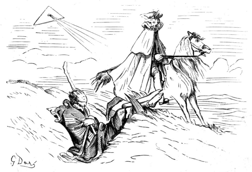 Jeg kunde ikke andet end føle medlidenhet med stakkaren. Skjønt jeg selv trængte haardt til min kappe, kastet jeg den dog over ham og kviknet ham op med noget av min feltflaske. Knapt hadde jeg utført denne kjærlighetsgjerning, før jeg hørte en røst fra skyen: