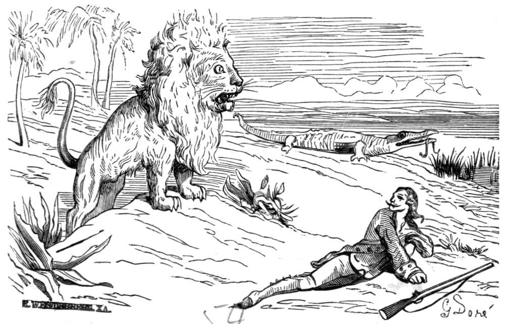 Det var ingen utsigt for mig til at slippe fra den, hvorfor jeg la mig ned paa bunden av slæden og lot min forskrækkede hest løpe for livet. Da skede det som jeg hadde ønsket, men neppe hadde turdet haabe. Ulven brød sig ikke det mindste om min ringe person, men satte over mig og anfaldt med raseri hesten, hvis bakdel den øieblikkelig sønderslet og slukte med graadighet. Det arme dyr for i sin skræk og smerte avsted i frygtelig fart. Da jeg saaledes selv var utenfor fare for øieblikket, vovet jeg at løfte hodet og saa med skræk, at ulven næsten hadde ætt sig ind i hestens krop. Det varte ikke længe før den var dypt inde i hestens legeme; men da pisket jeg av alle kræfter paa den bakfra, saa den forvirret skyndte sig at æte sig forover, indtil tilslut hestens kadaver faldt ned paa jorden. I stedet hadde jeg nu faat ulven i sælen, og da jeg brukte pisken saa flittig som jeg kunde, ankom jeg snart mot begges forventning og til tilskuernes høieste forbauselse til St. Petersburg.