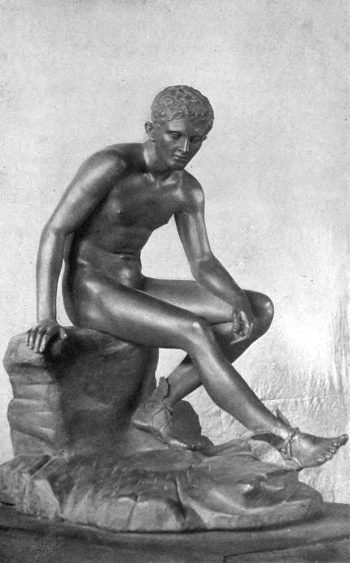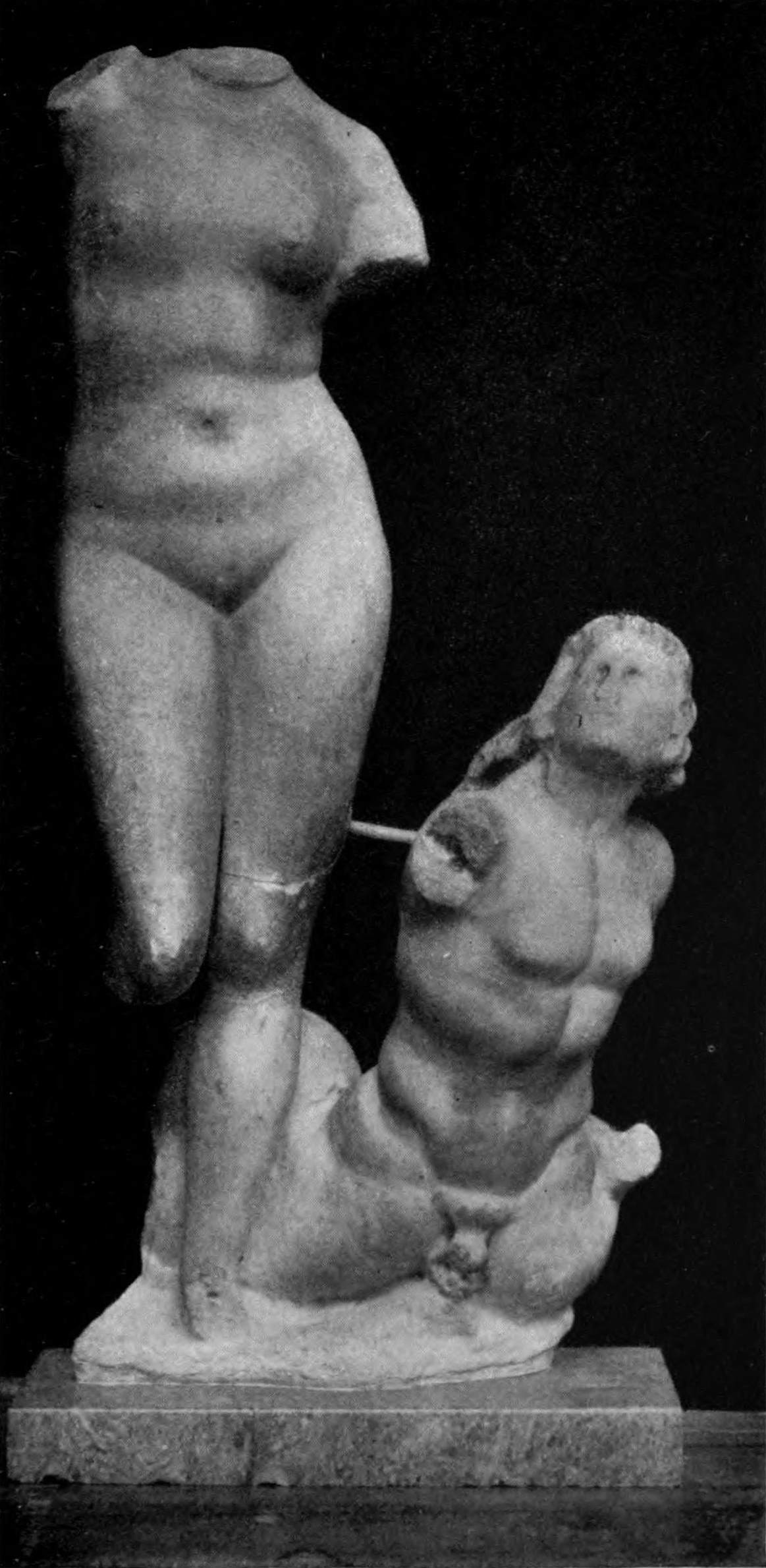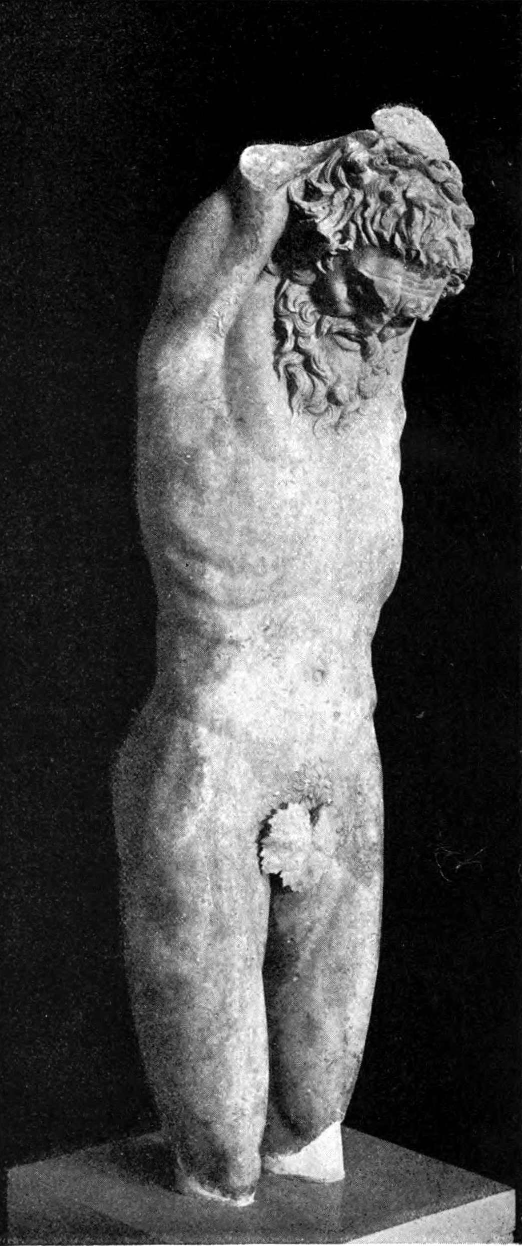 The kingdom of Pergamon included the area of the old Ionian cities, and inherited, therefore, an artistic tradition as old as its own existence. It is no matter for surprise that its art-loving monarchs should have founded a great library and a great school of sculpture in open rivalry with the richer resources of Ptolemaic Alexandria. The art of Pergamon is well known to us from the magnificent groups and figures of the Gallic dedications of Attalos I after his victories about 240 B.C., and from the marvellous frieze of the altar excavated in situ by the Germans, which belongs to the period of Eumenes II and the early second century. But before we come to these later developments of Pergamene art, it is important that we should discover the earliest tendencies and predilections of the Pergamene court in the first half of the third century. We are told2 that the most remarkable work of Kephisodotos, the son of Praxiteles, was his ‘symplegma’ at Pergamon—probably an erotic group—which was noteworthy for its extraordinarily naturalistic rendering of the pressure of the fingers into the flesh. Such erotic groups of nymphs and satyrs or hermaphrodites exist in5 our museums, and are ultimately derived from this type of statue. Actual discoveries at Pergamon support this conception of early third-century Pergamene art. The well-known Hermaphrodite in Constantinople (Fig. 1) and a beautiful girl’s head in Berlin3 show the extreme delicacy in the rendering of flesh and the fondness for a sensual body treatment which we might expect from an Ionian version of the schools of Scopas and Praxiteles. The existence of such a school in Ionia in the late fourth century is highly probable. The Pergamene school of the early third century would seem to be the later natural development of the creators of the Ephesos columns and the Niobids. Scopaic expression and Praxitelean flesh treatment are the hall-marks of the school. Another work of importance for the early Pergamene period is the Crouching Aphrodite type, so popular in Roman times. Of this statue Pliny tells us: ‘Venerem lavantem se Daedalus fecit.’4 This Daedalus was a Bithynian artist of the early third century, who must have fallen under the general influence of the prevalent Pergamene school. His Aphrodite5 shows exactly the artistic tendencies of the early Pergamene school. The motive is unimportant and frivolous—a genre motive of a girl washing herself—but it is used for the purpose of demonstrating the technical skill of the artist in displaying the nude female form. The artist does not use all his skill in the effort to produce a noble or even a romantic ideal. The subject is immaterial, provided it affords a chance of showing his technical skill. The crouching attitude is a new one in art, and one well adapted for exhibiting the6 human body in all its variety. It appears again in the Attalid dedications, and was evidently a favourite at Pergamon. Another example is in the well-known Knife-Grinder of the Uffizi,6 part of a great group of Marsyas, Apollo, and the Scythian slave, which we can certainly connect with this period of Pergamene art. The Knife-Grinder himself is a copy and not an original. That is made clear by his late plinth, in spite of his magnificent workmanship. But the finer copies of the hanging Marsyas, which belongs to the group, are in a Phrygian marble, betraying their Pergamene origin. These copies of the Marsyas are divided into two types: a so-called ‘red’ type (Fig. 2), made of the Phrygian marble, in which the expression of agony is more marked, and a white type7 in which the face is less distorted. A theory has been put forward that the white type represents an early third-century prototype, while the red type is a Pergamene variation of rather later date.8 We may, however, hesitate to see sufficient difference in the two types to make so wide a distinction. The white type may be merely a less masterly adaptation of the red. An Apollo torso9 in Berlin from Pergamon with the right hand resting on the head agrees with a marble disc in Dresden10 showing a similar figure confronted by the hanging Marsyas. We may therefore associate this figure as the third member of the group with Marsyas and the Knife-Grinder.11 The Apollo is a seated figure of distinctly Praxitelean influence. The keen expression of the Knife-Grinder and the agonized7 face of the Marsyas may equally well be attributed to Scopaic teaching. We have a good example of this mixed tradition in early Pergamene art. Technically we are at once compelled to notice the immense advance in realism and anatomical study. The hanging Marsyas shows a correct appreciation of the effects of such a posture on swollen veins and strained abdomen. The corner of the mouth is drawn up in agony; the forehead is corrugated with rows of wrinkles; the hair, even on the chest, is matted with perspiration. One would say that so remarkable a statue could only be studied from nature, and one recalls the stories of Parrhasios, who is said to have used an actual model for his Prometheus Bound.12 We are long past the time when sculptors worked from memory. Even Praxiteles was said to have made his Cnidian goddess with Phryne as a model. In the Knife-Grinder we may perhaps detect some of the earliest traces of that exaggeration of the muscles which will so soon affect athletic art.