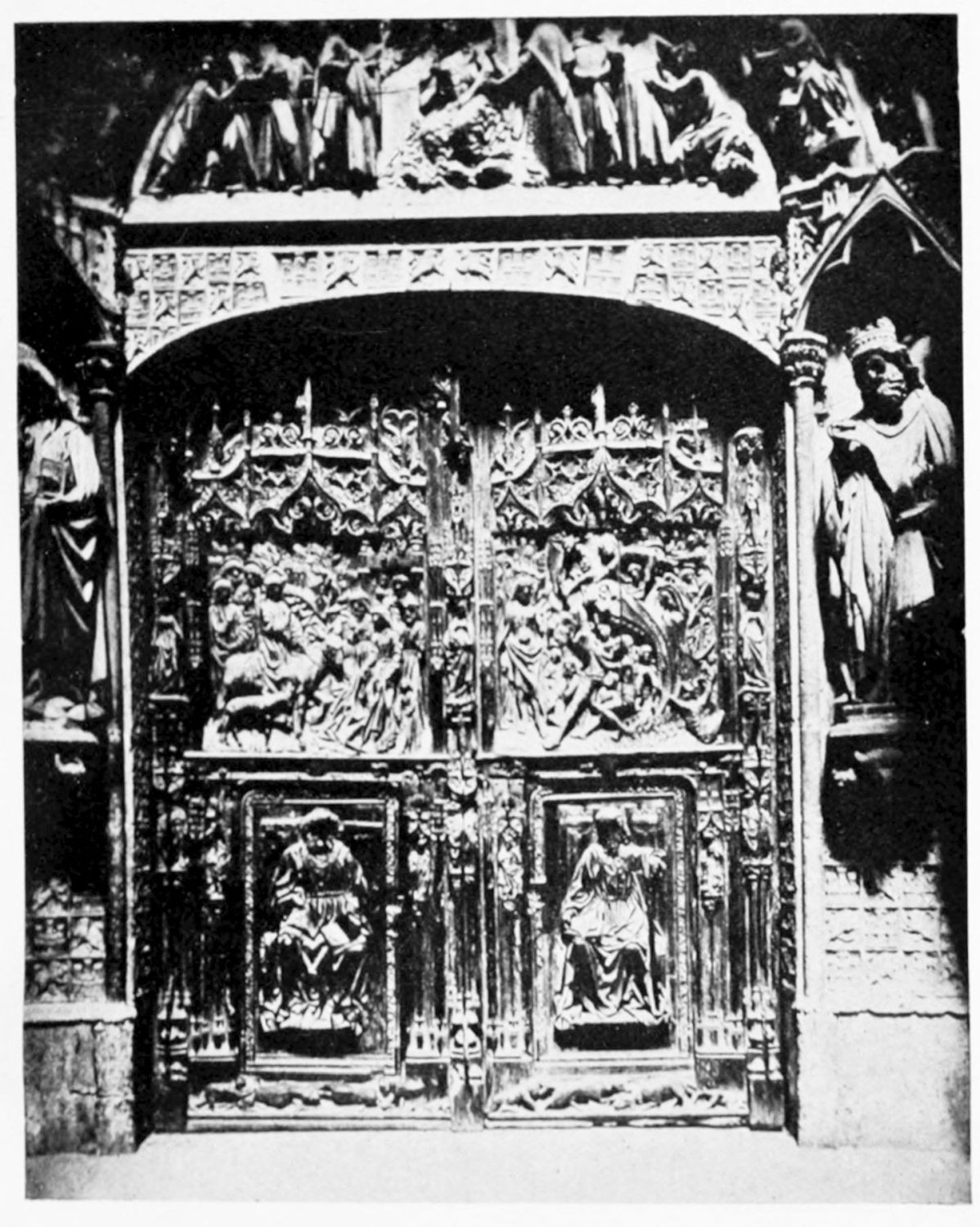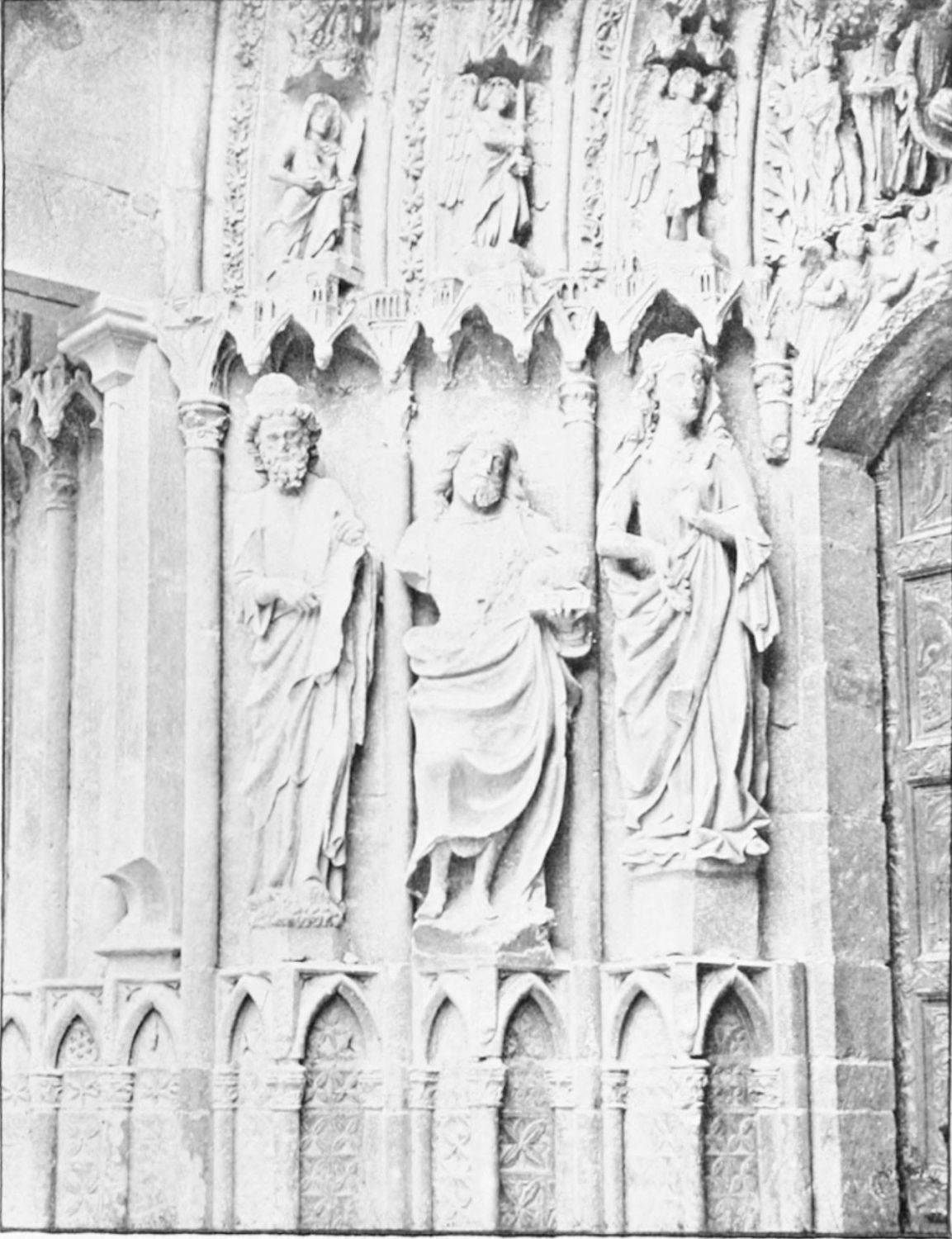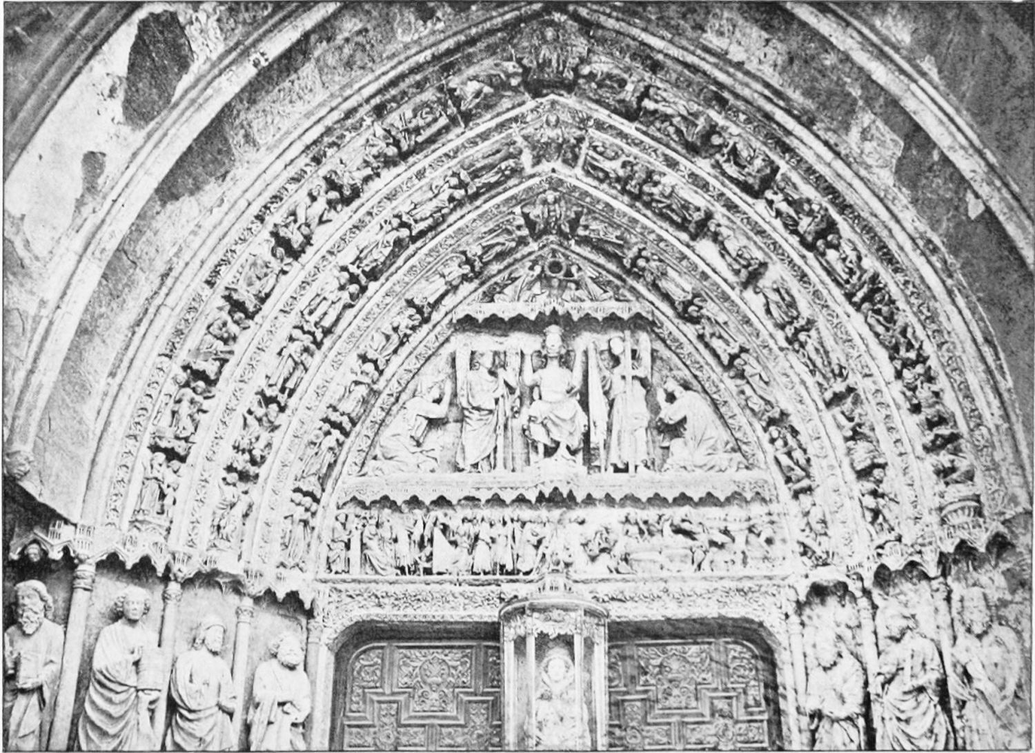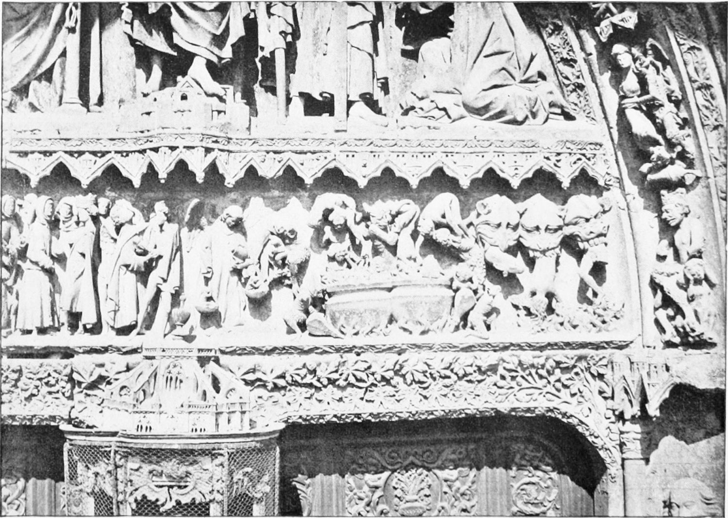 The central shaft of the middle door is disfigured with a dressed-up image of the Virgin enclosed in glass. The sculpture of the tympanum is spirited and elaborate. In a composition depicting the Last Judgment devils are seen stirring their fires and plunging the reprobate into seething cauldrons. On the side of the blessed a young man extracts cheering music from what is perhaps a harmonium. The attitudes of the just express the liveliest satisfaction, whereas a crowned personage, striding boldly into Paradise, is met and warned off by a celestial Janitor. The naïve and fantastically horrible are curiously blended in this skilful work. The southern doorway is the least interesting of the three; the subjects of the reliefs are the death and coronation of the Virgin.
