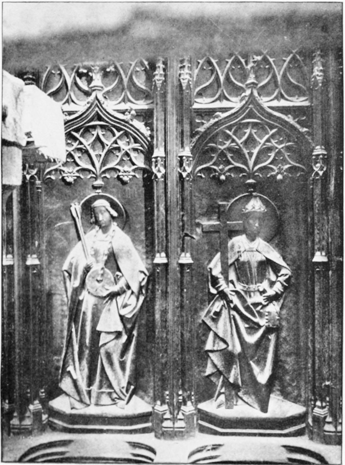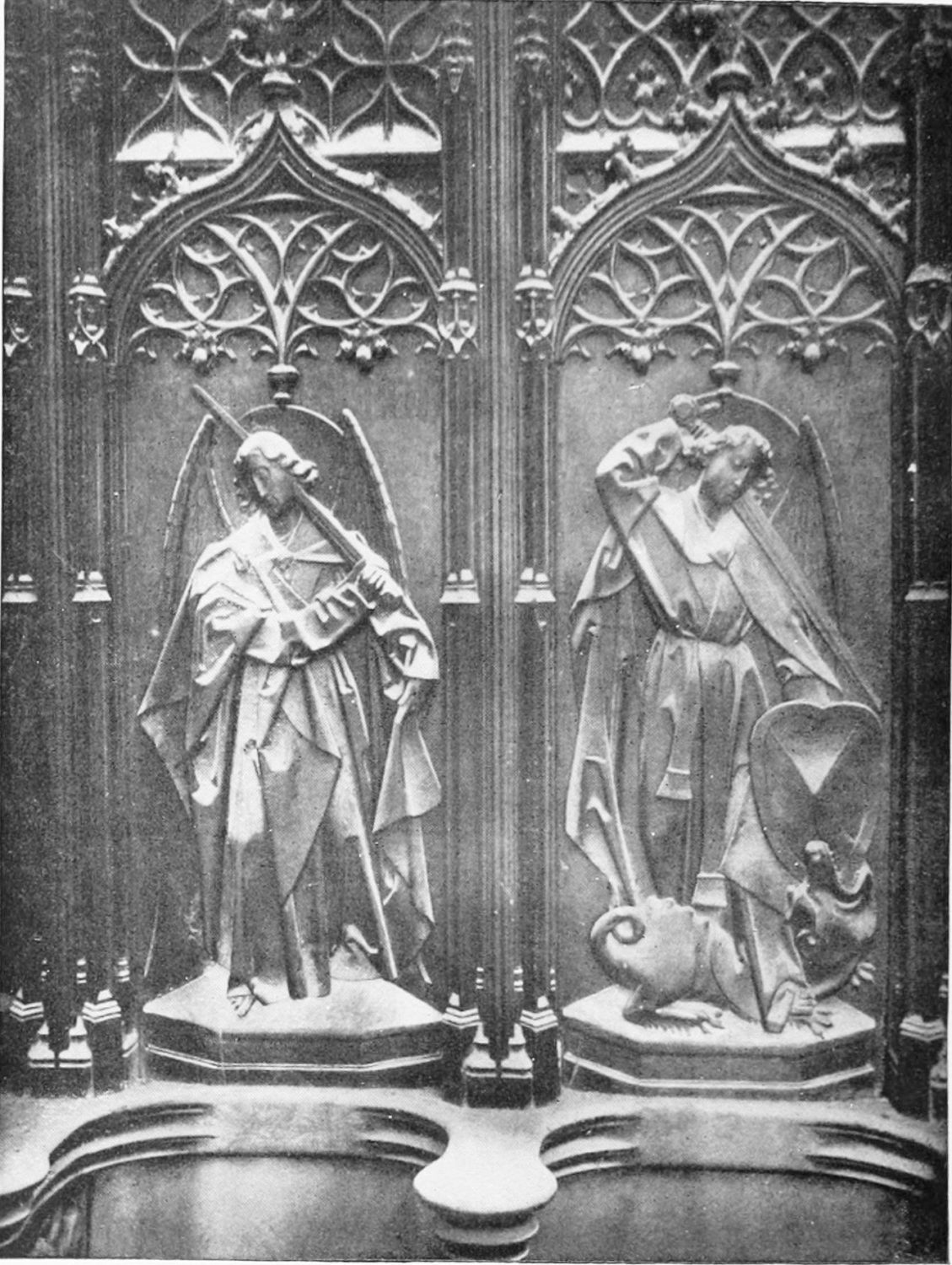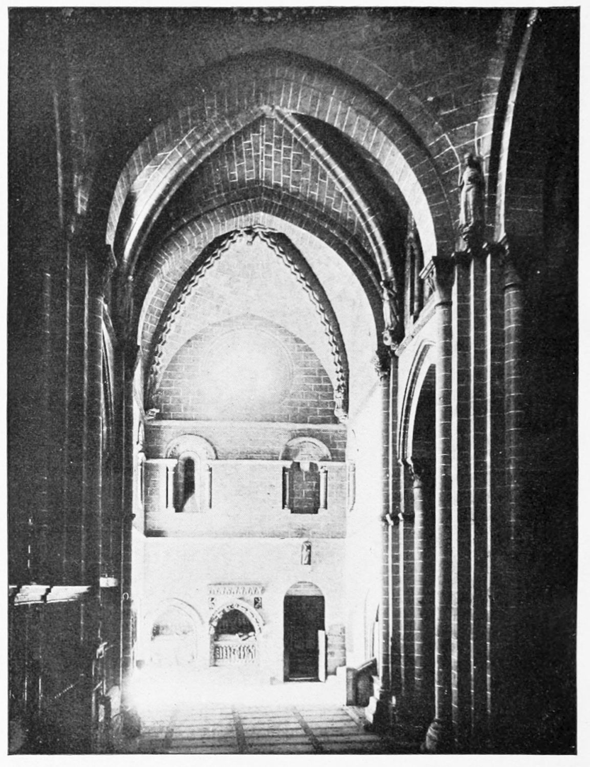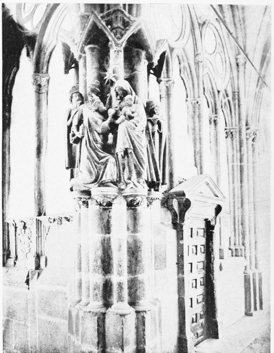The central shaft of the middle door is disfigured with a dressed-up image of the Virgin enclosed in glass. The sculpture of the tympanum is spirited and elaborate. In a composition depicting the Last Judgment devils are seen stirring their fires and plunging the reprobate into seething cauldrons. On the side of the blessed a young man extracts cheering music from what is perhaps a harmonium. The attitudes of the just express the liveliest satisfaction, whereas a crowned personage, striding boldly into Paradise, is met and warned off by a celestial Janitor. The naïve and fantastically horrible are curiously blended in this skilful work. The southern doorway is the least interesting of the three; the subjects of the reliefs are the death and coronation of the Virgin.
