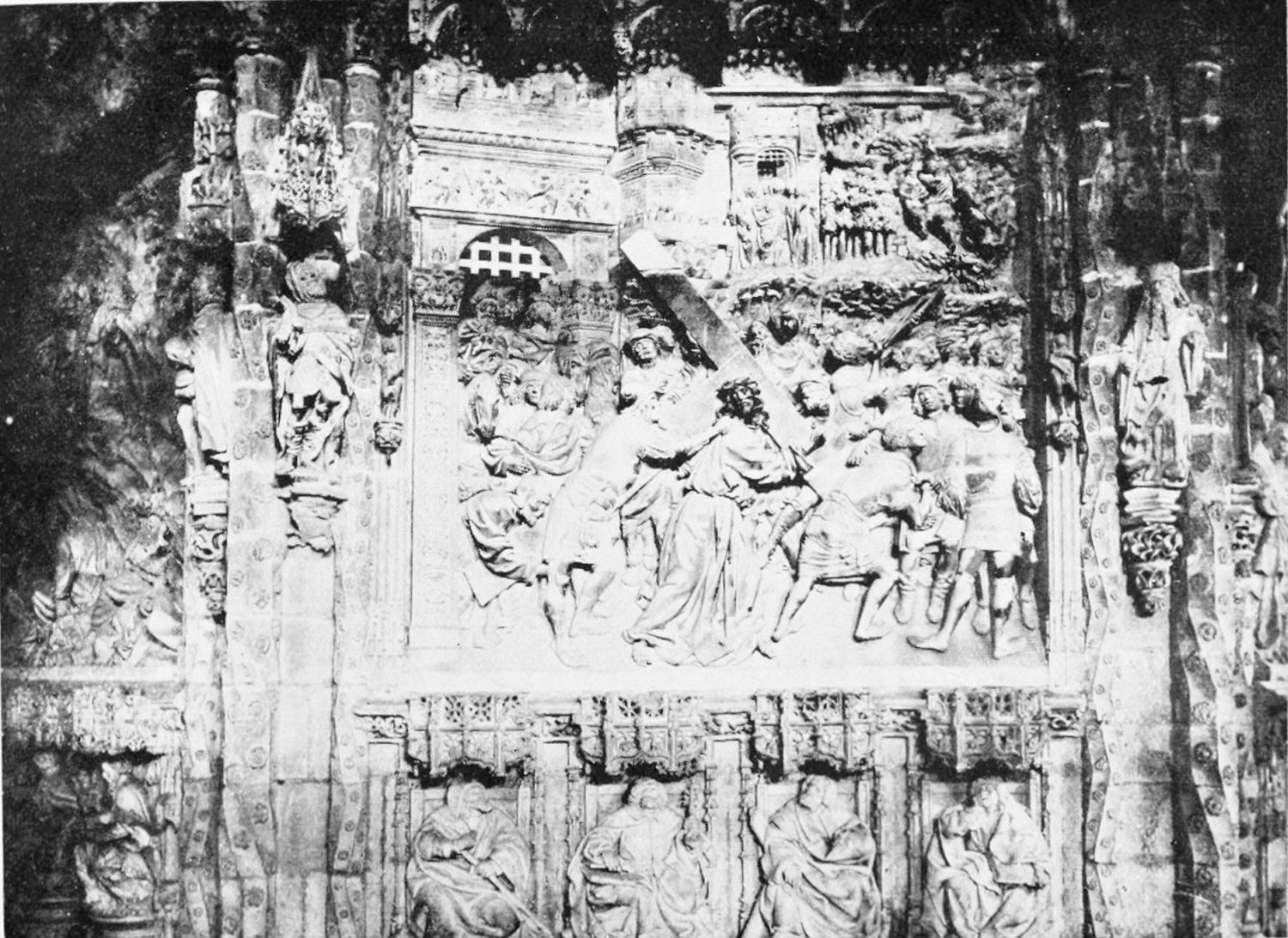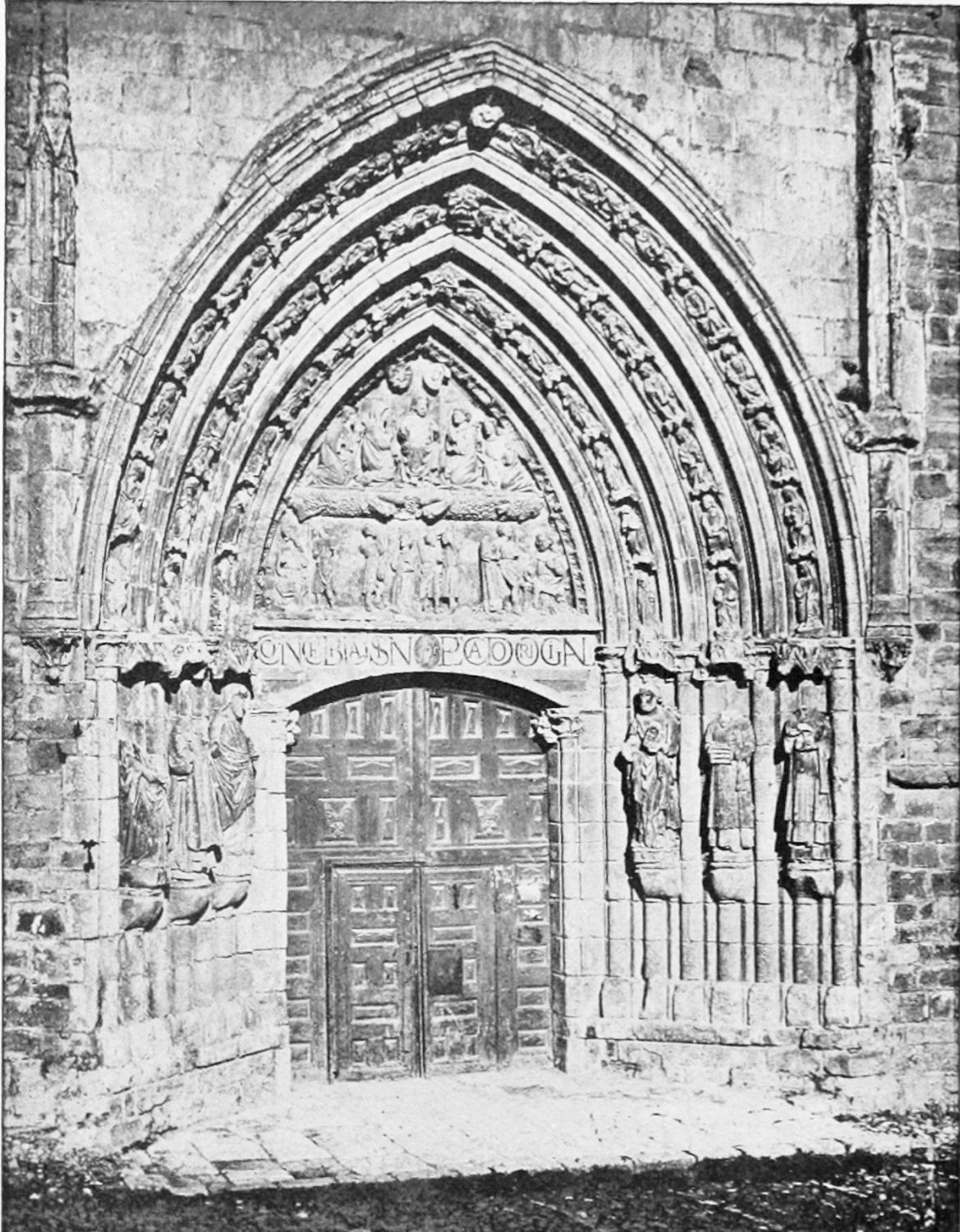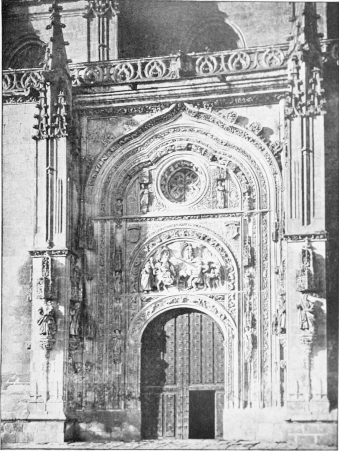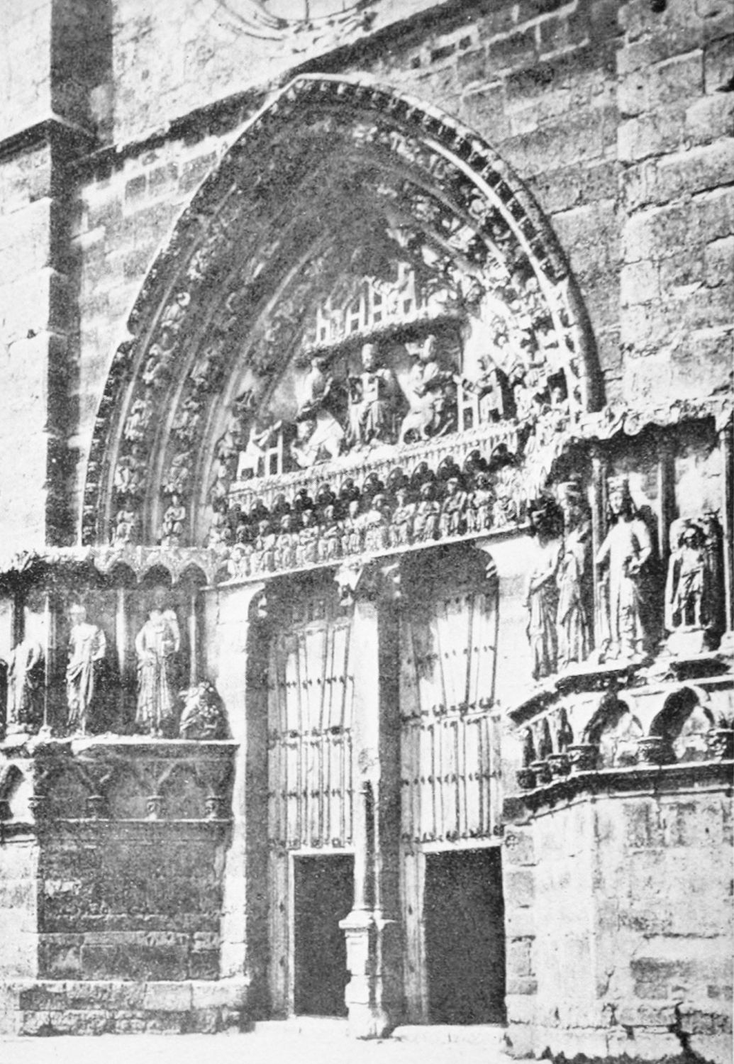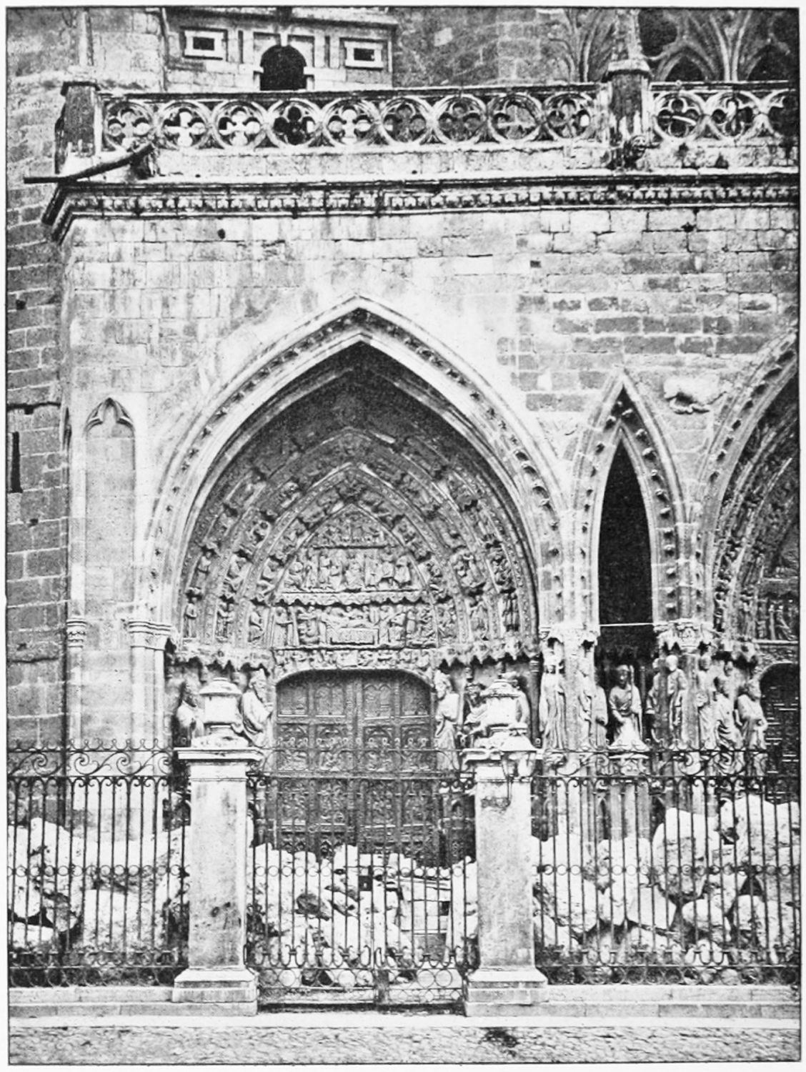 The façade between these steeples is very beautiful. It is surmounted by a pediment with ‘acroteria’ or pedestals to receive statues. Beneath this is a very large wheel-window above a row of windows corresponding to the triforium. The three magnificently sculptured doorways extend from steeple to steeple. The arches are pointed and triple. Byzantine influence is visible in the statuary and foliage. The figures, forty in number, are rather more than life-size, and represent saints and apostles, martyrs and confessors, kings and queens. On the north-west doorway is seen the half-defaced figure of Justice, bearing a sword inscribed with the words ‘Justitia est unicuique dare quod suum est.’ Beneath this{18} portal cases of appeal were tried in the thirteenth century. A small column between this and the central doorway is engraved with the words locus appellationis and the arms of Leon and Castile. The tympanum of the arch is adorned with reliefs, illustrating the earlier episodes in the life of Jesus. The doors themselves show scenes from the Passion and Risen Life.