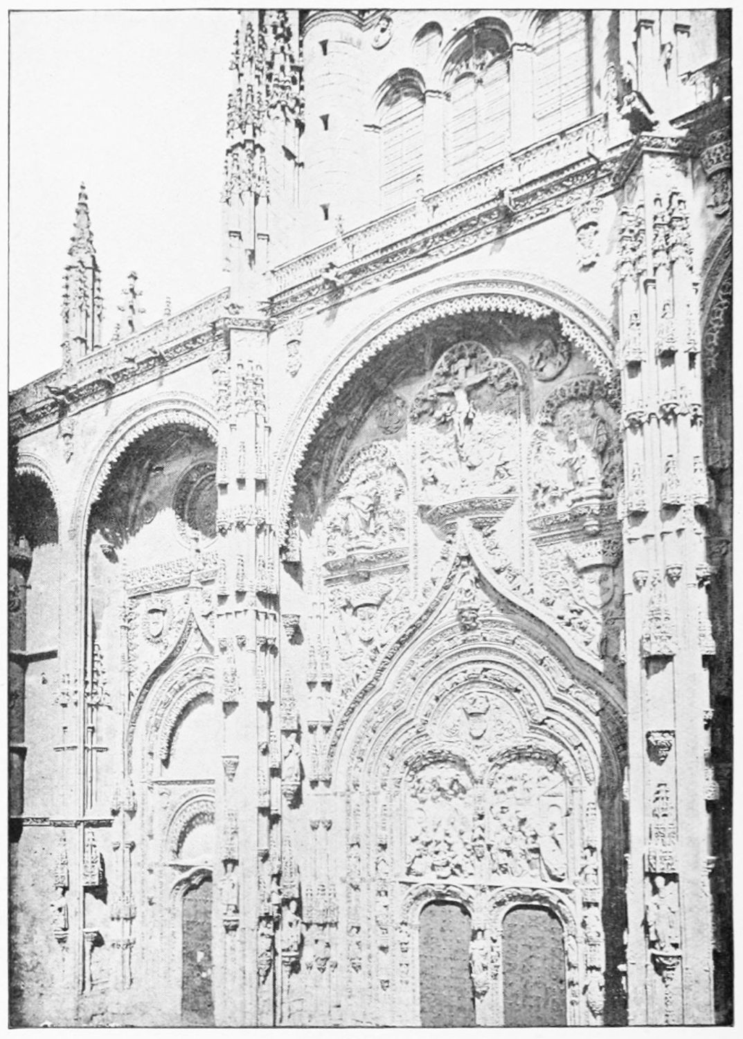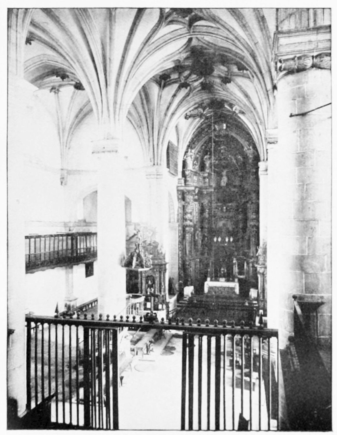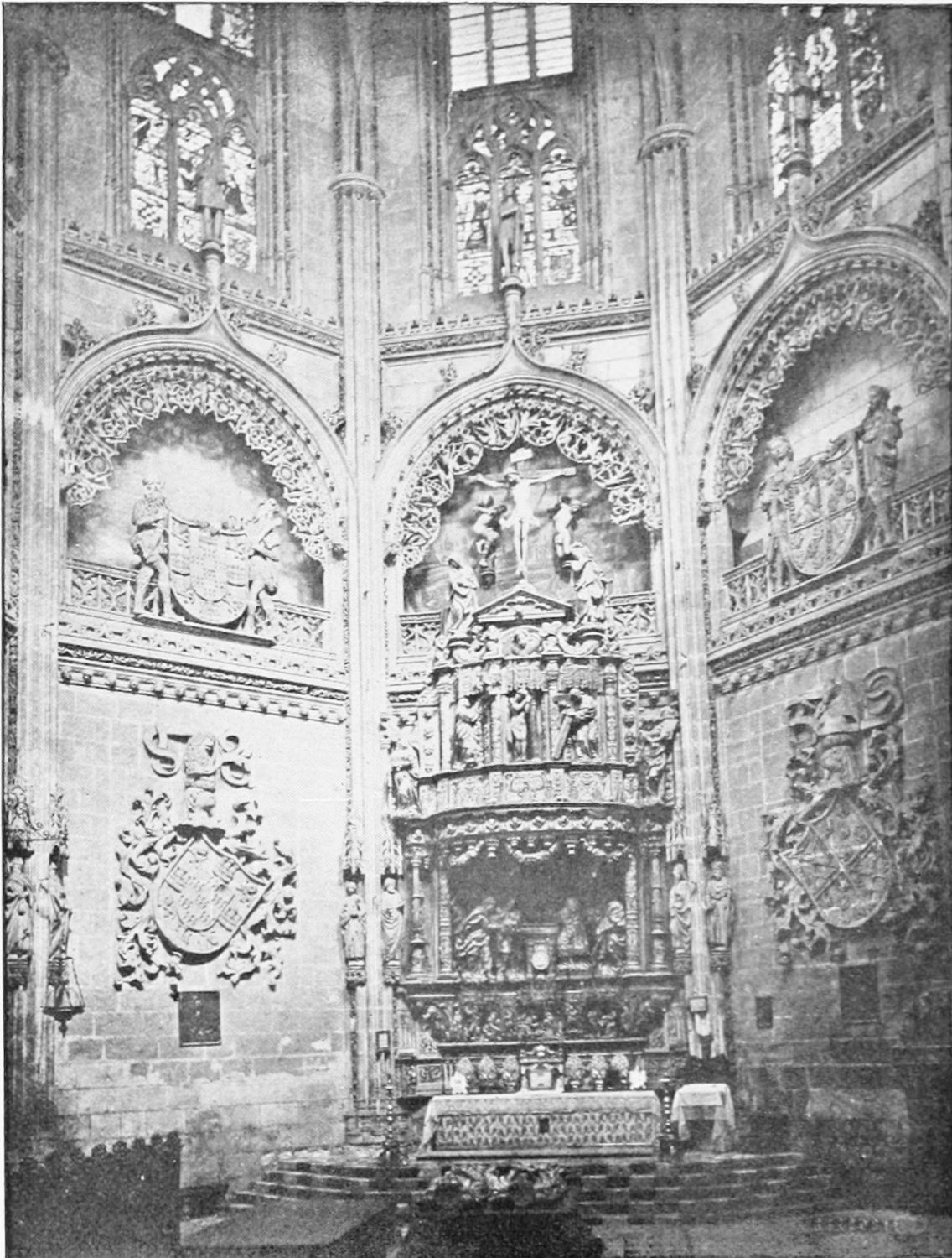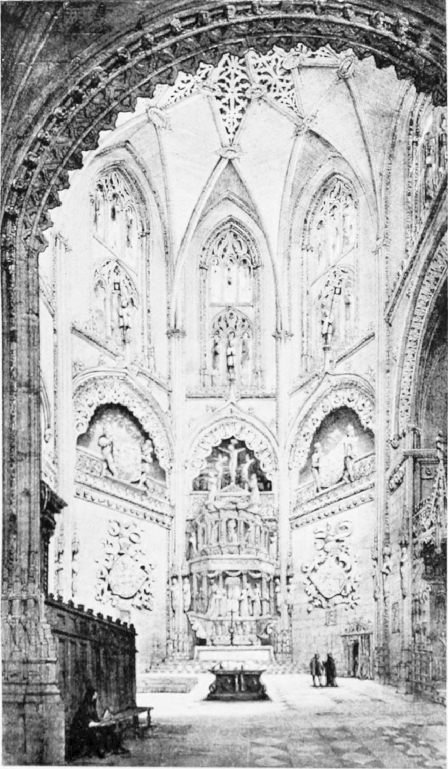 The beauty of this wonderful church consists largely in its lightness. Its supports are so slender, its walls so freely pierced with windows at every stage, its details everywhere so delicate, that the term ‘frozen music’ applied to architecture seems here indeed no mere hyperbole. ‘A mere lantern,’ Street calls the church, and blames the architect for his extreme daring and for his excessive use of windows. Though the vaults had been filled in with very light stone or concrete, the fabric was ever trembling on its fragile foundations. In 1631 the vault above the crossing collapsed, and was replaced by a dome. A hundred years later many of the arches of the aisles succumbed. Meanwhile Renaissance and Churrigueresque additions were made; but the whole was restored between the years 1850 and 1901, and now the cathedral exists in almost pristine symmetry and airiness.