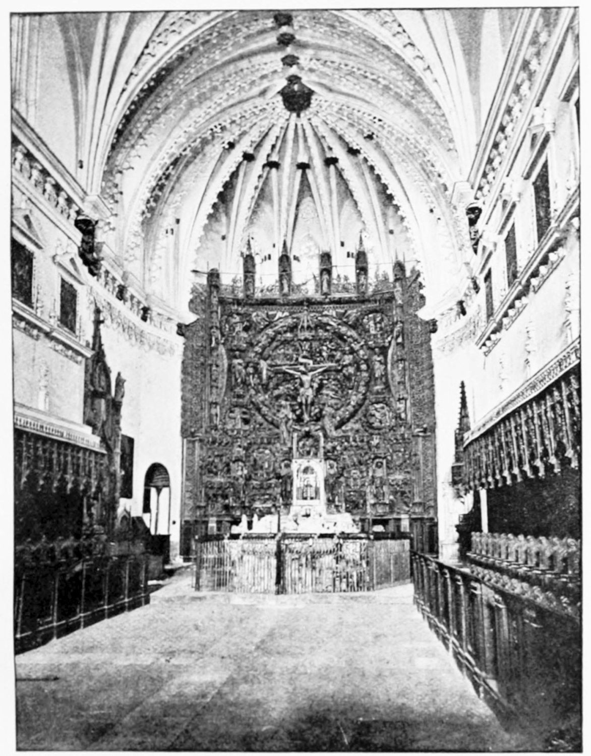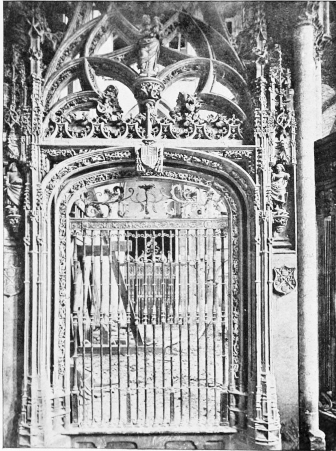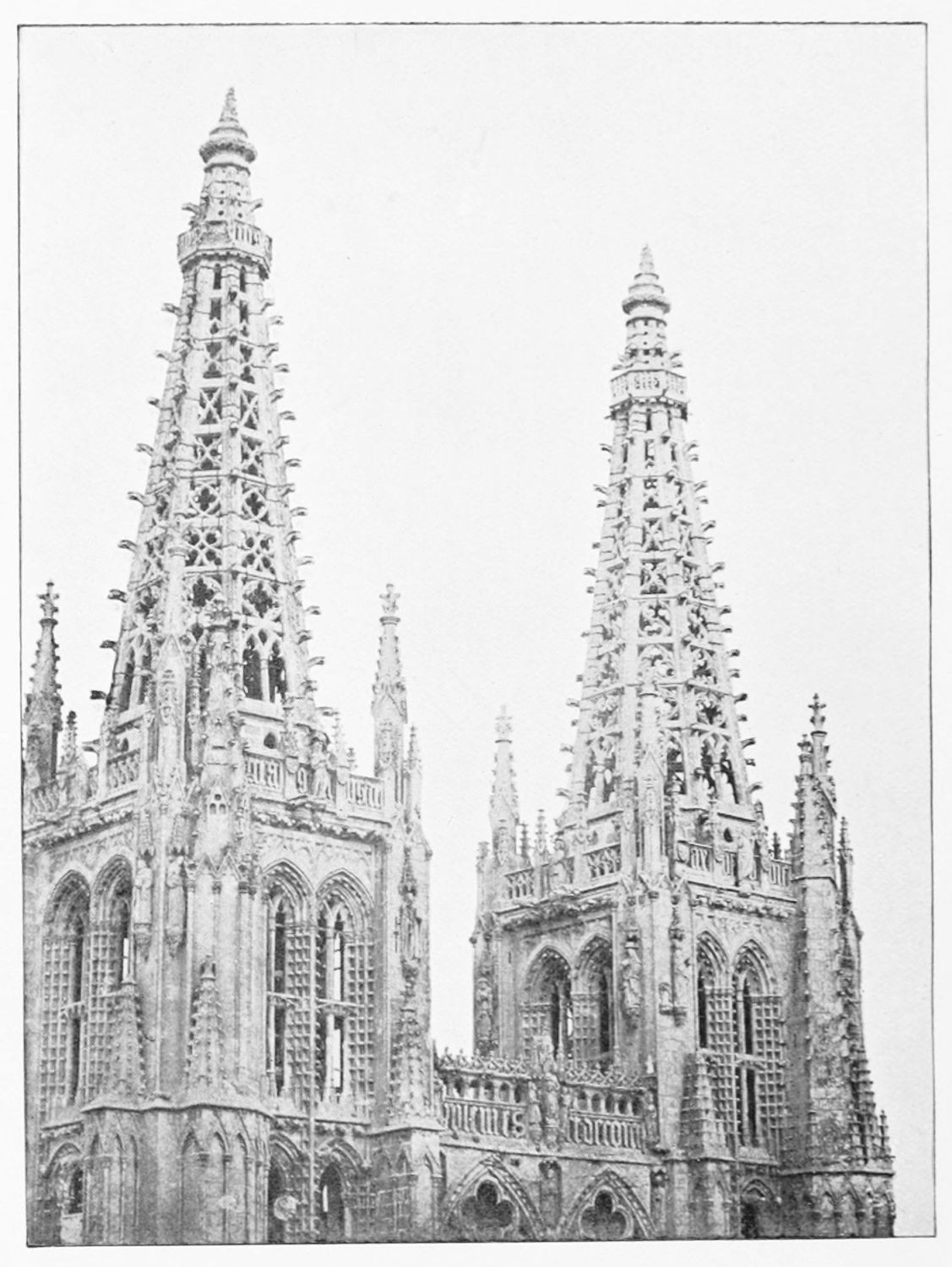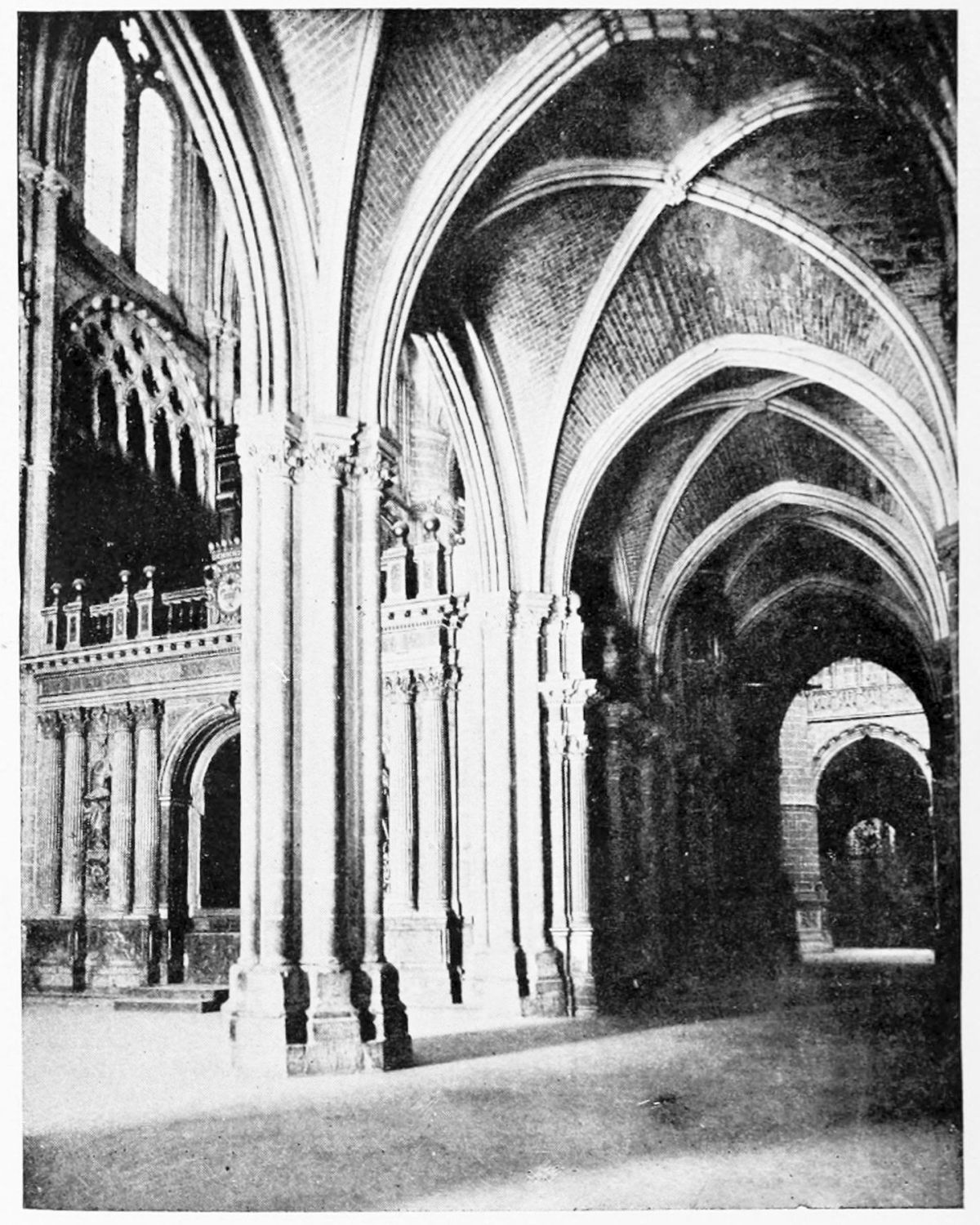 The beauty of this wonderful church consists largely in its lightness. Its supports are so slender, its walls so freely pierced with windows at every stage, its details everywhere so delicate, that the term ‘frozen music’ applied to architecture seems here indeed no mere hyperbole. ‘A mere lantern,’ Street calls the church, and blames the architect for his extreme daring and for his excessive use of windows. Though the vaults had been filled in with very light stone or concrete, the fabric was ever trembling on its fragile foundations. In 1631 the vault above the crossing collapsed, and was replaced by a dome. A hundred years later many of the arches of the aisles succumbed. Meanwhile Renaissance and Churrigueresque additions were made; but the whole was restored between the years 1850 and 1901, and now the cathedral exists in almost pristine symmetry and airiness.