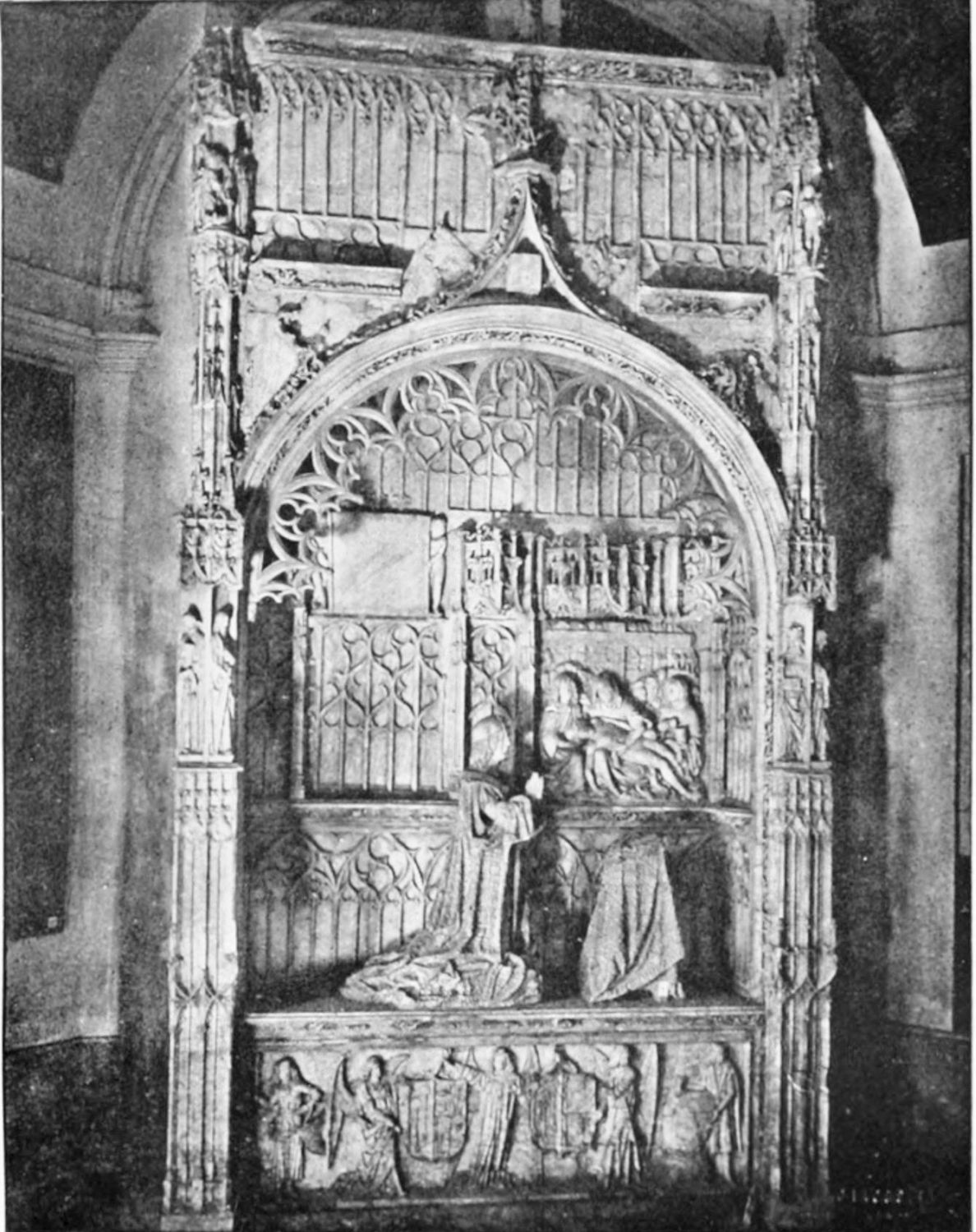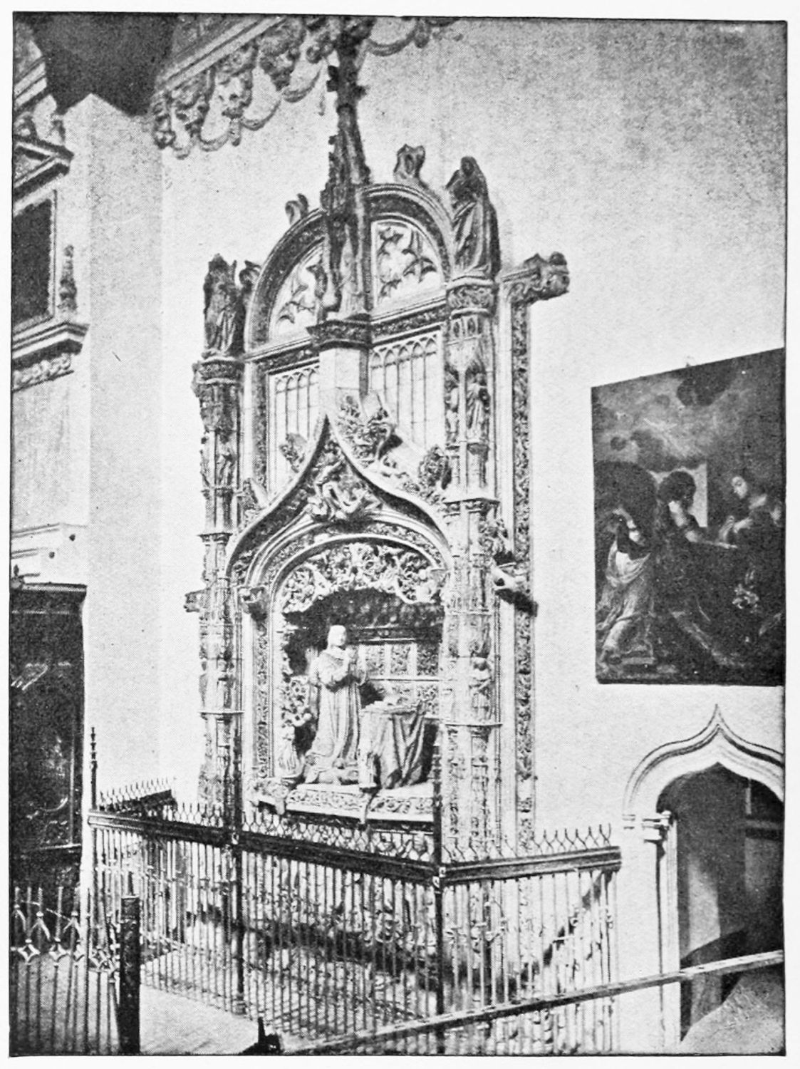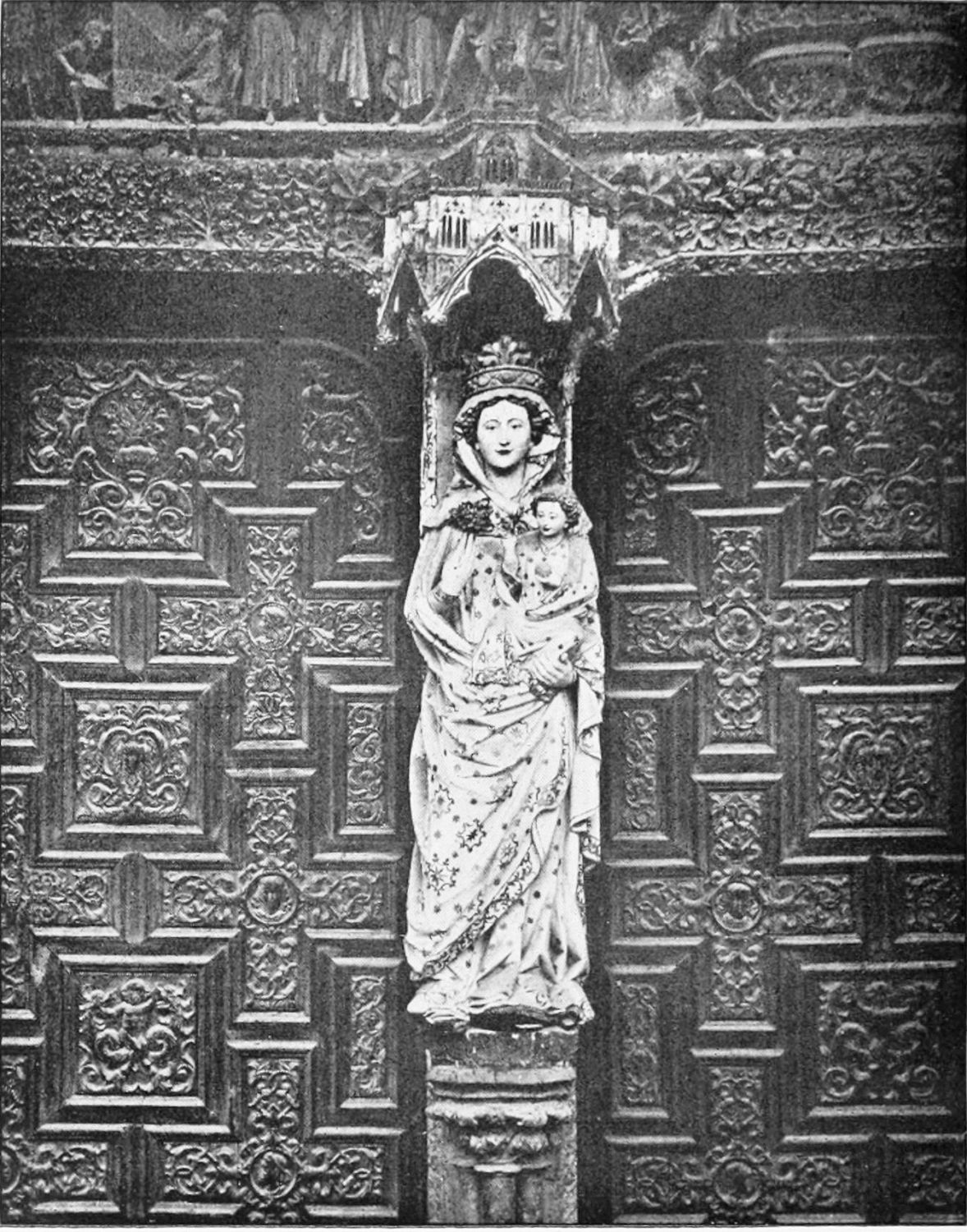 The spacious cloister, which conceals the northern façade of the cathedral, was built in the early fourteenth century, but it has been rebuilt, restored, and altered into what Street calls ‘a very poor and weak kind of Renaissance.’ The ornamentation is profuse and not in bad taste. The inner walls have not been much altered, and the pillars supporting them are sculptured in the Gothic style. The bays are painted with an extremely valuable and interesting series of frescoes, so well drawn that they were more likely the work of some fifteenth-century Italian artist than productions of native talent. The subjects are all from the history of Christ and Mary, the Crucifixion curiously enough being omitted. When Street saw these paintings forty years ago, he spoke of the colours{24} as pure and good, but they have now been almost entirely obliterated by the damp. The cloister contains several sepulchral monuments, some mere slabs, but one—that of the Canon Juan de Grajal (1447)—elaborately and artistically sculptured. Some colossal idiot has cut off the heads of the angels shown in this fine piece of work. Near the beautiful Gothic entrance to the cloister is an image of our Lady of Regla, to which at one time the people used to proceed in procession to return thanks for the mythical victory of Clavijo, a choir of damsels representing the equally mythical tribute of one hundred virgins said to have been paid by Mauregato to the Moors.