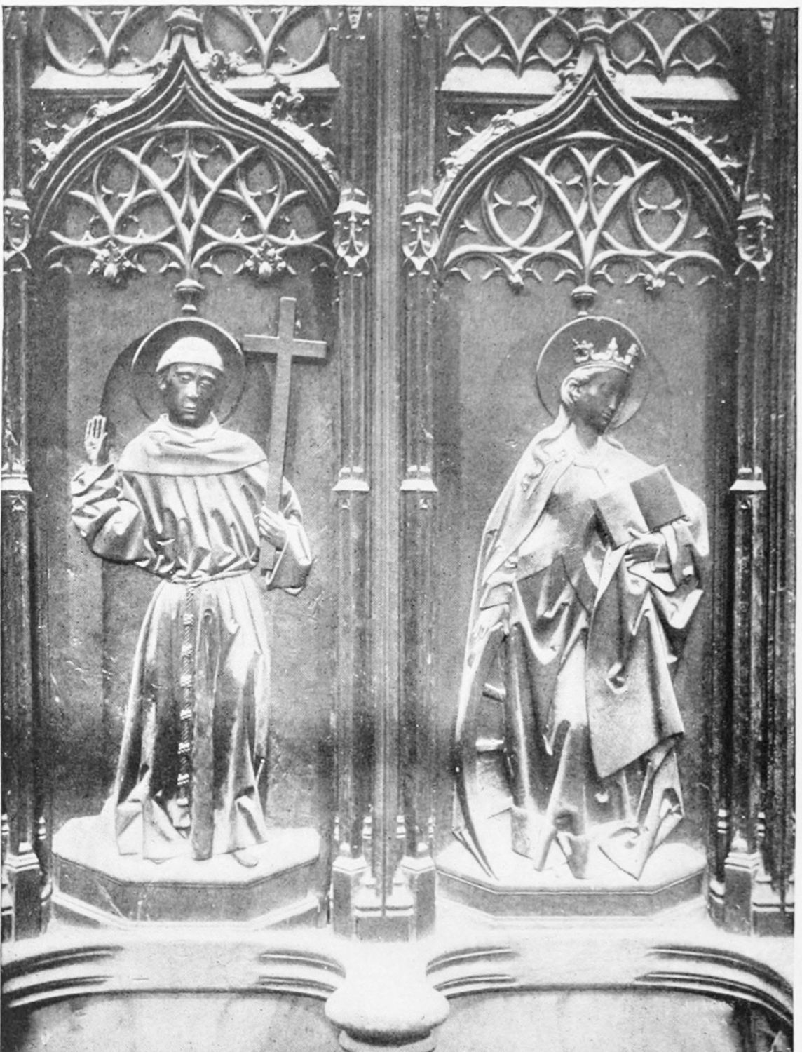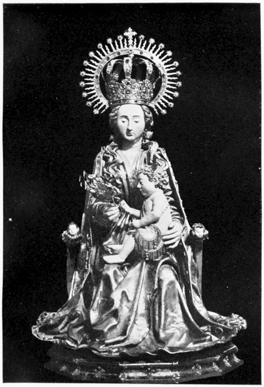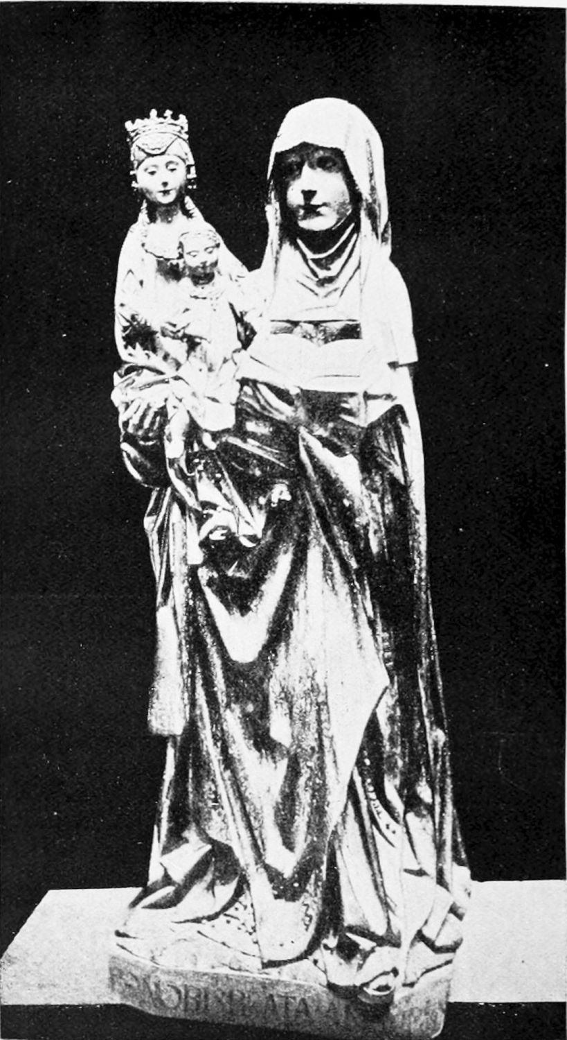 The spacious cloister, which conceals the northern façade of the cathedral, was built in the early fourteenth century, but it has been rebuilt, restored, and altered into what Street calls ‘a very poor and weak kind of Renaissance.’ The ornamentation is profuse and not in bad taste. The inner walls have not been much altered, and the pillars supporting them are sculptured in the Gothic style. The bays are painted with an extremely valuable and interesting series of frescoes, so well drawn that they were more likely the work of some fifteenth-century Italian artist than productions of native talent. The subjects are all from the history of Christ and Mary, the Crucifixion curiously enough being omitted. When Street saw these paintings forty years ago, he spoke of the colours{24} as pure and good, but they have now been almost entirely obliterated by the damp. The cloister contains several sepulchral monuments, some mere slabs, but one—that of the Canon Juan de Grajal (1447)—elaborately and artistically sculptured. Some colossal idiot has cut off the heads of the angels shown in this fine piece of work. Near the beautiful Gothic entrance to the cloister is an image of our Lady of Regla, to which at one time the people used to proceed in procession to return thanks for the mythical victory of Clavijo, a choir of damsels representing the equally mythical tribute of one hundred virgins said to have been paid by Mauregato to the Moors.
