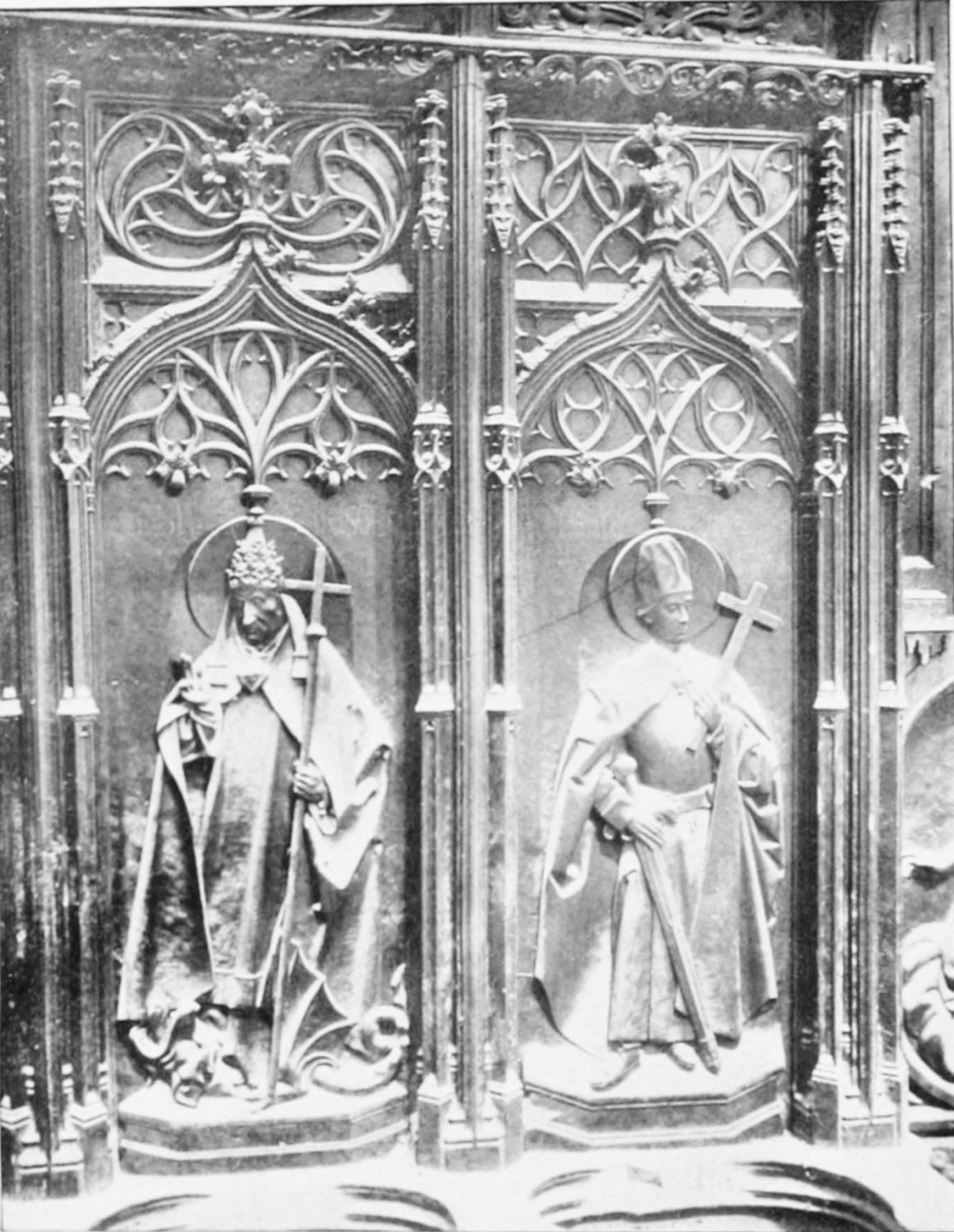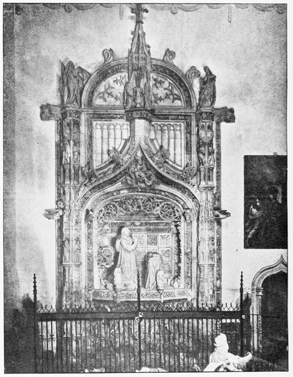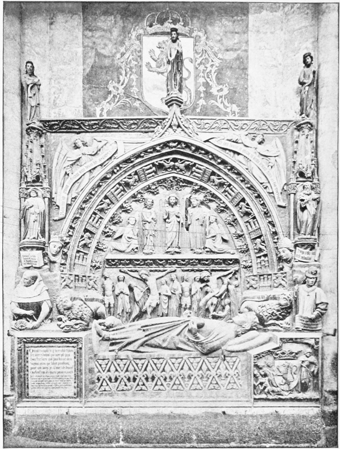 But after the general ensemble and the stained glass, nothing in the cathedral merits as much attention as the tombs and monuments. Of these the noblest is the cenotaph of Ordoño II. at the rear of the High Altar, erected five centuries after his death as a tribute of gratitude by the citizens of Leon. Though in the florid Gothic style of the fifteenth century, many of the figures and inscriptions appear to have been copied from an earlier tomb. The recumbent effigy of the{21} king is large and dignified; his face is sharp and smooth-shaven; he wears his crown and the royal robes, and carries the orb and sceptre. At his feet lies a dog, the emblem of fidelity, beneath which is an inscription in Latin setting forth his deeds and virtues, and erroneously attributing to him the erection of the present temple. The monumental arch above encloses sculpture painted in brilliant colours on a gilt ground, which appears to be of an earlier elate than the rest of the monument. The arches of the wall of the Capilla Mayor have been bricked up, and those on each side of this monument are adorned with two very ancient distemper paintings of the Ecce Homo and Entombment. They exhibit some interesting peculiarities of dress and detail, and though the central figure is badly done, the spectators are lifelike and vigorously represented.