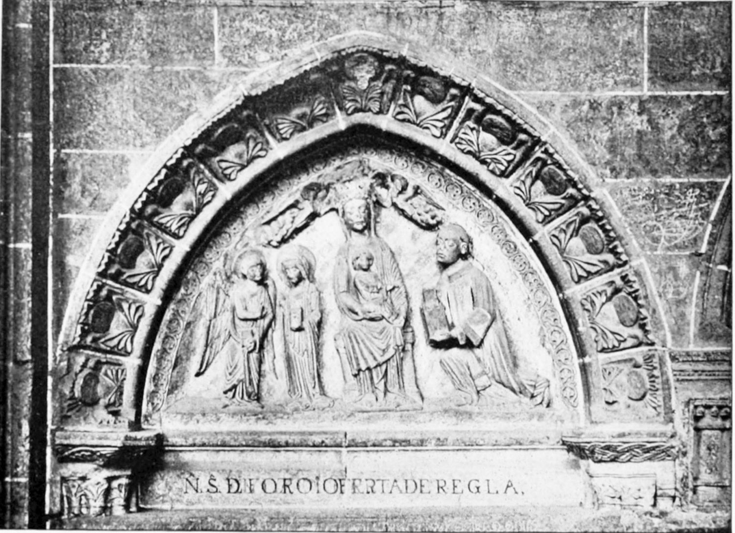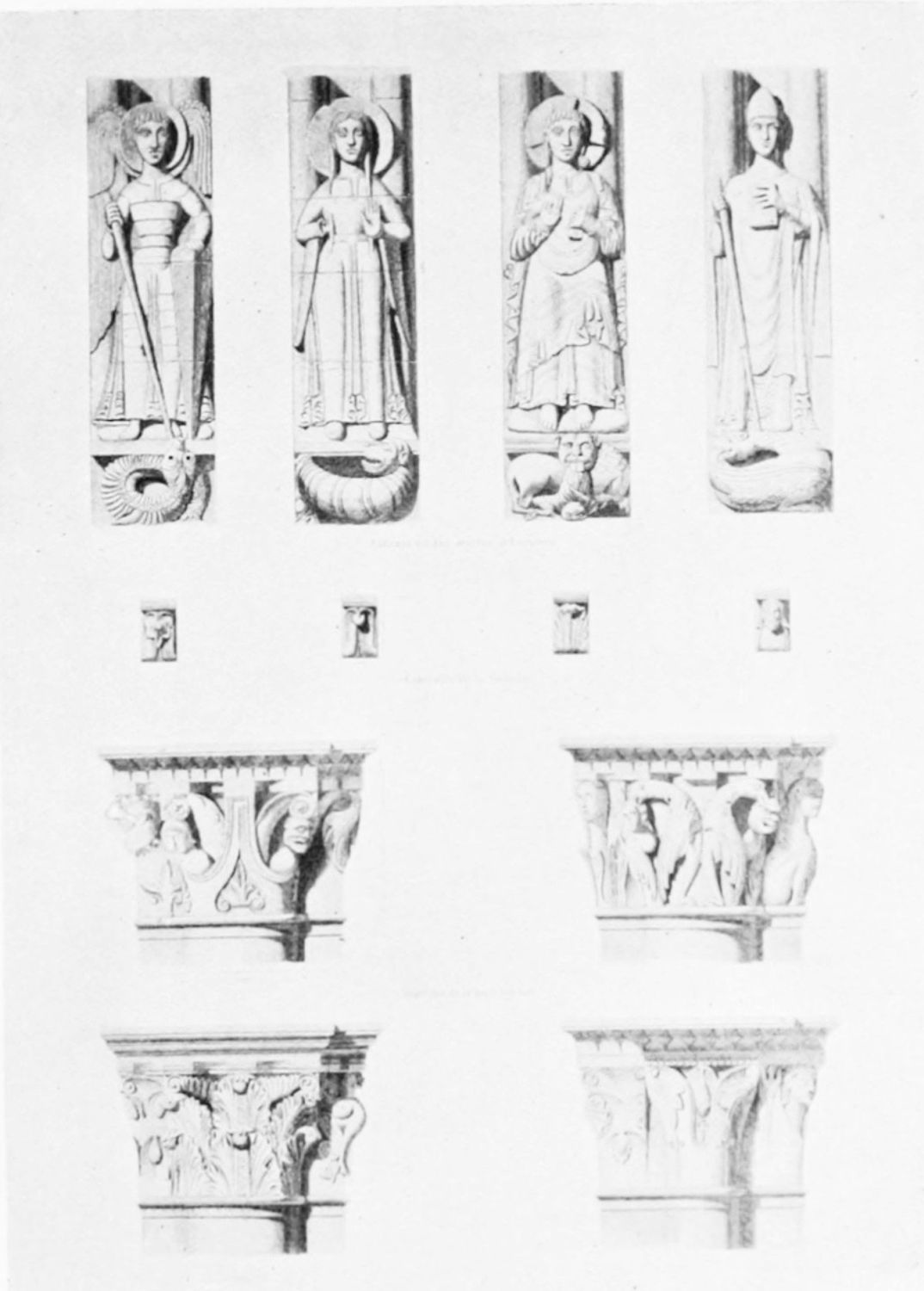 The entrance to the south transept has been entirely rebuilt, but the original reliefs and{19} statuary of the three doors have been preserved and re-erected. Some old Byzantine capitals may be distinguished among the Gothic work. The south-west door is relieved with a diaper of fleurs-de-lys and castles, and lions and castles. The sculpture of the tympanum is equal to that of the west front, and shows the Saviour and the Evangelists, the twelve Apostles, and the Death of the Blessed Virgin. The colossal statue on the central shaft is that of San Froilan, an early bishop of Leon. Above is a row of four windows of two lights, and an enormous rose-window.
