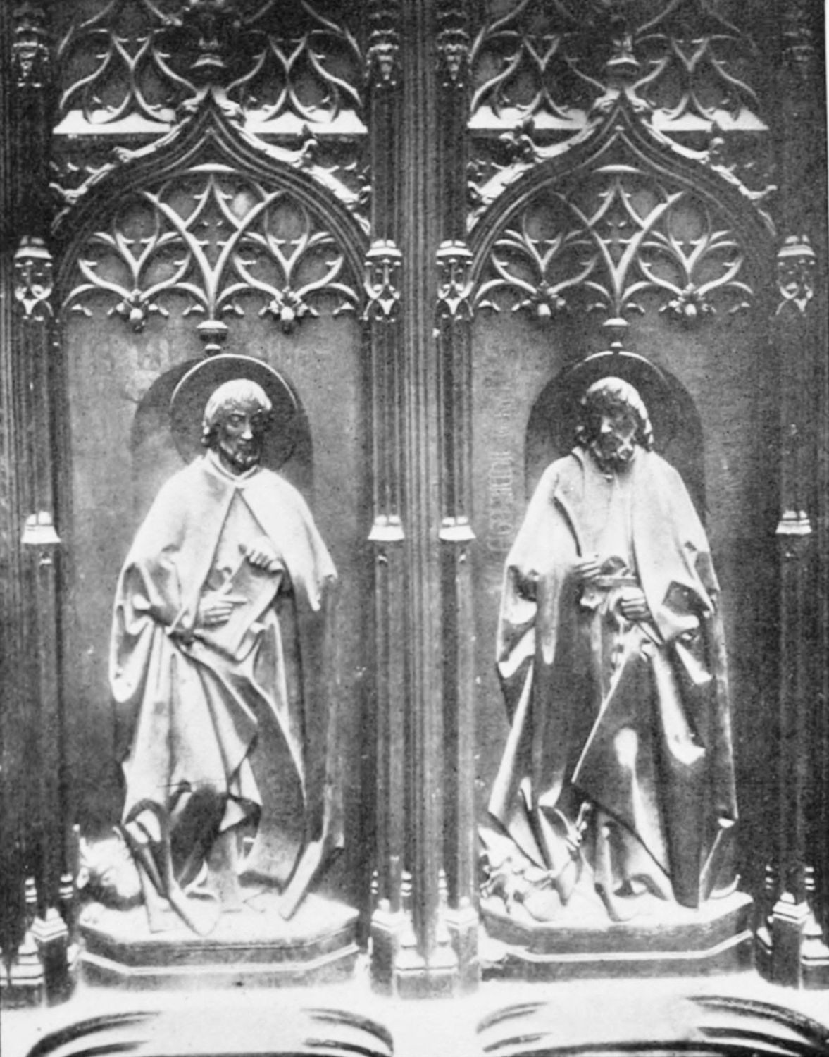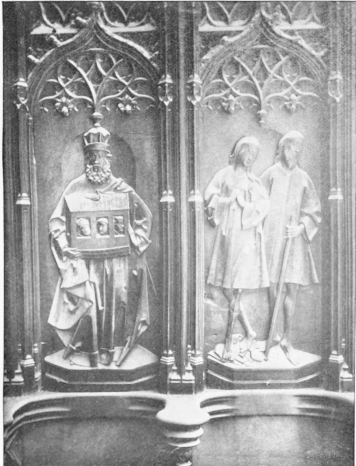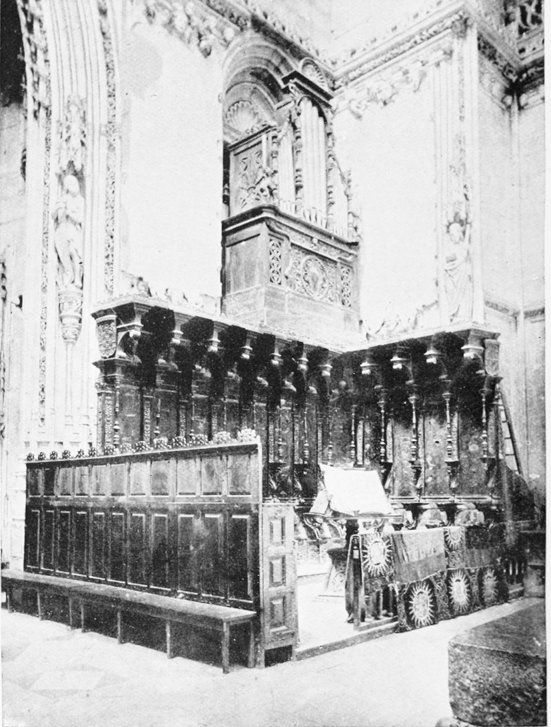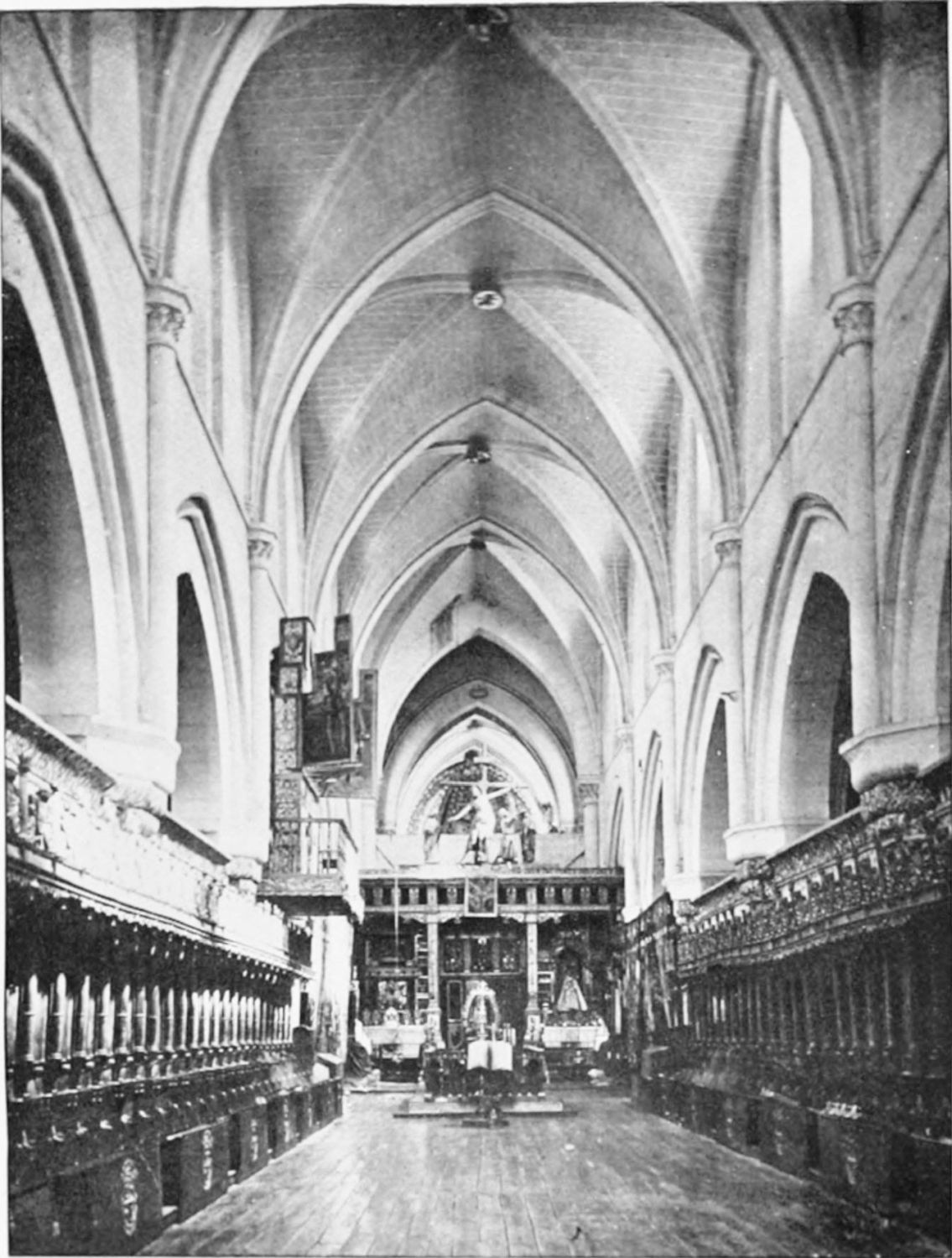The church is large and cruciform, with some good glass, windows with plateresque traceries, and fine arabesques. The most notable accessories are the choir stalls, the upper row exhibiting admirably carved busts of New Testament worthies; the lower row, of the saints of the Old Dispensation. Grotesque and capricious masks, centaurs, griffins, and so forth, are introduced in great profusion into the decoration; they were the work, for the most part, of one Doncel in 1542, and were mutilated by a pupil of Churri{27}guera in the early part of the eighteenth century.