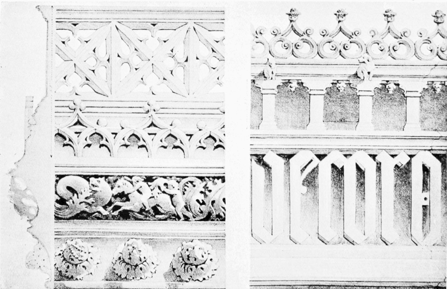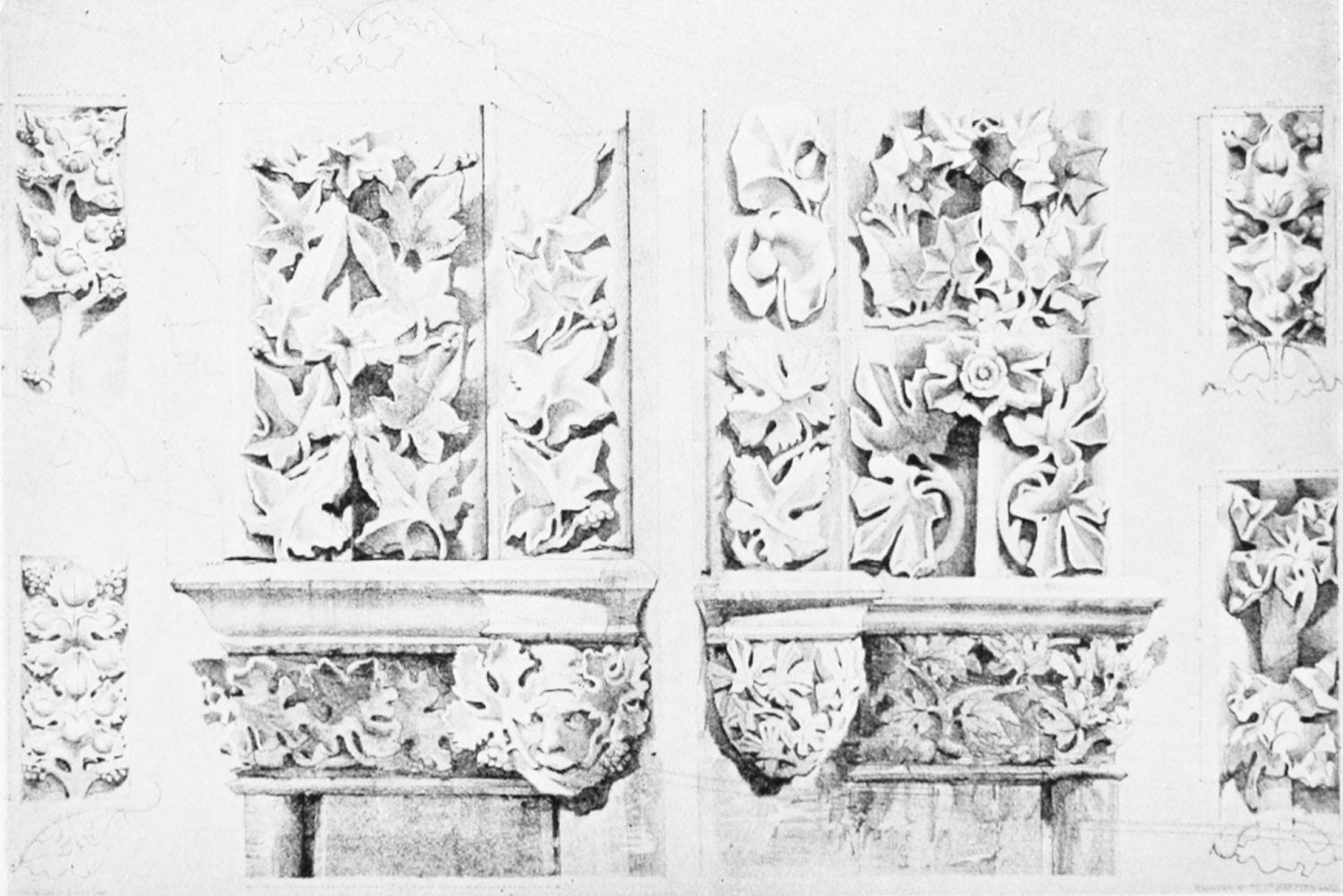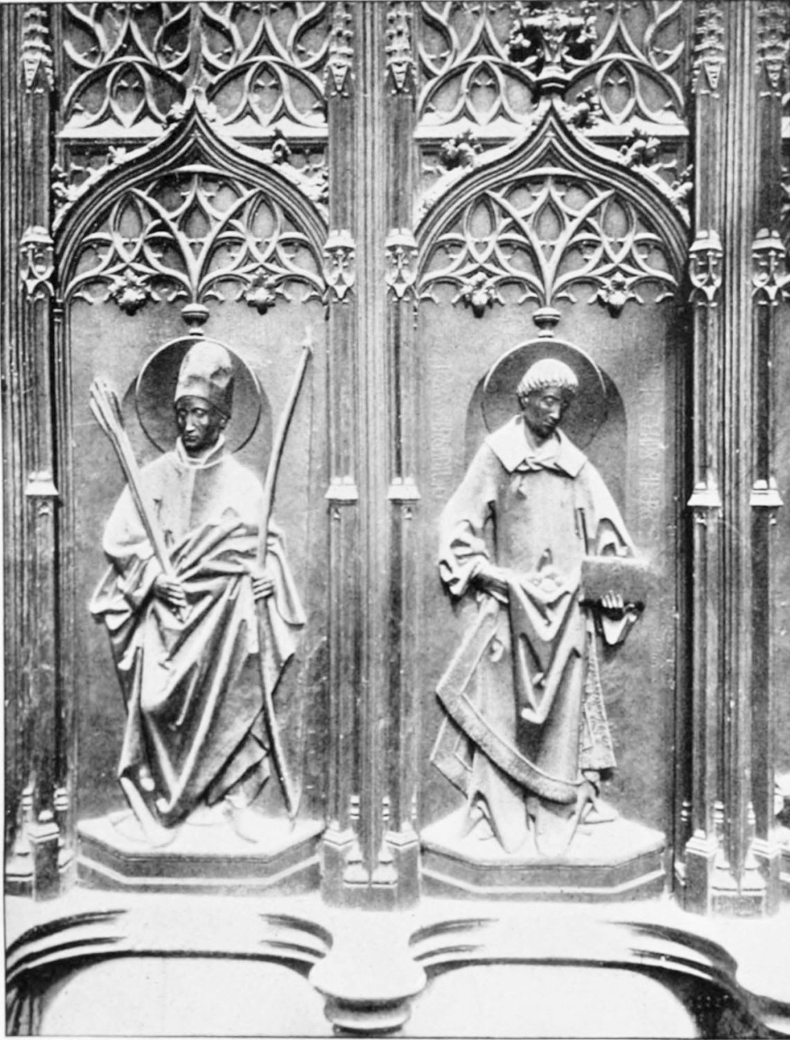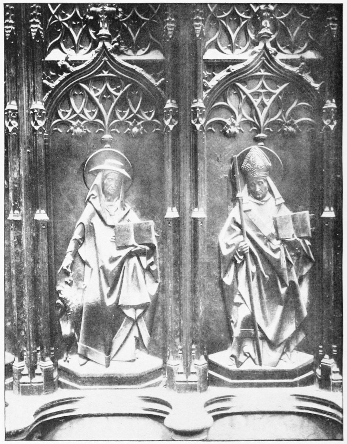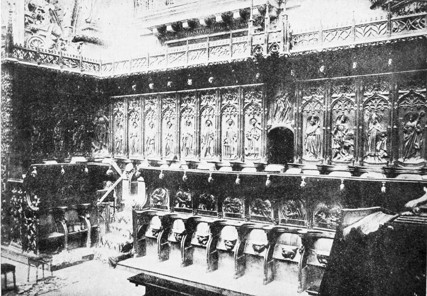 The church is large and cruciform, with some good glass, windows with plateresque traceries, and fine arabesques. The most notable accessories are the choir stalls, the upper row exhibiting admirably carved busts of New Testament worthies; the lower row, of the saints of the Old Dispensation. Grotesque and capricious masks, centaurs, griffins, and so forth, are introduced in great profusion into the decoration; they were the work, for the most part, of one Doncel in 1542, and were mutilated by a pupil of Churri{27}guera in the early part of the eighteenth century.