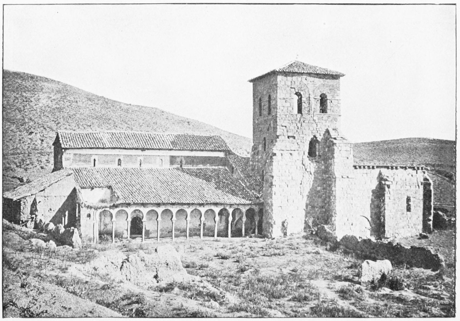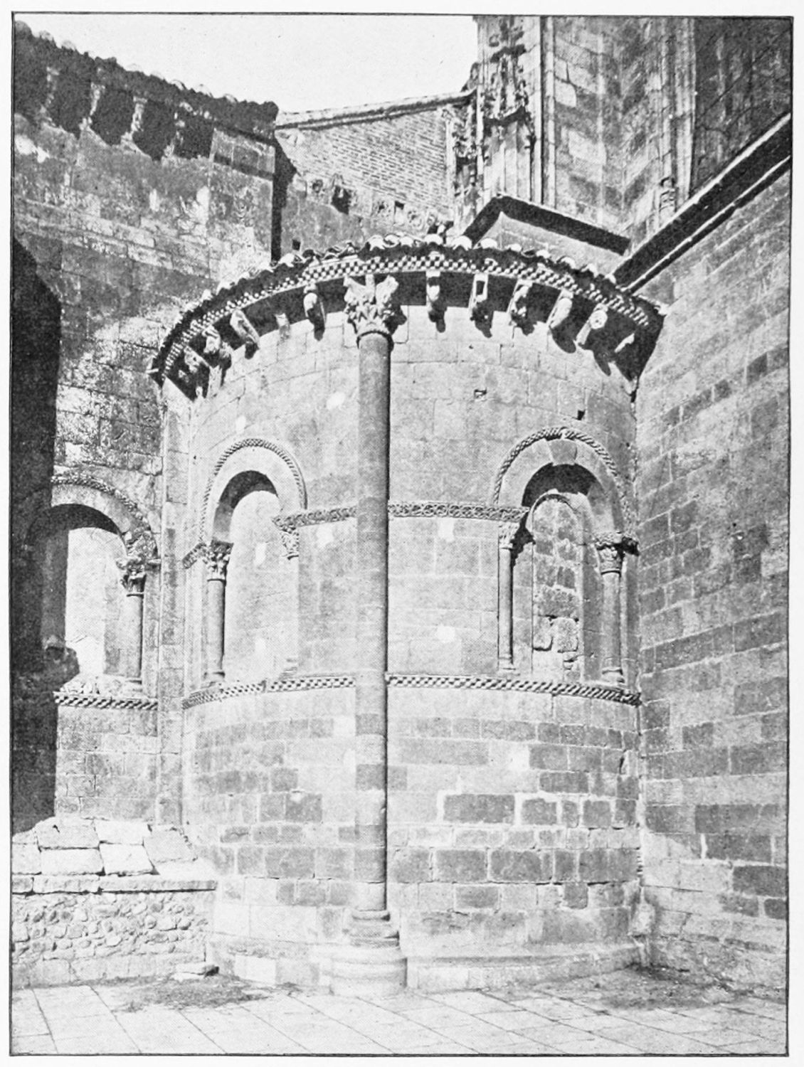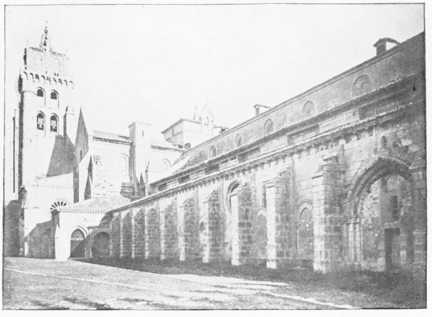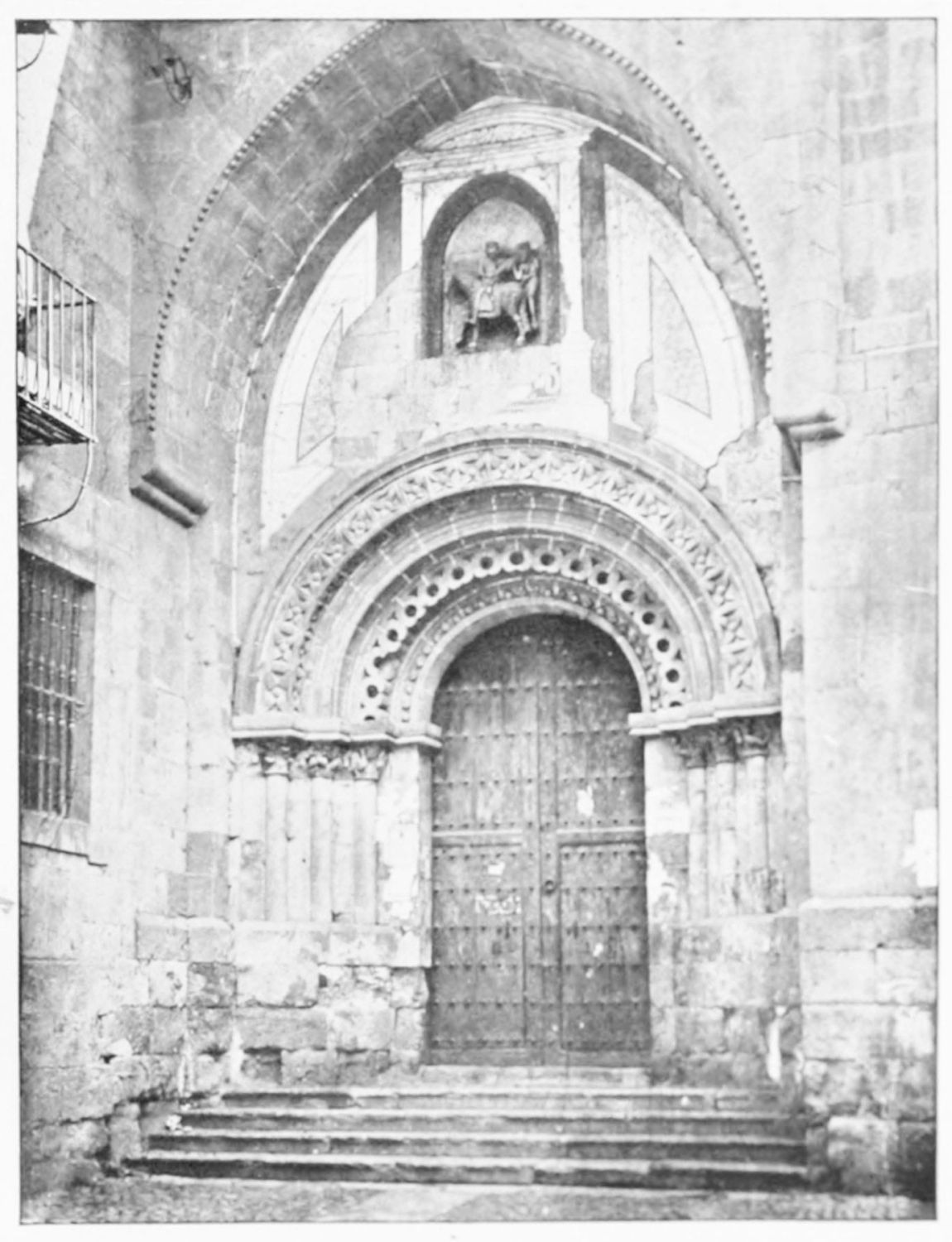 The modern church of San Marcelo, which{31} gives its name to the square, was founded by Ramiro I. in the ninth century, and was liberally endowed in after years by Alfonso VI. Marcelus is a reputed local martyr, a Roman legionary who refused to adore the divinity of Cæsar, and was beheaded, having blessed his executioners. By another account the martyrdom took place at Tangier, whence, at all events, the saint’s relics were brought here in 1493. The tympanum of a thirteenth-century doorway in the wall at the back of the church is all that remains of the original fabric. A deserted esplanade beyond the walls, to the south-west of the city, marks the site of the once famous shrine of San Claudio, erected first in Constantine’s day on the place of martyrdom of Claudius, Lupercius, and Victoricus. Al Mansûr is said to have been struck with sudden panic when about to attack this church. Successive fanes of great magnificence rose over the spot, the last being destroyed by fire in the sixteenth century.