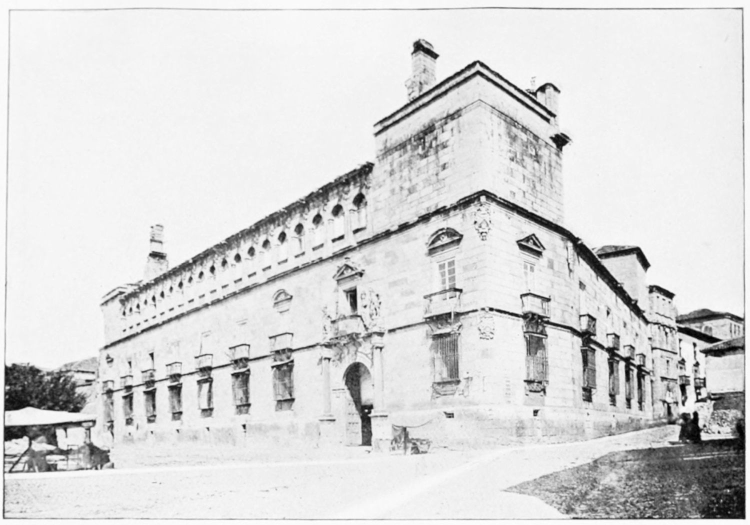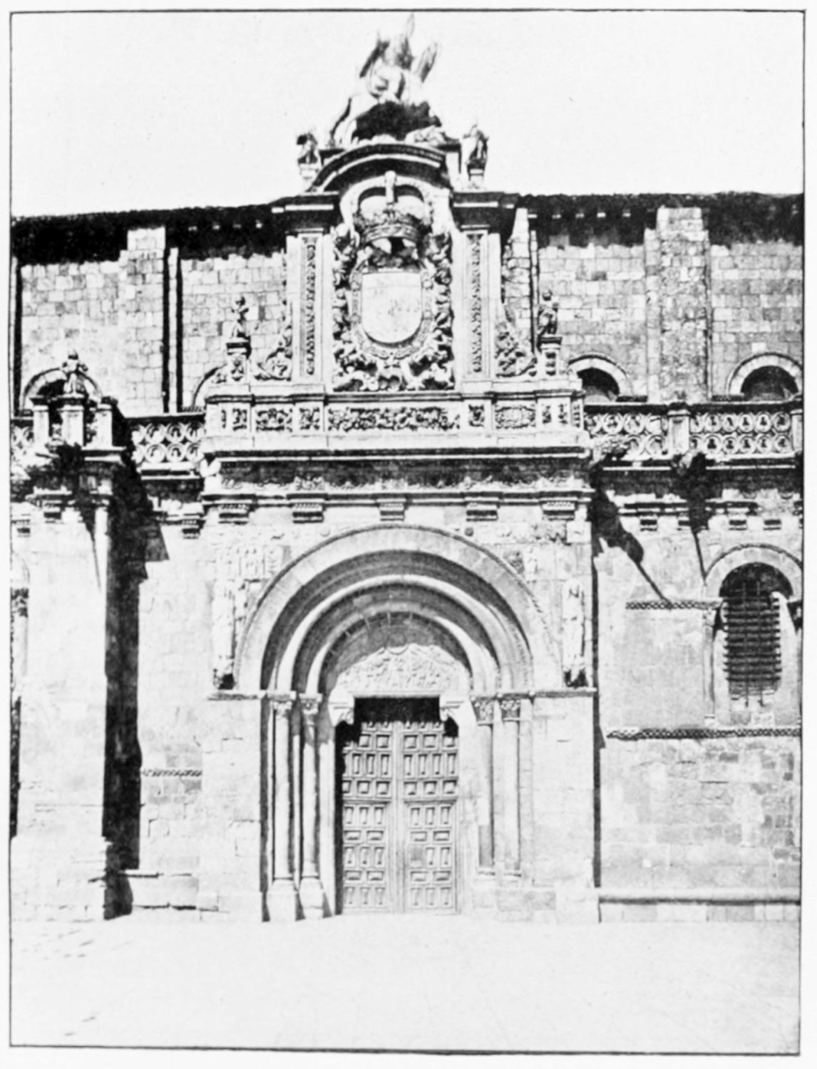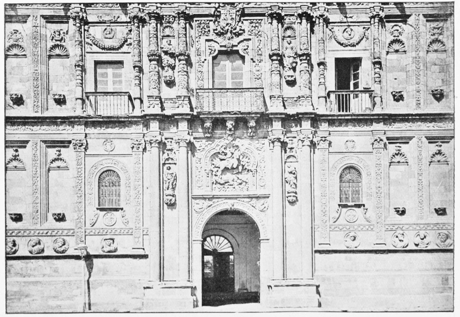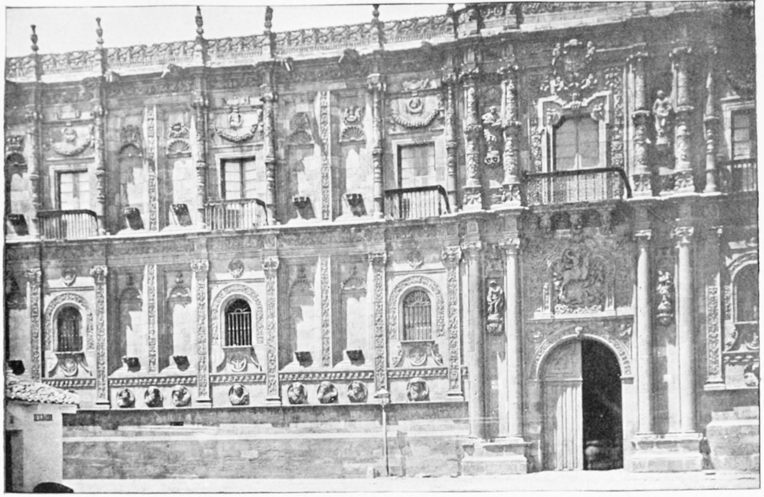 The grand façade of the old convent, extending to the river bank, is divided into two stories, the lower characterised by semicircular windows between pilasters in the plateresque style, and separated by niches; the upper by rectangular windows with balconies, disposed between columns, and likewise separated by niches in pairs. The frieze beneath the lower row of windows is adorned by a series of medallions, displaying the heads of mythological and historical worthies, Gentiles and Christians, ancients and moderns, most oddly assorted. With Priam and Hector, Hannibal and Cæsar, we find Charlemagne and the Cid, Charles V. and Philip II., with Lucretia, Judith and Isabel the Catholic. The busts to the left of the doorway are those of the grand masters of the Order of Santiago. The{29} doorway itself is a very unhappy combination of the plateresque and baroque styles, but the statue of Fame surmounting it is not devoid of grace and dignity. The balconies and windows facing the river date from the eighteenth century.