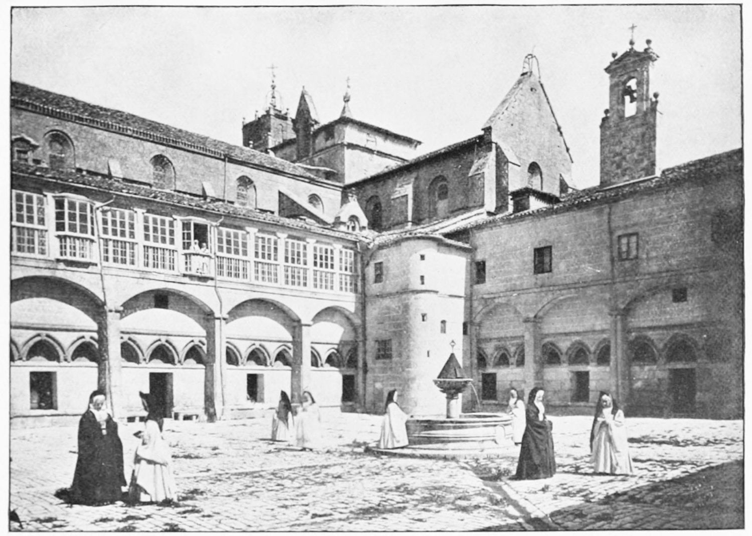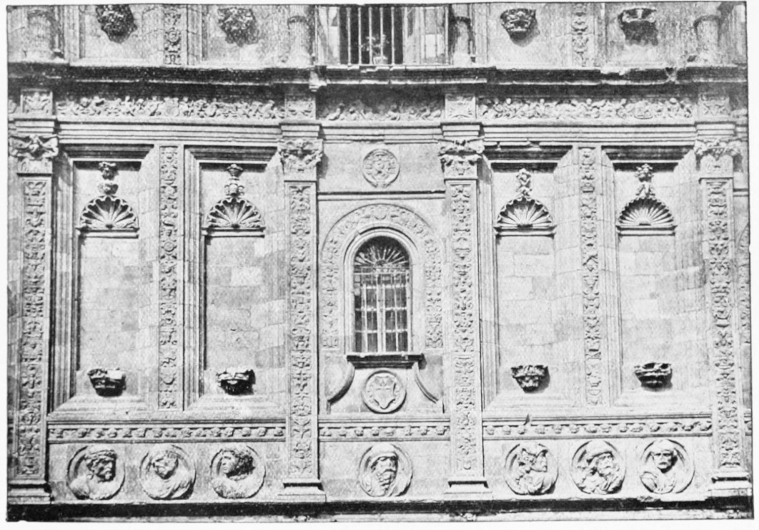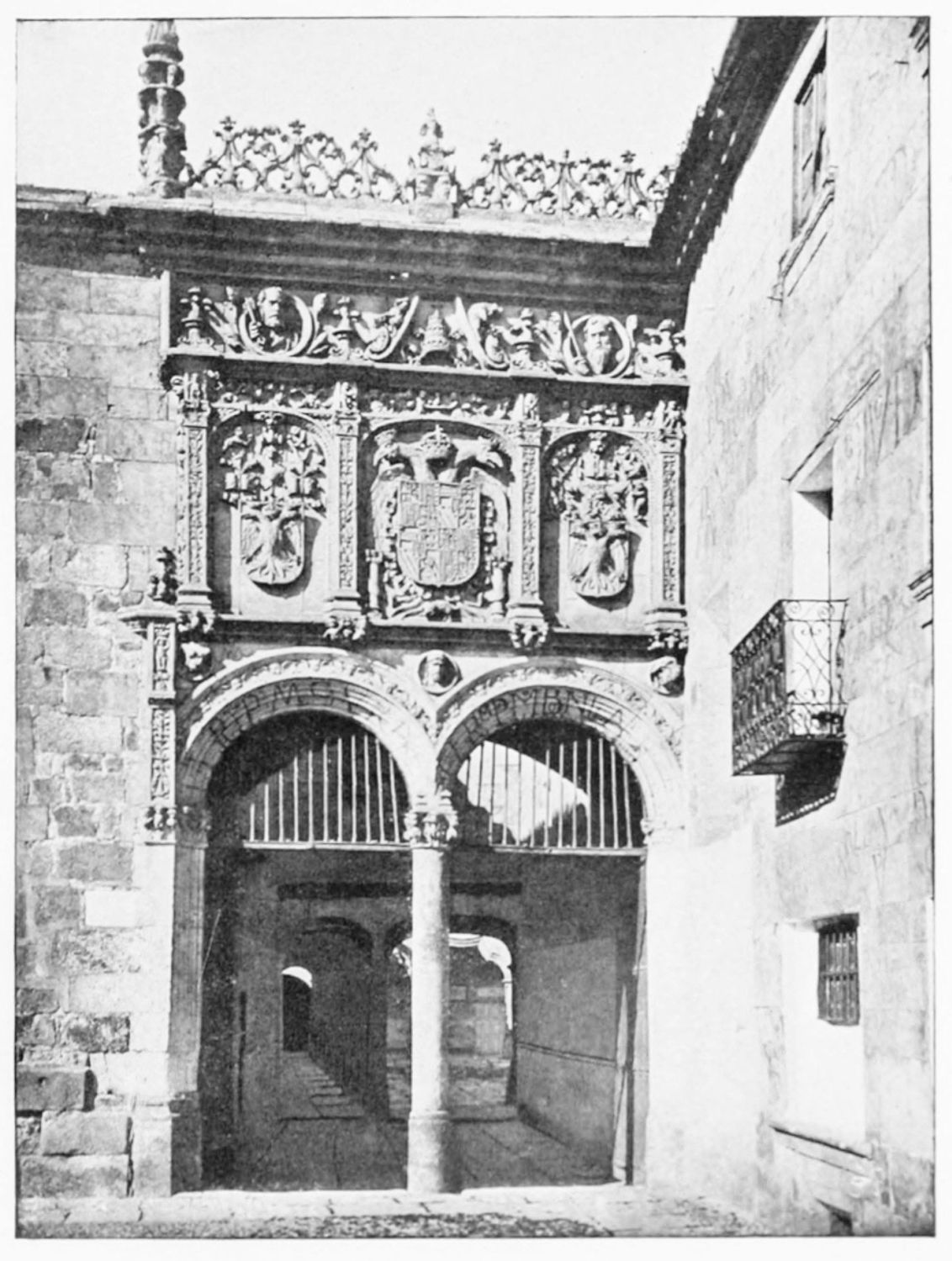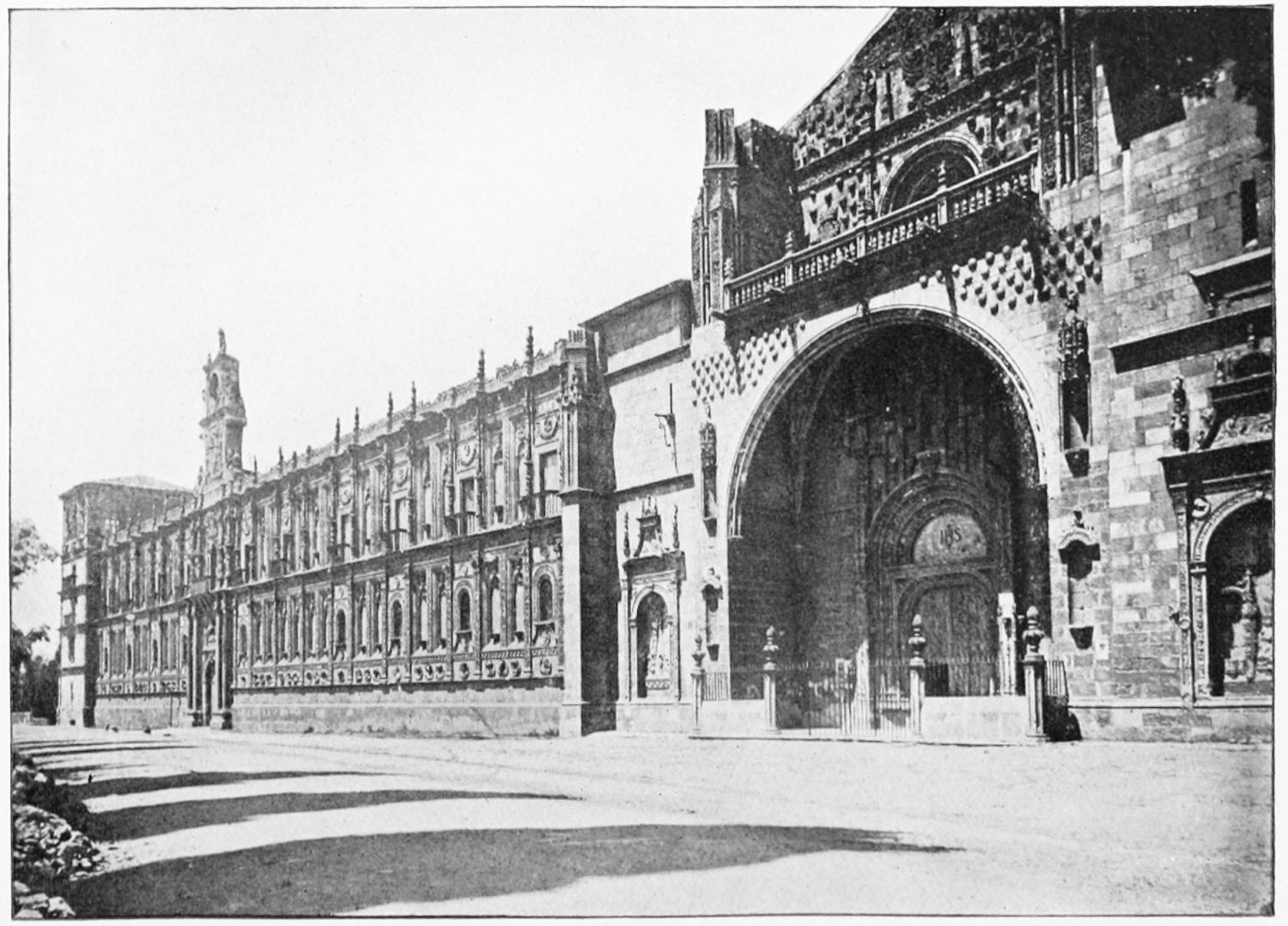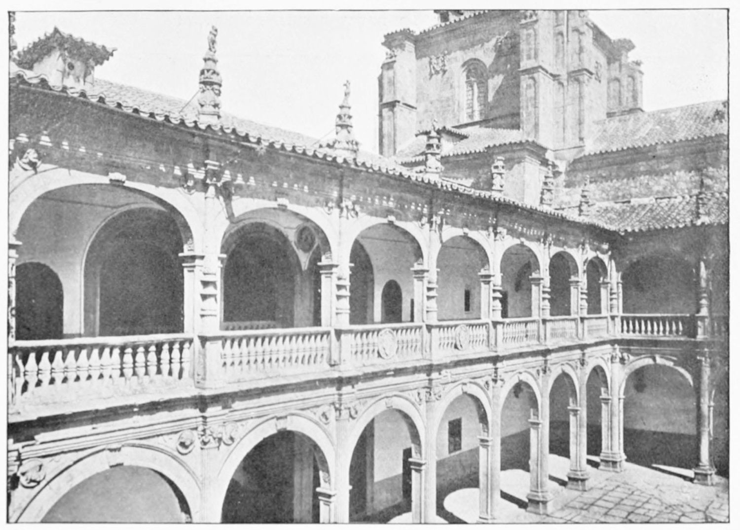 The grand façade of the old convent, extending to the river bank, is divided into two stories, the lower characterised by semicircular windows between pilasters in the plateresque style, and separated by niches; the upper by rectangular windows with balconies, disposed between columns, and likewise separated by niches in pairs. The frieze beneath the lower row of windows is adorned by a series of medallions, displaying the heads of mythological and historical worthies, Gentiles and Christians, ancients and moderns, most oddly assorted. With Priam and Hector, Hannibal and Cæsar, we find Charlemagne and the Cid, Charles V. and Philip II., with Lucretia, Judith and Isabel the Catholic. The busts to the left of the doorway are those of the grand masters of the Order of Santiago. The{29} doorway itself is a very unhappy combination of the plateresque and baroque styles, but the statue of Fame surmounting it is not devoid of grace and dignity. The balconies and windows facing the river date from the eighteenth century.