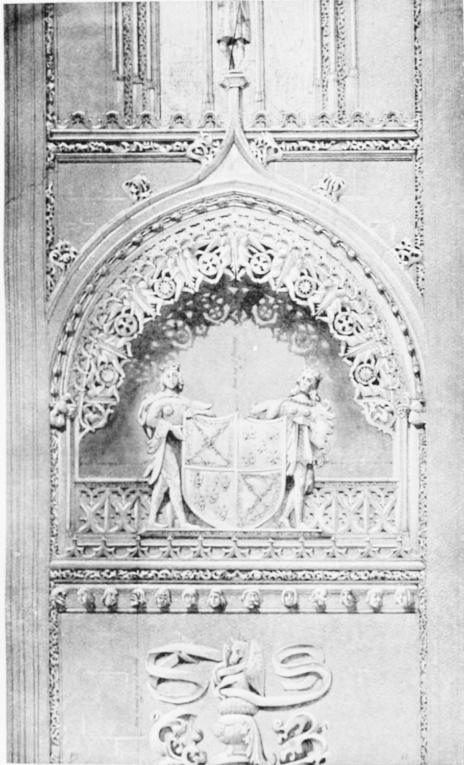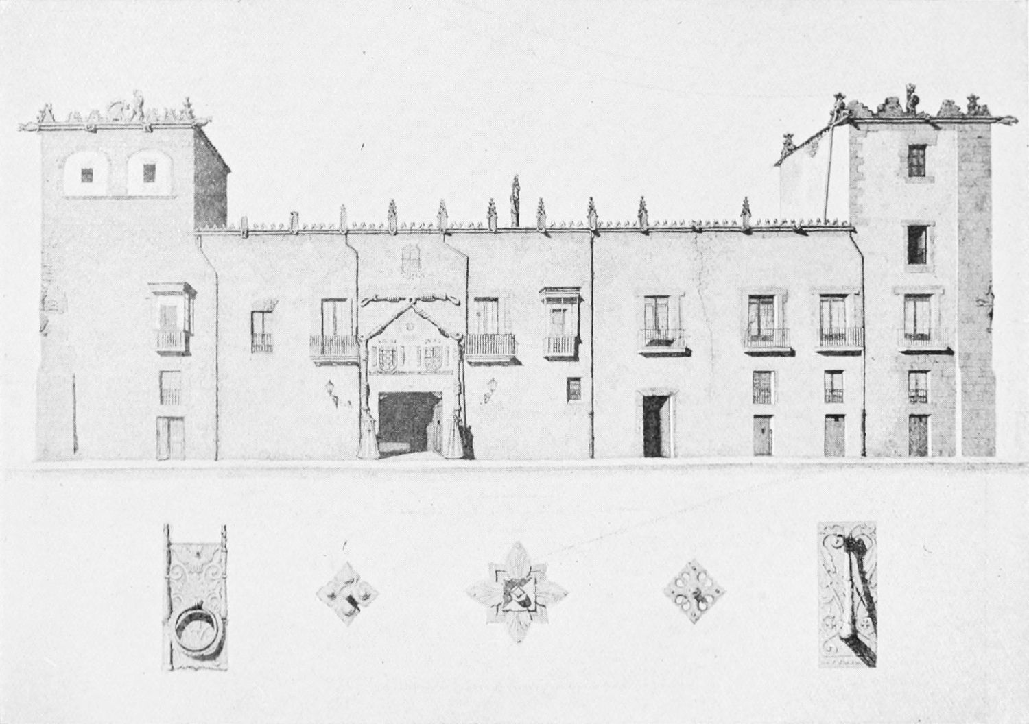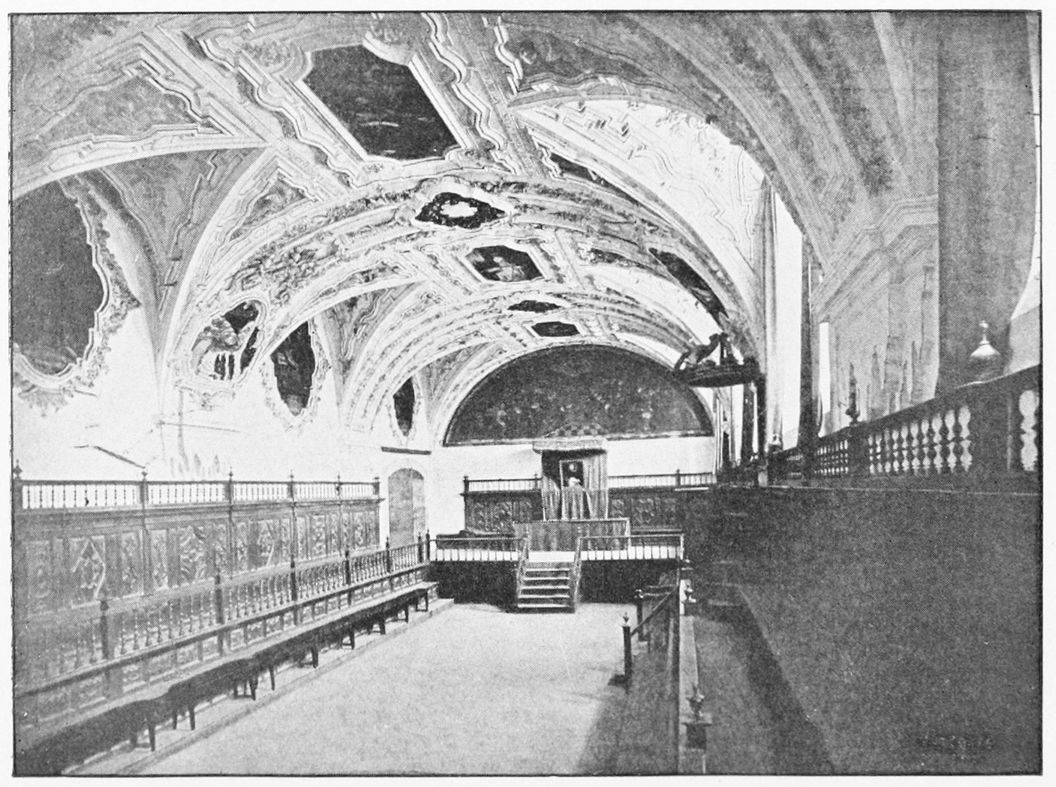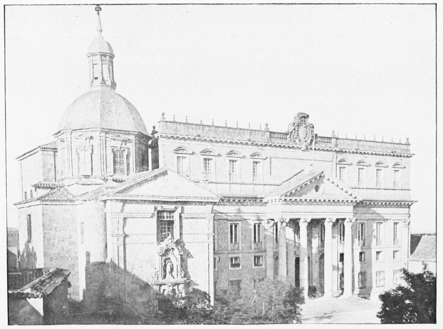 The grand façade of the old convent, extending to the river bank, is divided into two stories, the lower characterised by semicircular windows between pilasters in the plateresque style, and separated by niches; the upper by rectangular windows with balconies, disposed between columns, and likewise separated by niches in pairs. The frieze beneath the lower row of windows is adorned by a series of medallions, displaying the heads of mythological and historical worthies, Gentiles and Christians, ancients and moderns, most oddly assorted. With Priam and Hector, Hannibal and Cæsar, we find Charlemagne and the Cid, Charles V. and Philip II., with Lucretia, Judith and Isabel the Catholic. The busts to the left of the doorway are those of the grand masters of the Order of Santiago. The{29} doorway itself is a very unhappy combination of the plateresque and baroque styles, but the statue of Fame surmounting it is not devoid of grace and dignity. The balconies and windows facing the river date from the eighteenth century.