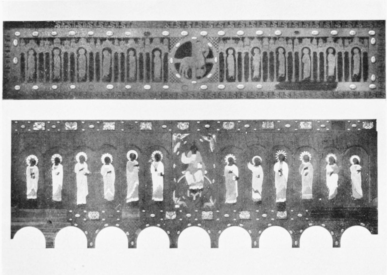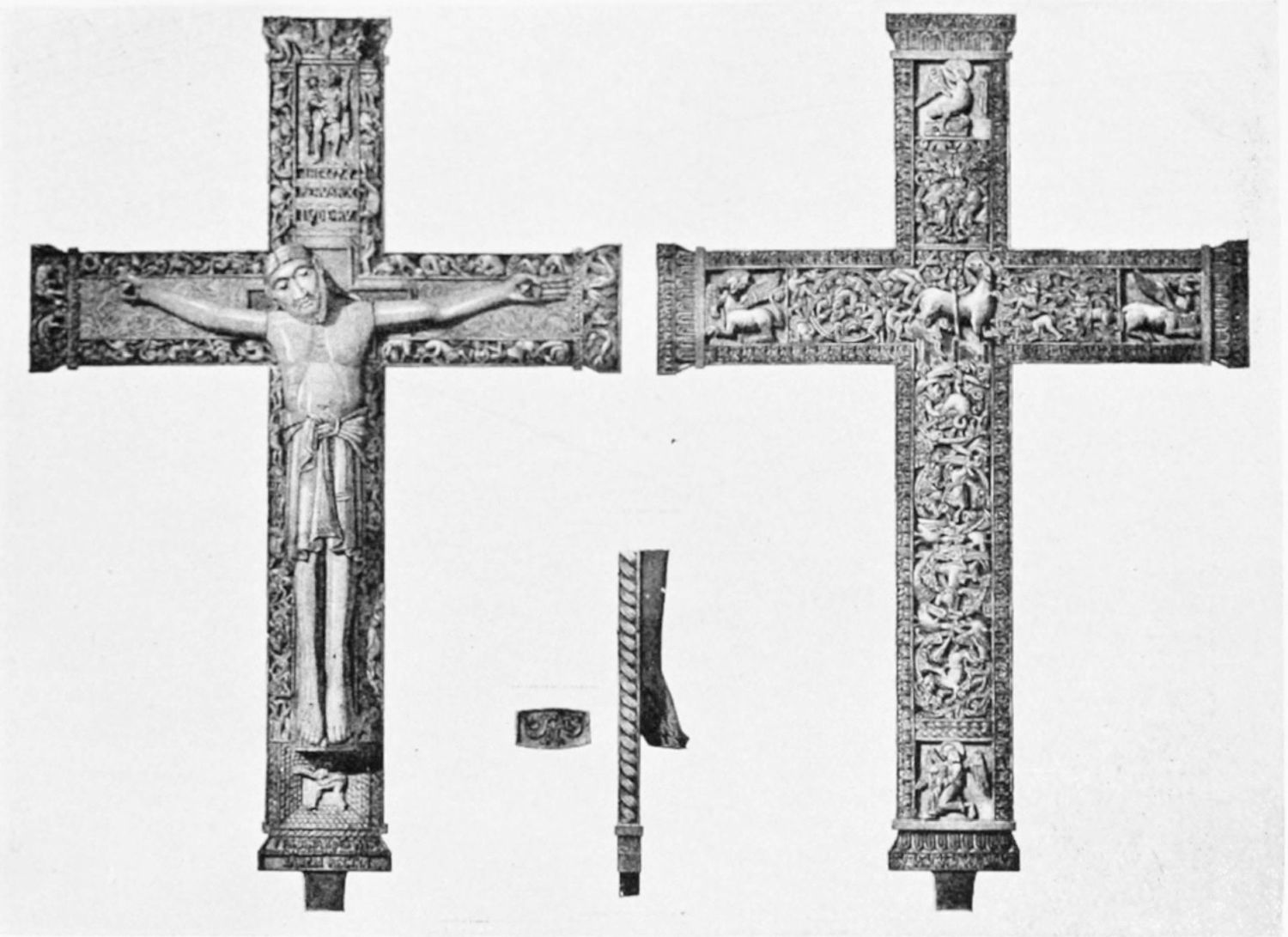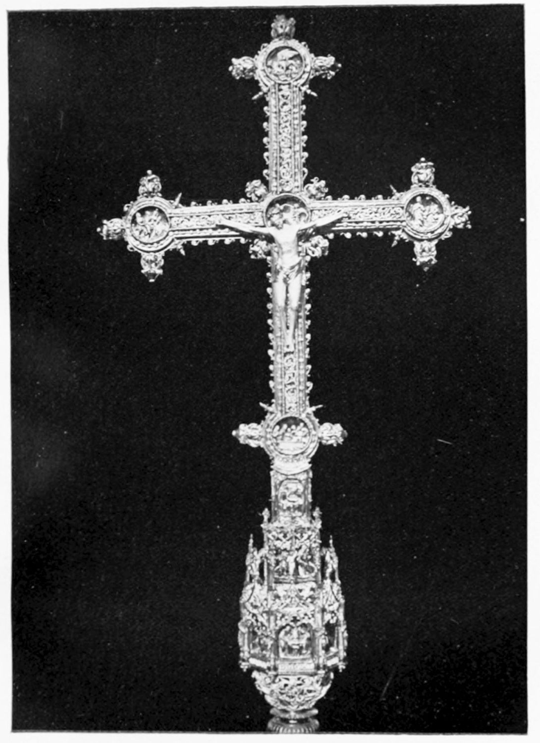The arches of this gloomy Pantheon are decorated with curious frescoes, probably of the twelfth century. The crude drawing and tints rather add to the impressive effect of these solemn paintings. Among the subjects are the ‘Massacre of the Innocents,’ the ‘Last Supper’ (painted, as Street points out, without the least regard to the angles formed by the groining, and as if the vault were a flat surface), scenes from the Passion, and the Visions of the Apocalypse—terrible conceptions. One of the designs represents the Supreme Judge with two swords issuing from His mouth; another shows a hand, inscribed Dextra Dei. The compositions are surrounded by foliage, rich and conventional. On the altar is an interesting ivory cross, the gift of Fernando I. and Sancha, whose names are engraved upon the reverse. While the figure of Christ is rude in the extreme, the foliage and figures of the four evangelists at the back are exquisitely chiselled.{12}