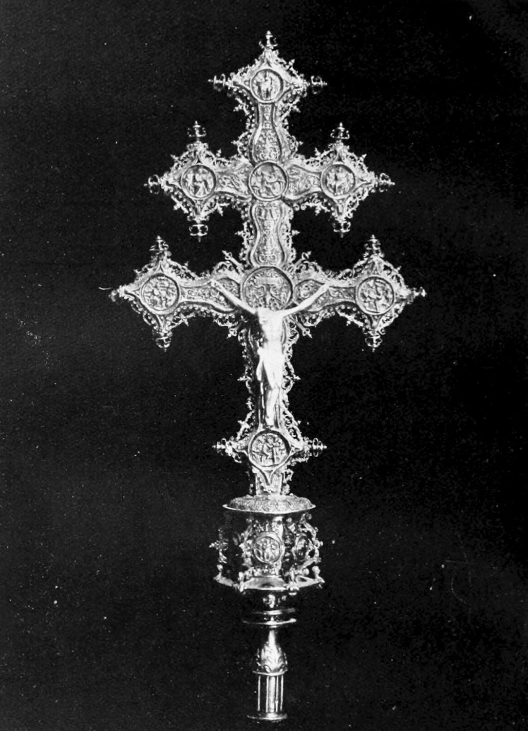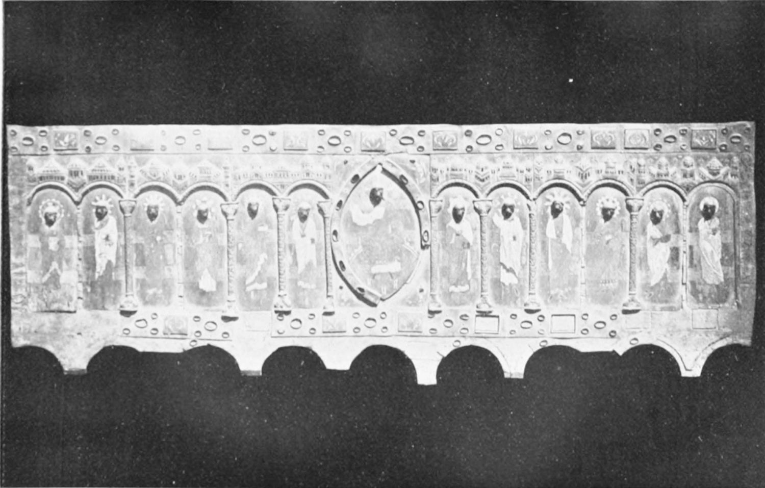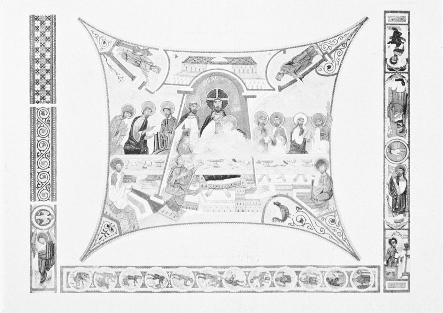 The arches of this gloomy Pantheon are decorated with curious frescoes, probably of the twelfth century. The crude drawing and tints rather add to the impressive effect of these solemn paintings. Among the subjects are the ‘Massacre of the Innocents,’ the ‘Last Supper’ (painted, as Street points out, without the least regard to the angles formed by the groining, and as if the vault were a flat surface), scenes from the Passion, and the Visions of the Apocalypse—terrible conceptions. One of the designs represents the Supreme Judge with two swords issuing from His mouth; another shows a hand, inscribed Dextra Dei. The compositions are surrounded by foliage, rich and conventional. On the altar is an interesting ivory cross, the gift of Fernando I. and Sancha, whose names are engraved upon the reverse. While the figure of Christ is rude in the extreme, the foliage and figures of the four evangelists at the back are exquisitely chiselled.{12}