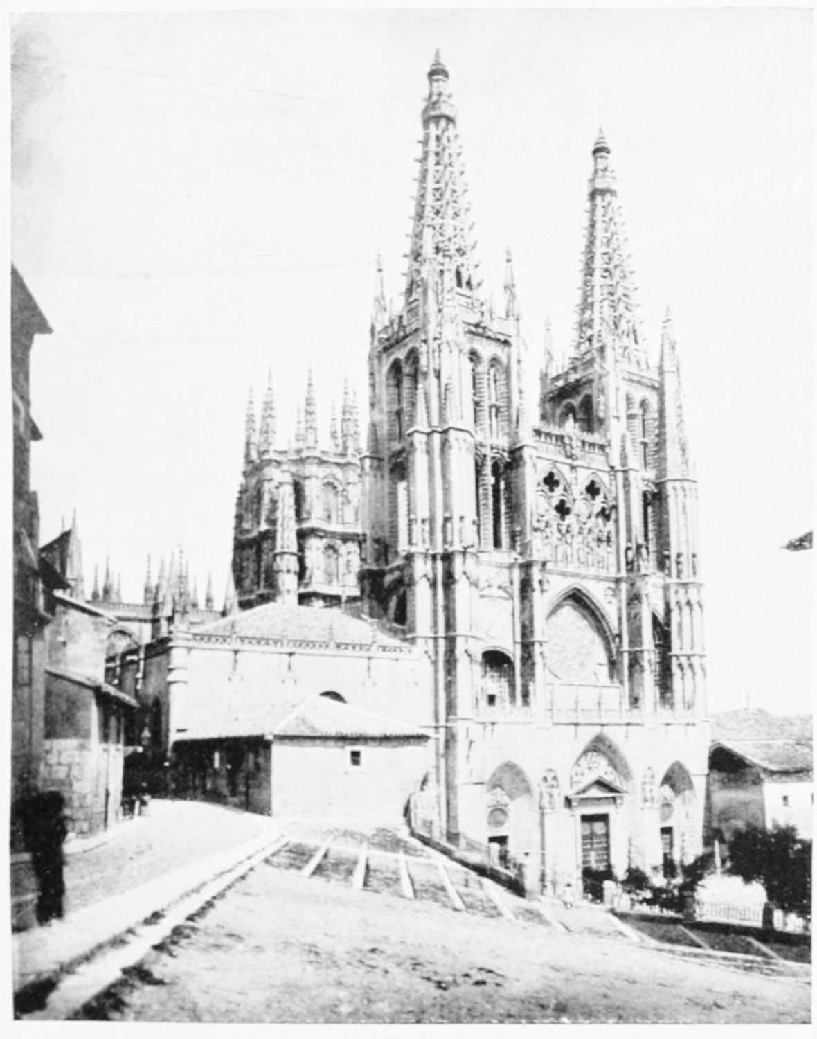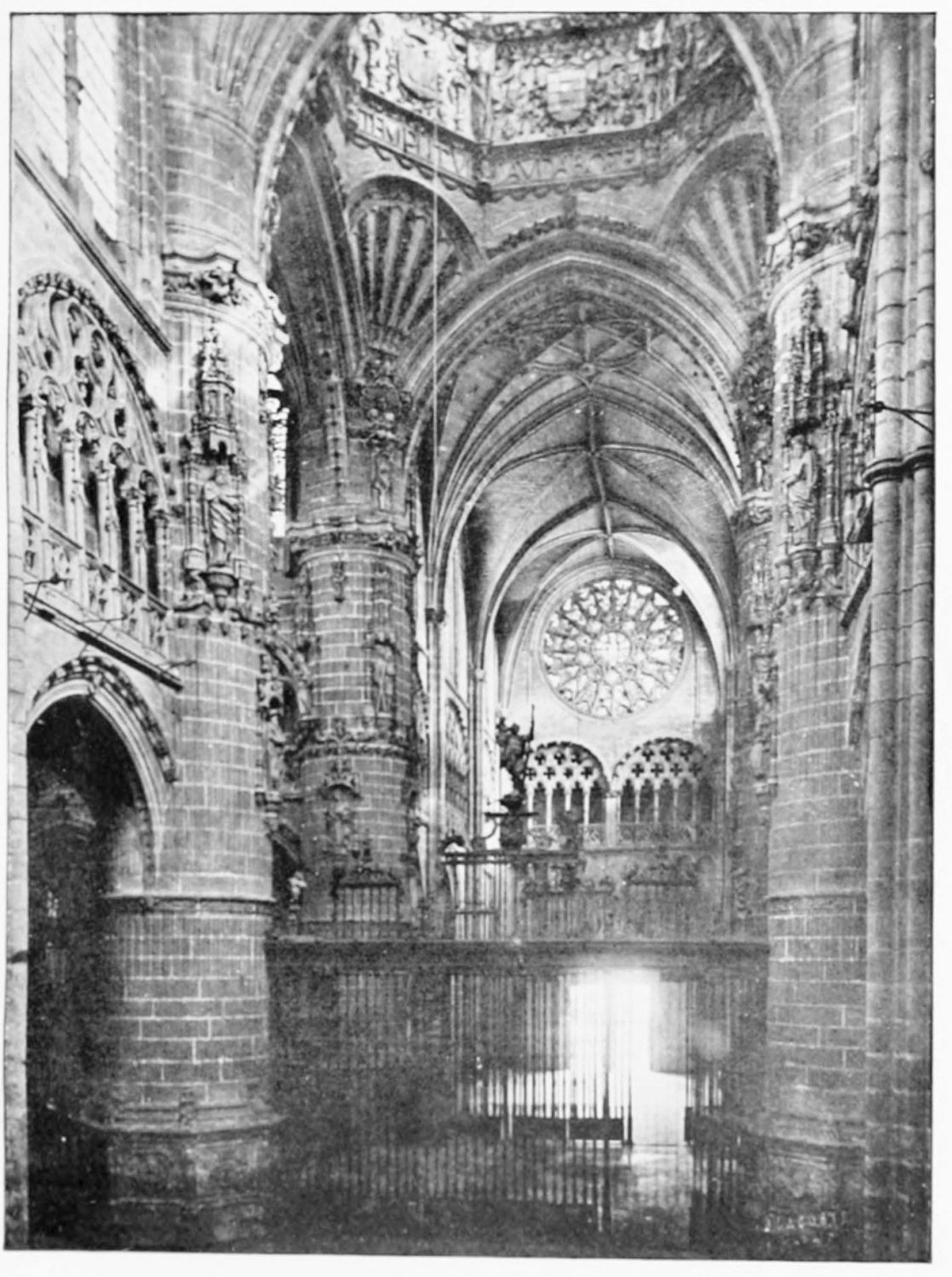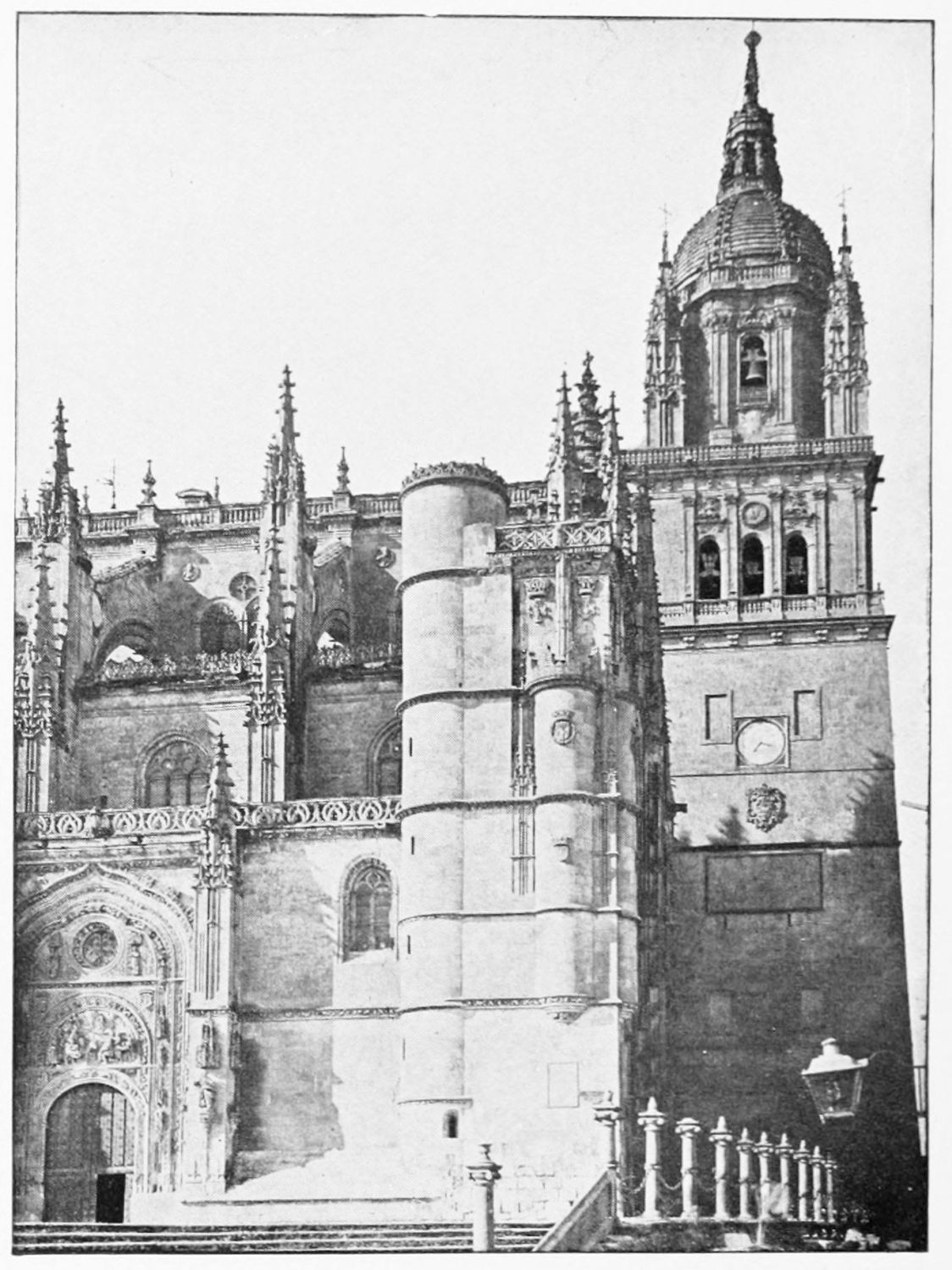 The eastern end, or chevet, projects beyond the city wall, which forms the eastern boundary of the adjacent cloister. The transept, if that term may be applied to the whole space between the Capilla Mayor and Coro, is of unusual breadth, and may be said to include a nave, two aisles to the east and{17} one to the west. North and south it projects but slightly beyond the nave. The west front is flanked by two steeples, which stand on each side of, and do not terminate, the aisles. They are heavier than the rest of the structure, and of different heights and ages. Ugly, too, is the empty space left between their side walls and those of the clerestory over the main entrance. The northern steeple is the older, lower, and simpler; it is surmounted by a spire with a vane. The other tower is more ornate, and contains the belfry. Its traceries are in a debased Gothic style.