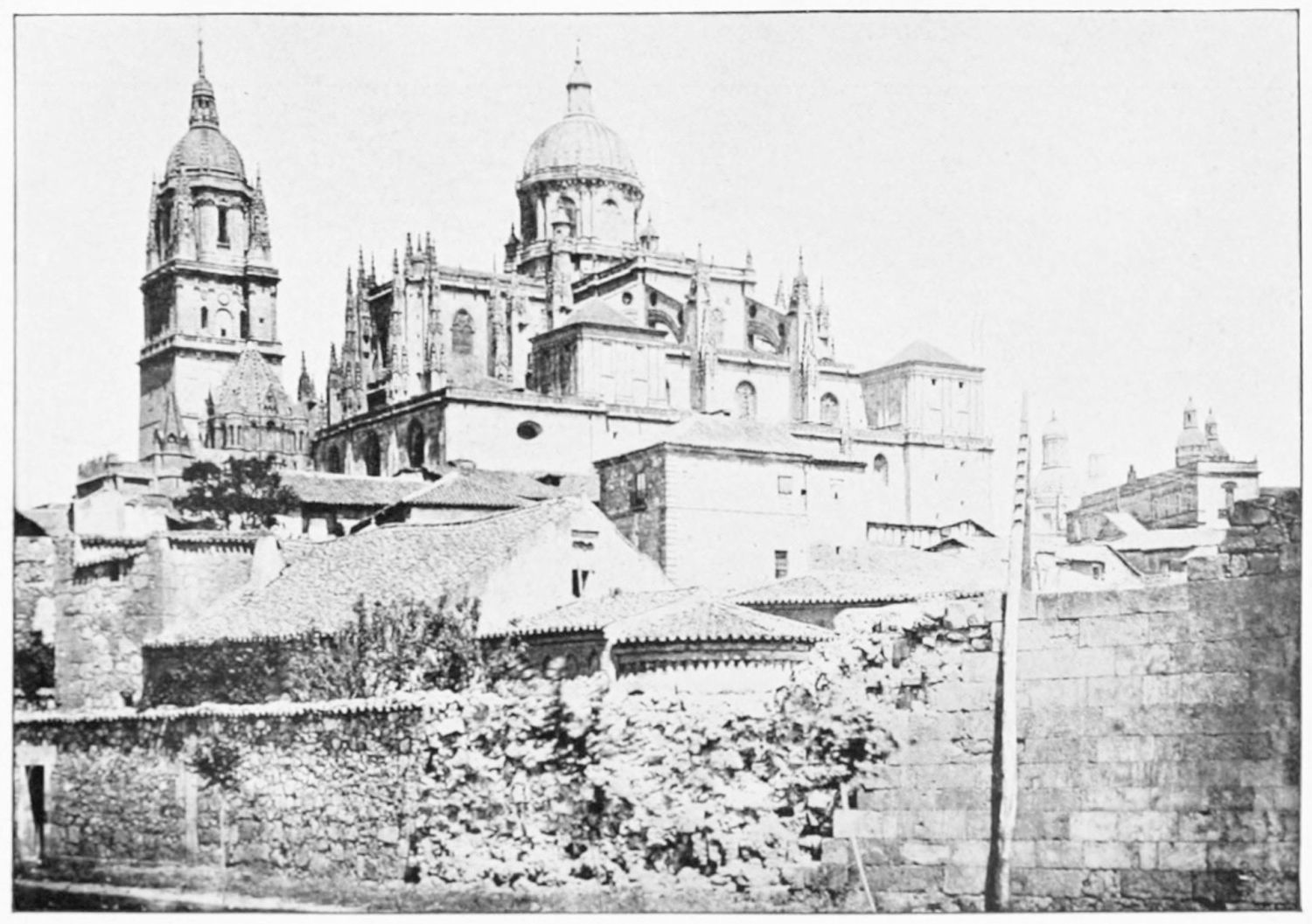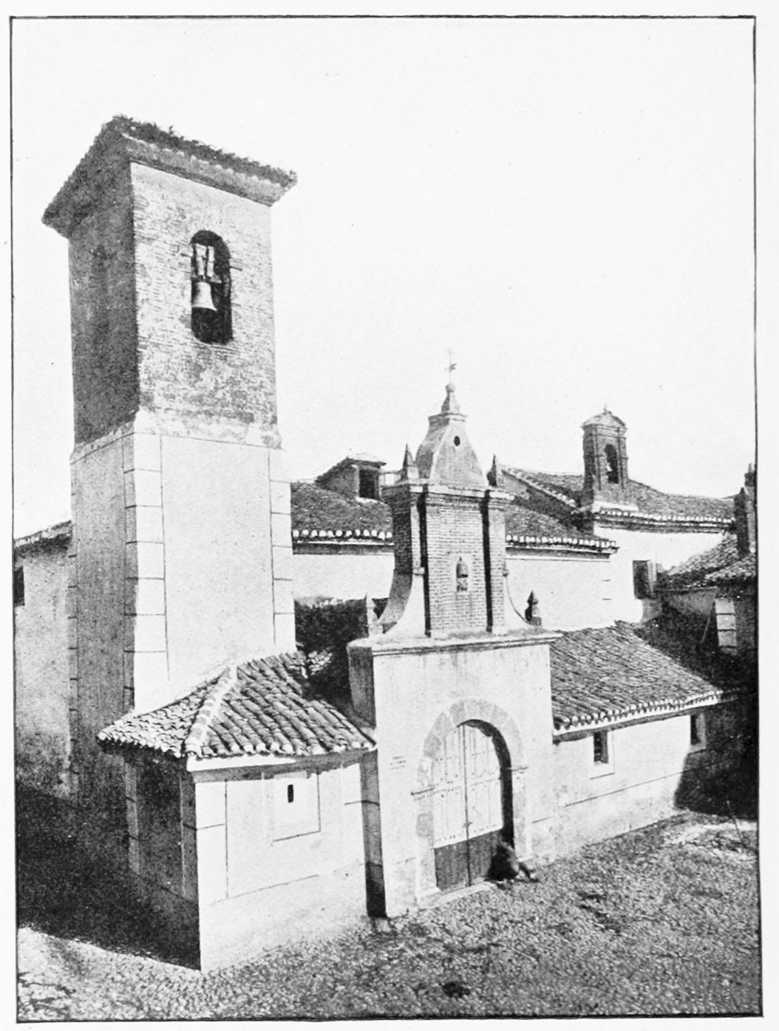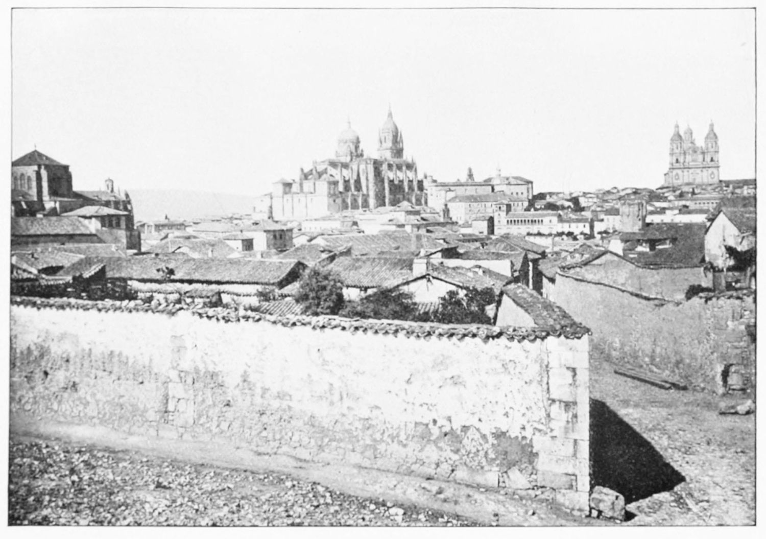 The eastern end, or chevet, projects beyond the city wall, which forms the eastern boundary of the adjacent cloister. The transept, if that term may be applied to the whole space between the Capilla Mayor and Coro, is of unusual breadth, and may be said to include a nave, two aisles to the east and{17} one to the west. North and south it projects but slightly beyond the nave. The west front is flanked by two steeples, which stand on each side of, and do not terminate, the aisles. They are heavier than the rest of the structure, and of different heights and ages. Ugly, too, is the empty space left between their side walls and those of the clerestory over the main entrance. The northern steeple is the older, lower, and simpler; it is surmounted by a spire with a vane. The other tower is more ornate, and contains the belfry. Its traceries are in a debased Gothic style.