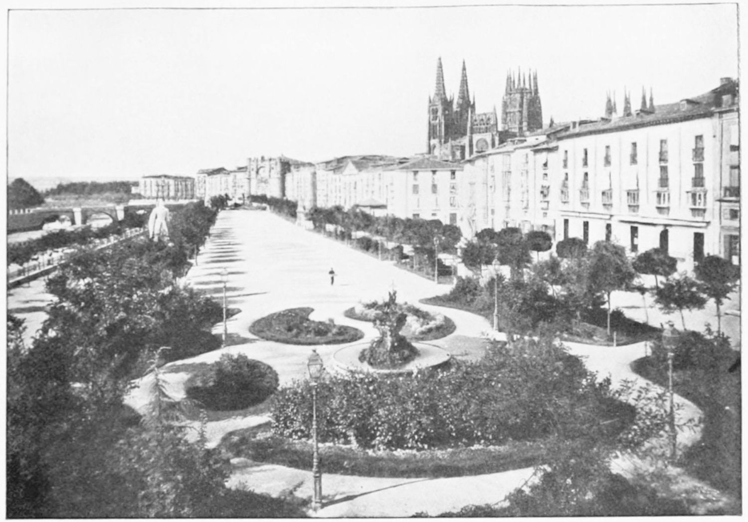 Burgos, the red and white city in the broad valley of the Arlanzon, is more mediæval than many an older town. For she was no inheritance from Celts or Romans, but was born in the Dark Ages, waxed prosperous within them, and declined with the Renaissance and the dawn of the modern era. There is nothing that is classical, little that is modern, about this old capital of Castile. All her memories are of Gothic, mediæval, romantic Spain. To her belong knights and barons, shield and helm and lance, tournaments and jousts, soaring Gothic spires, and the quiet of the cloister—all the pageant and panorama of mediævalism.
