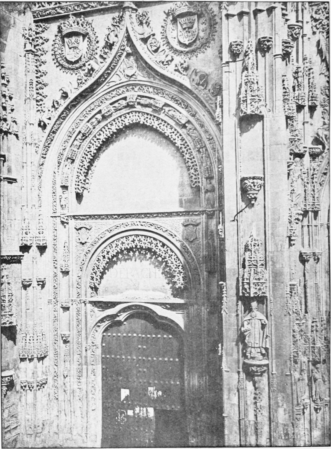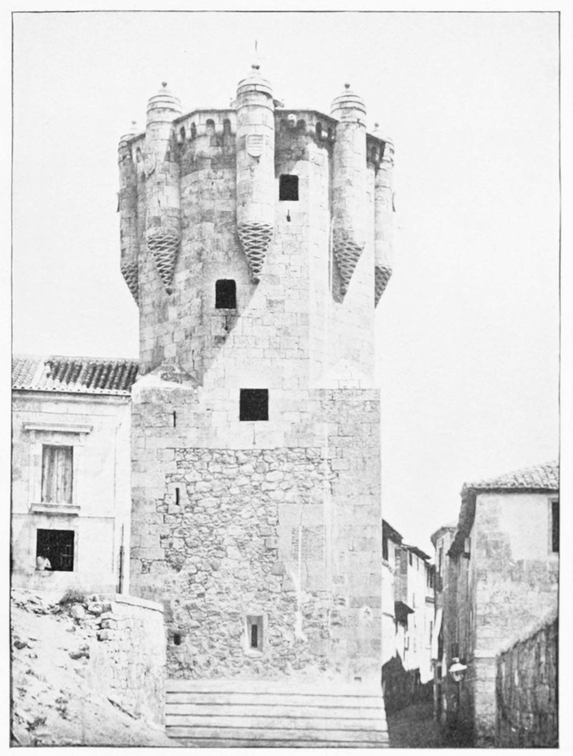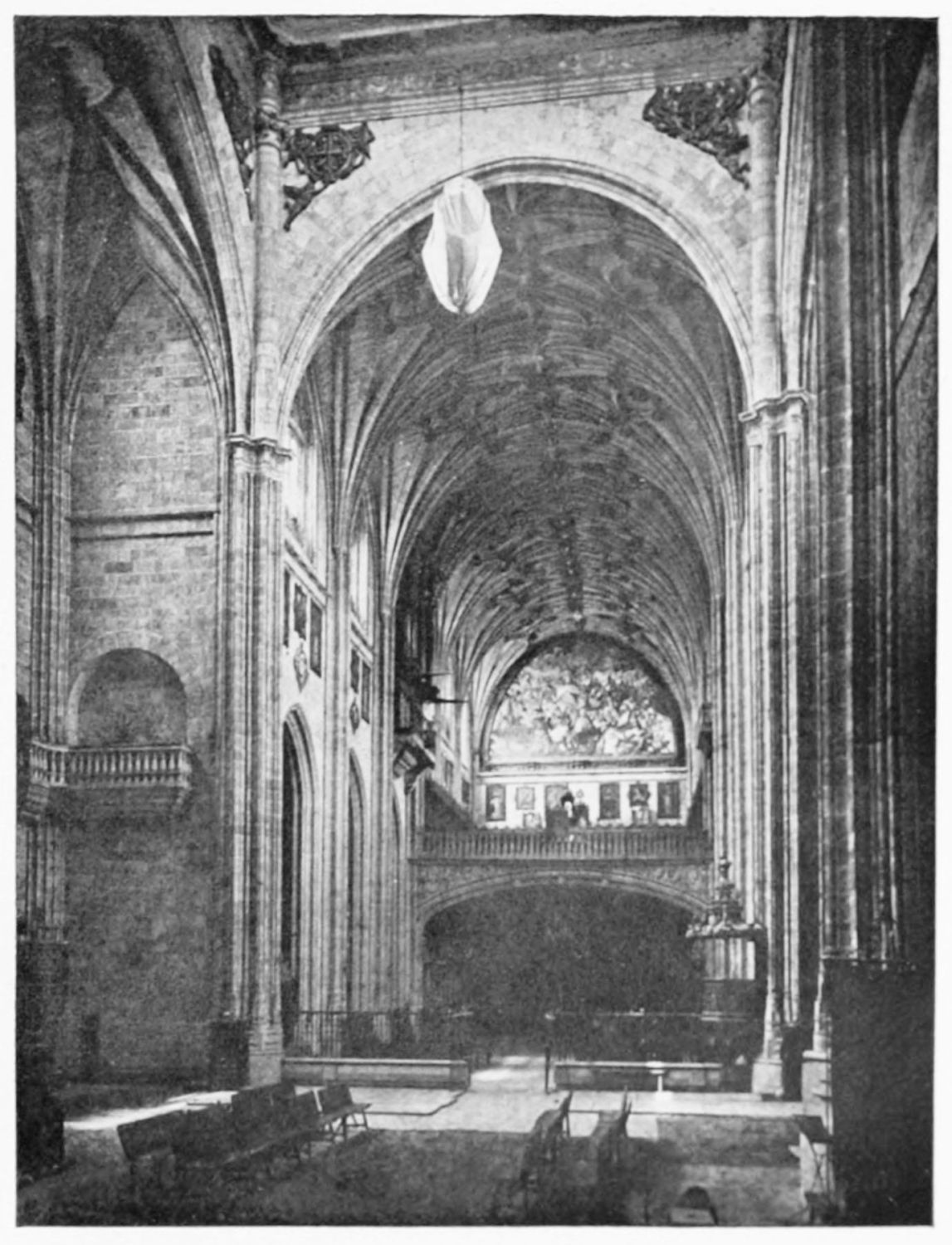 At the north-eastern shoulder of the church, between it and the tower in the city wall already mentioned, is the fine rectangular chapel of Santiago, built in the time of the Catholic sovereigns—on the site, it would seem, of a{23} twelfth-century chapel. The pillars are borne on the shoulders of various figures, among them being Samson, the Queen of Sheba, Laocoon, and a monk with a book on which is the derisive motto legere et non intelligere. The details of the architecture are capricious and graceful. The chapel is lighted by colossal windows, filled with gorgeous stained glass—blue and gold, purple and emerald—the reflected colour producing a magical effect.