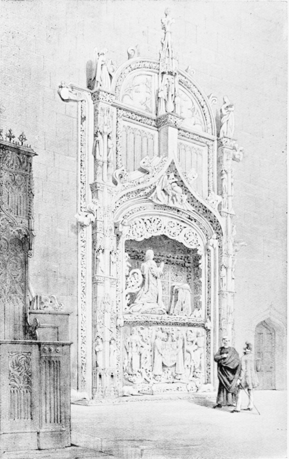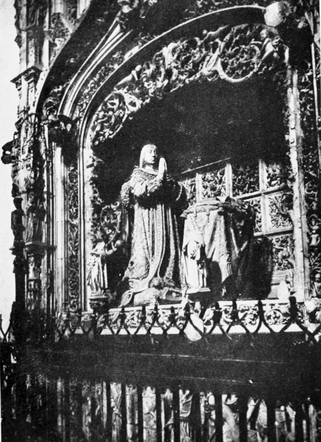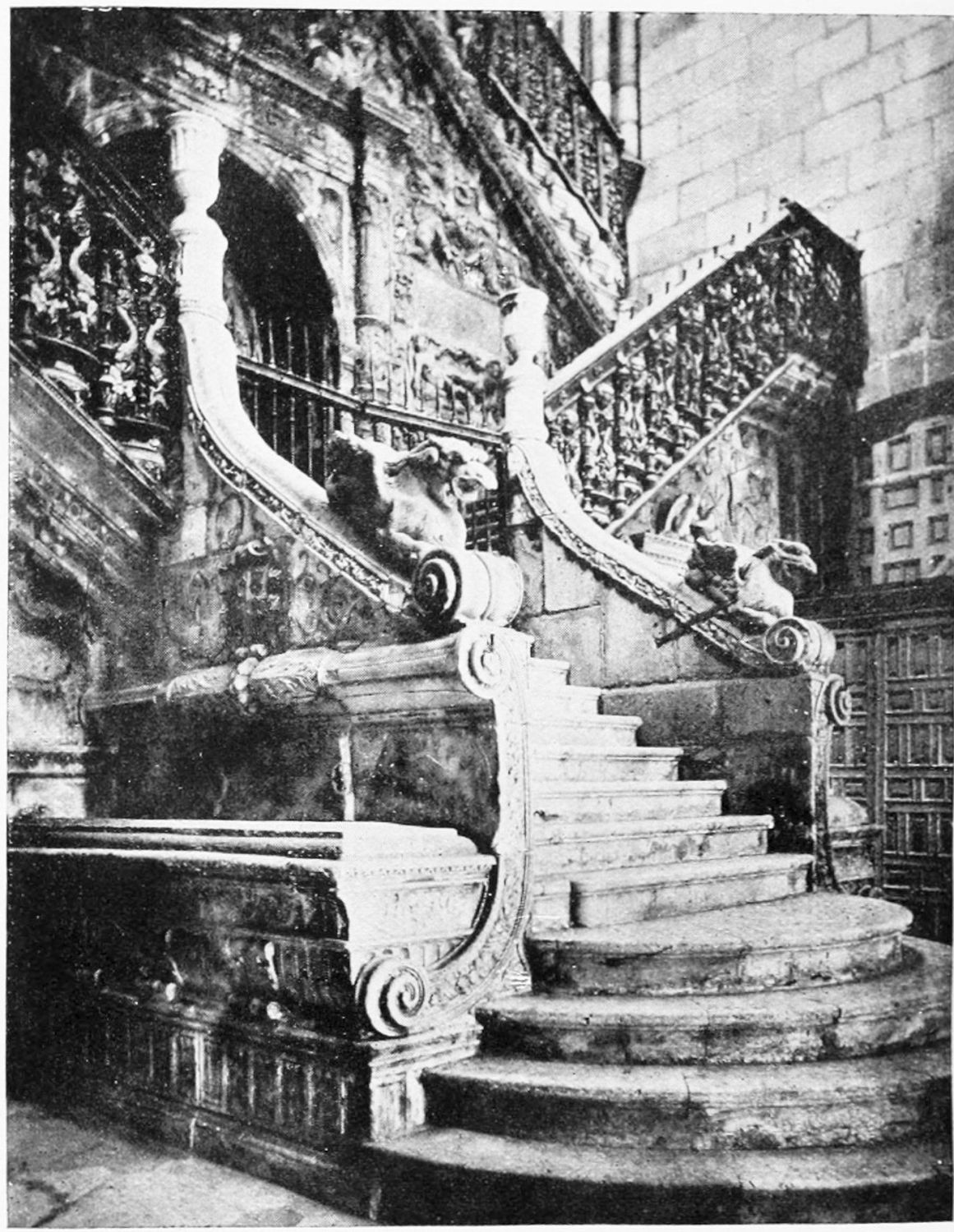 At the north-eastern shoulder of the church, between it and the tower in the city wall already mentioned, is the fine rectangular chapel of Santiago, built in the time of the Catholic sovereigns—on the site, it would seem, of a{23} twelfth-century chapel. The pillars are borne on the shoulders of various figures, among them being Samson, the Queen of Sheba, Laocoon, and a monk with a book on which is the derisive motto legere et non intelligere. The details of the architecture are capricious and graceful. The chapel is lighted by colossal windows, filled with gorgeous stained glass—blue and gold, purple and emerald—the reflected colour producing a magical effect.
