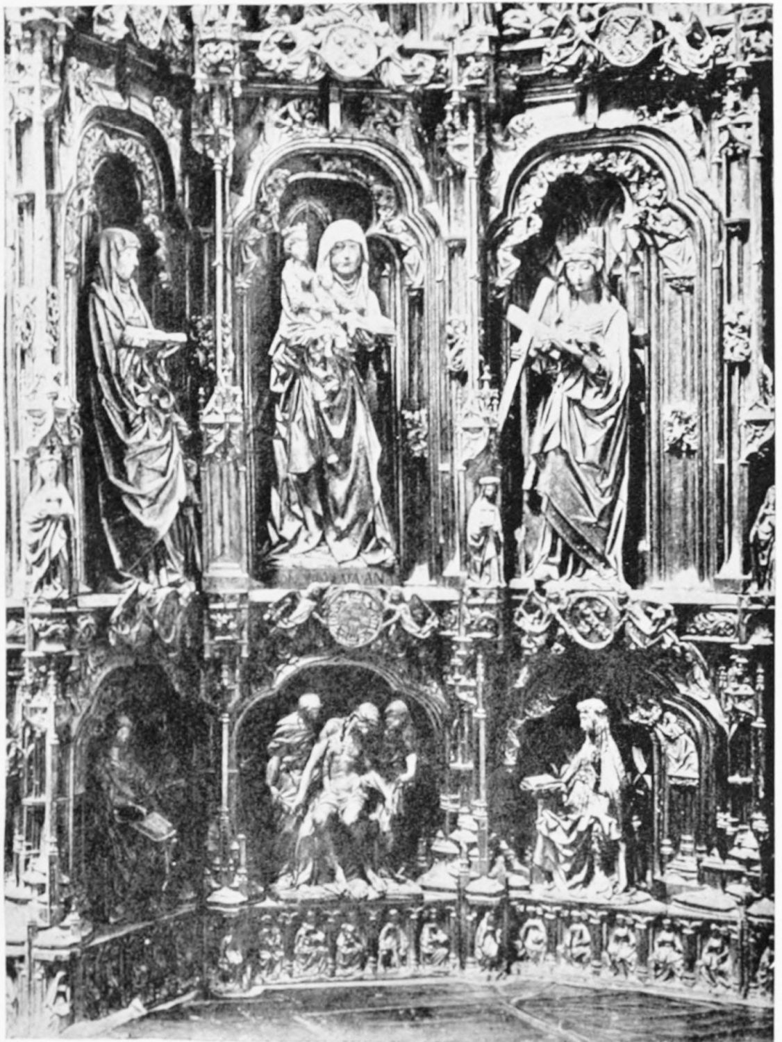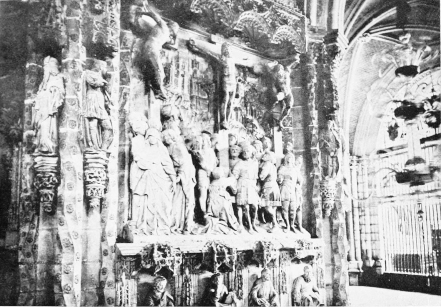 The work of Juan de Badajoz is to be seen in the Sacristy, a spacious nave of three vaults, richly designed and gilded. Under the windows are medallions with busts in relief, very well done. The retablo in the plateresque style shows the Eternal Father with His angels, and the Vision of Santiago. The inscriptions on the frieze are from the Book of Leviticus.
