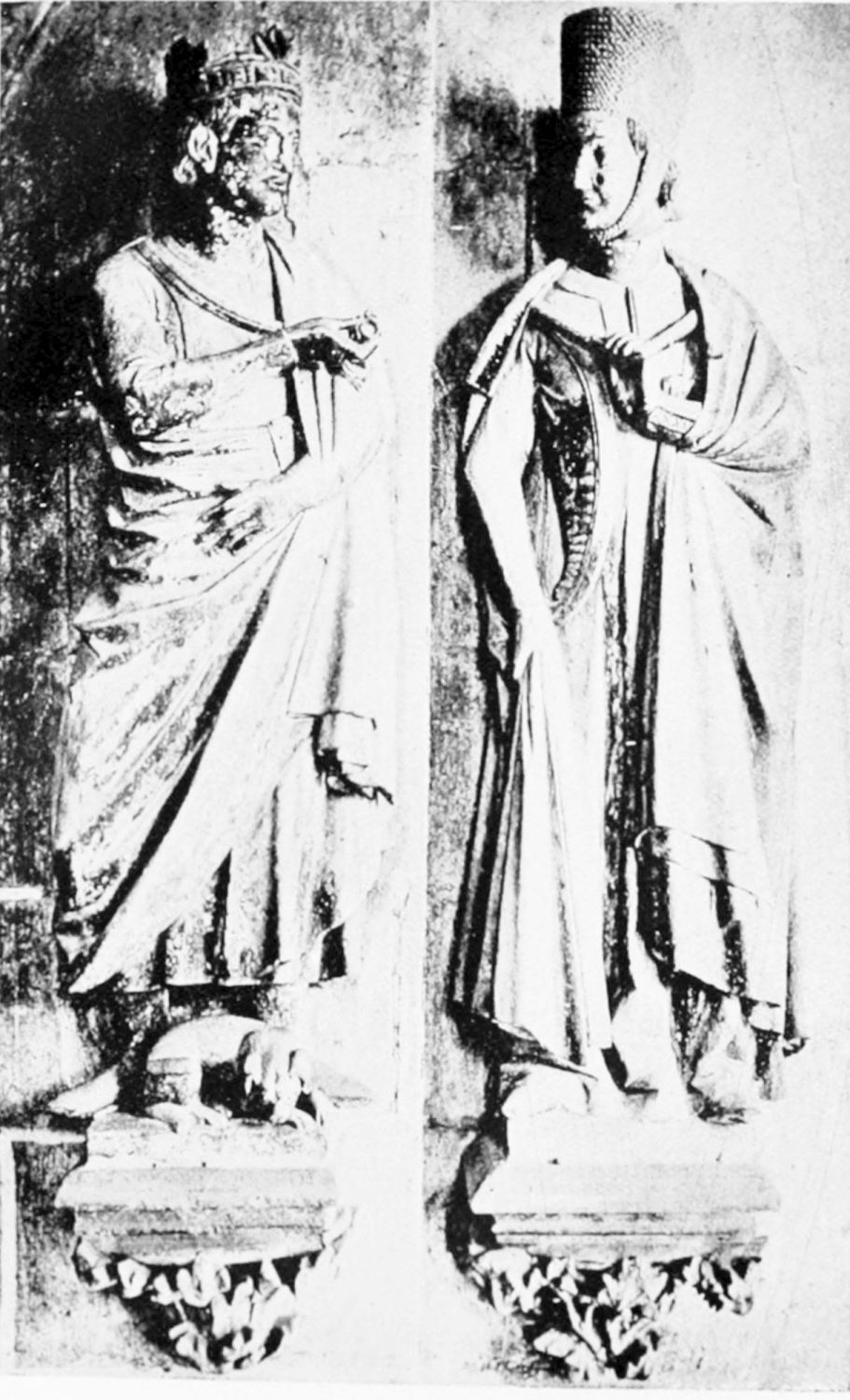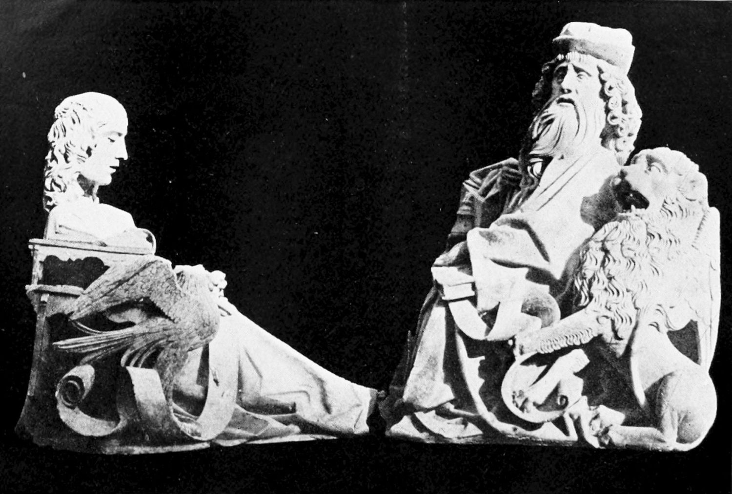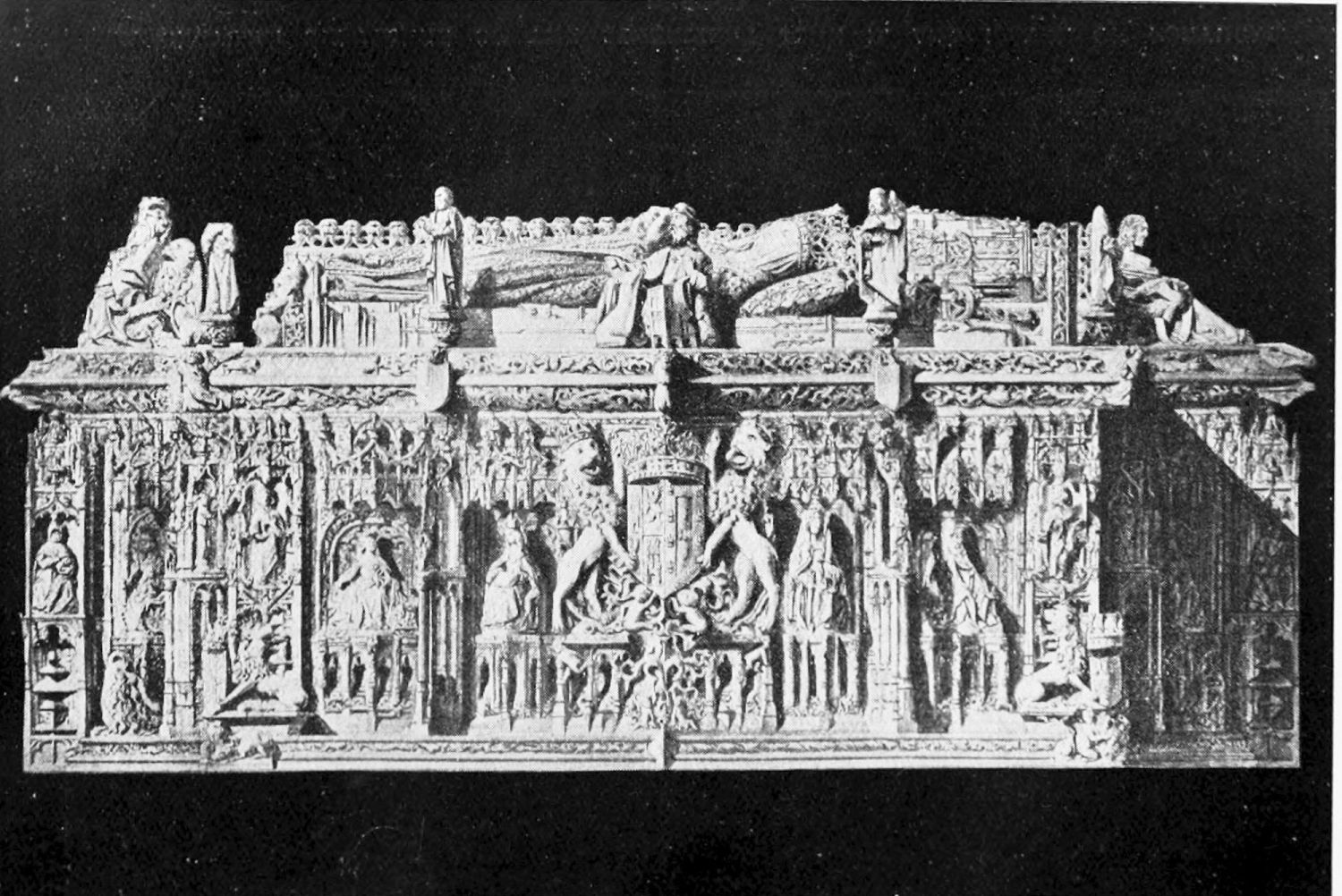 There are many tombs in the cathedral belonging to the transitional period from Byzantine to Gothic, mostly of bishops of the thirteenth century. The best preserved is in the Capilla del Nacimiento, and enshrines the remains of Bishop Rodrigo, who died in 1232. The tympanum of the arch is occupied by a representation of the Crucifixion, below this being shown a funeral procession, with the mourners tearing their hair{22} in a grotesque excess of grief. The benevolence of the good prelate is immortalised by a figure distributing food to the poor, the halt, and the blind. The tomb of Bishop Martin (1254-1289), in the south transept, is adorned with the favourite scene from the life of St. Martin of Tours—the division of the cloak. The monuments to the bishops Manrique de Lara, Erasmus, and Martin (second of the name) are all in much the same style, but differing stages of preservation. In the Capilla del Salvador, behind the High Altar, may be seen the graceful effigy of the Countess Sancha (eleventh century), executed in the fourteenth century by Maestre Juan Lope, as an inscription on the robe informs us. The relief on the front of the tomb, showing a youth dragged along by a fiery horse, probably refers to the punishment in this world or the next of the wicked nephew, by whom the countess was assassinated. Another tomb in the same chapel bears the figure of a venerable man with flowing beard and ample robes.