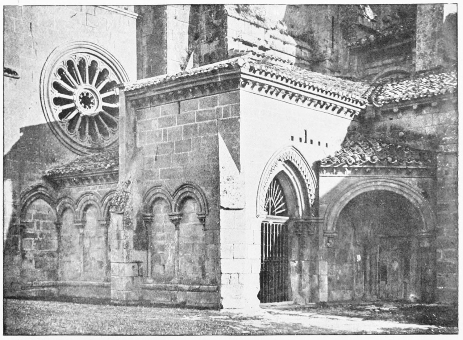 The exterior is interesting. A doorway admits to the middle of the nave on the south side. The arch is semicircular and triple, the tympanum and spandrils being filled with sculpture, representing the Offering of Isaac, the Lamb of God, figures of Saints, and the signs of the Zodiac. ‘The whole detail of this sculpture,’ says Street, ‘is very unlike that of most of the early work I have seen in Spain; the figures are round and flabby, and very free from any of the usual conventionality. All this made me feel much inclined to think that the execution of this work was at an early date, and soon after the first consecration of the church.’ The appearance of the whole front was not improved by the Renaissance work above this gateway—the elaborate cornice, the imperial shield of Charles V., and the colossal equestrian statue of San Isidoro.{14} The Romanesque portal of the southern transept, now closed, is adorned with a relief representing the Descent from the Cross, the statues of Saints Peter and Paul, and other sculptures. Detached from the church is a square tower or steeple built between two bastions in the adjoining city wall. Generally speaking, the eastern façade is strictly Gothic, much of it having been added to the Romanesque framework in the sixteenth century.