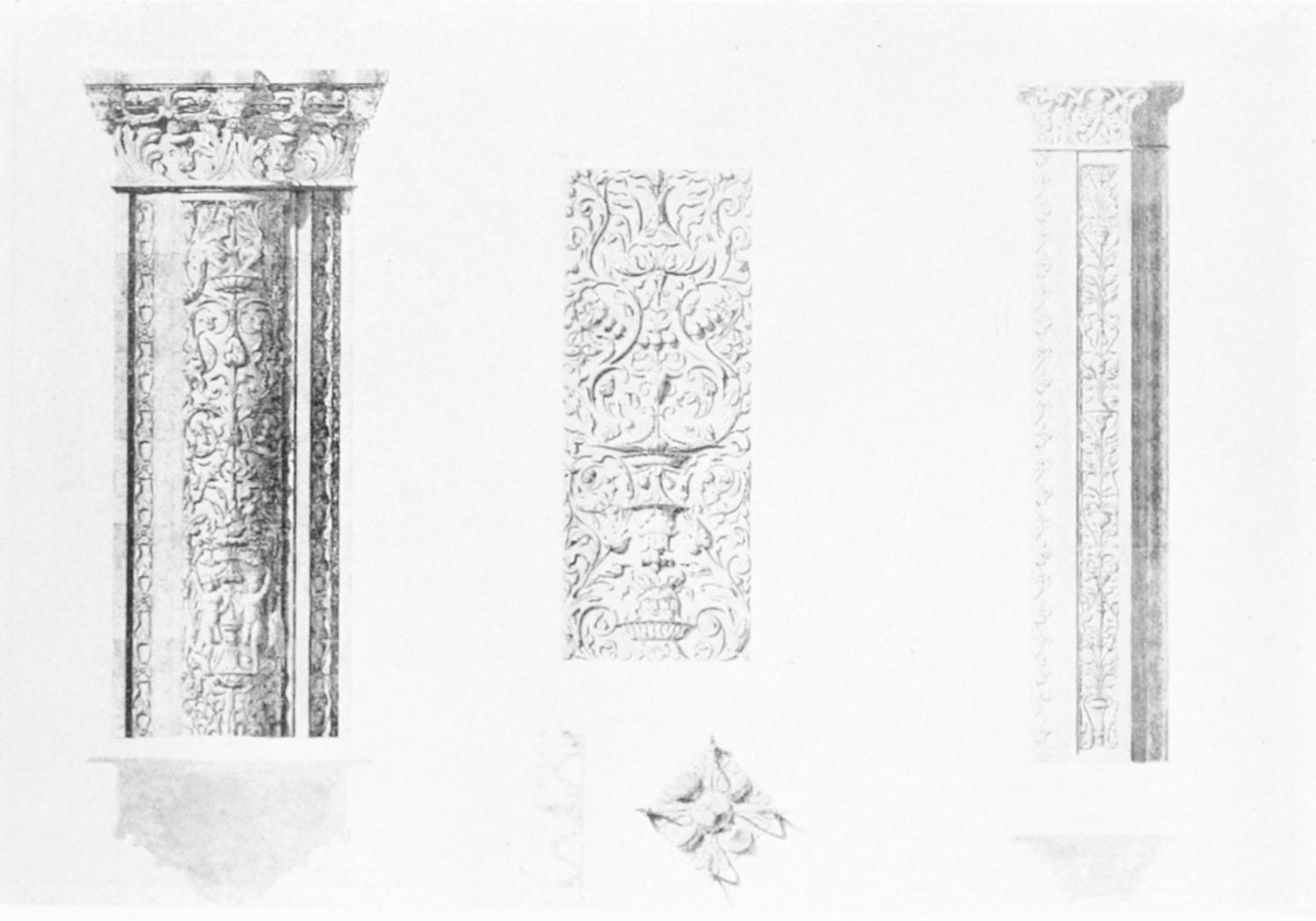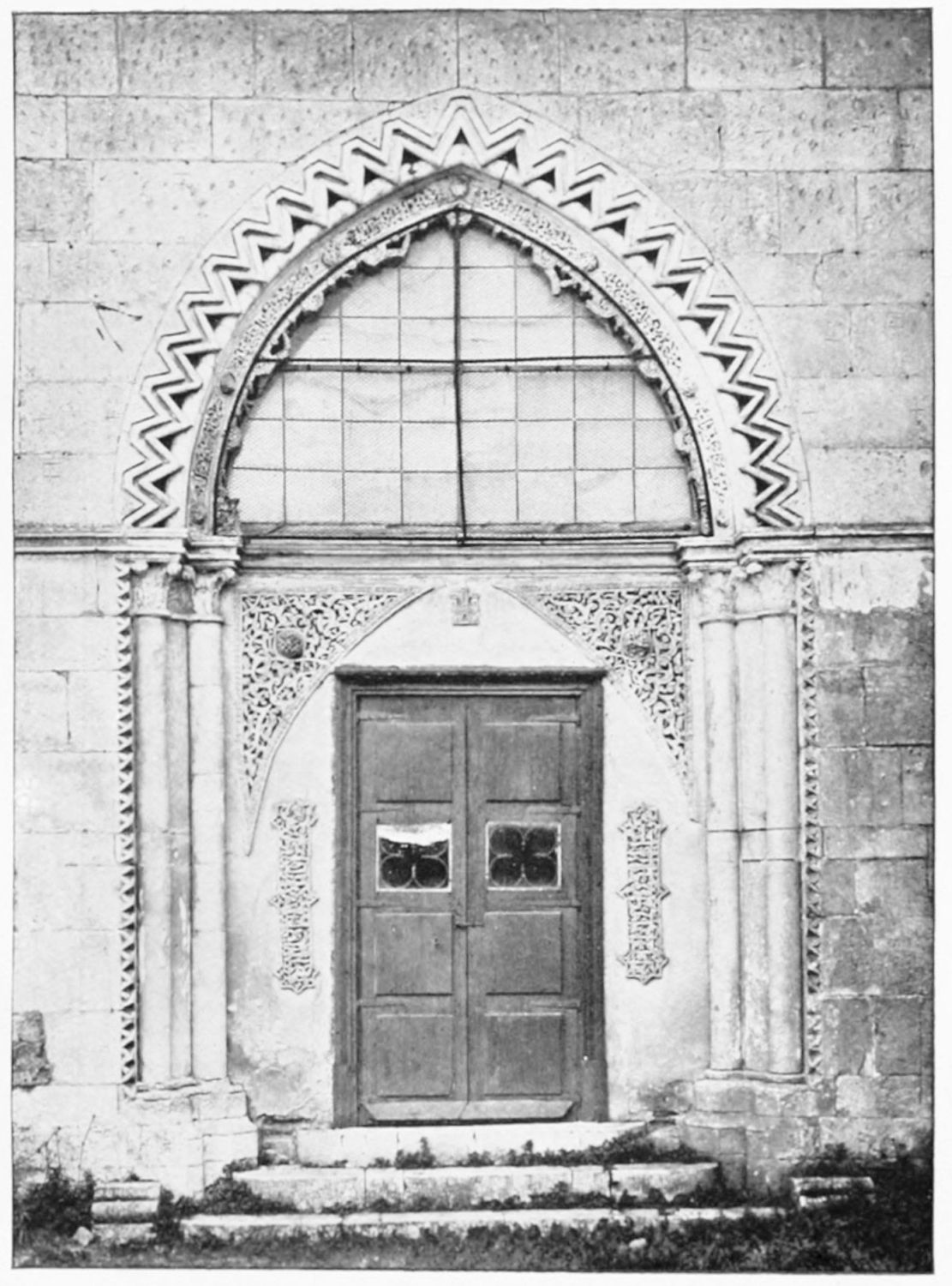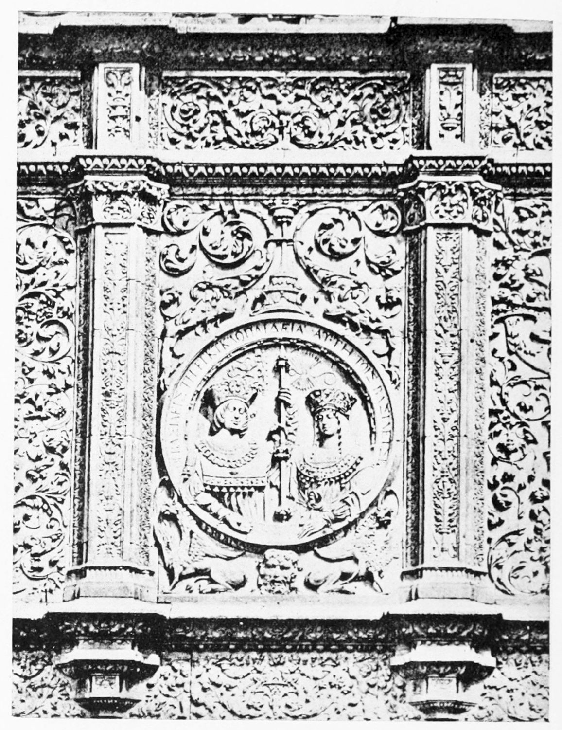 A good deal of building went on in Leon during the sixteenth century. In the Plaza de San Marcelo (before Alfonso XI.’s time, outside the walls) stands the mansion of the illustrious Guzman family, of which Guzman el Bueno, of Tarifa fame, was an illegitimate and the most distinguished member. It was built in the year 1560 by Juan Juiñones y Guzman, Bishop of Calahorra. Its architecture is severe and imposing. Over the main entrance, adjoining a square tower at the corner of the building, are two medallions on which is engraved the motto, ‘Ornanda est dignitas domo—non domo dignitas tota quærenda’—a device which one wishes all the architects of the age had borne in mind. The interior patio is adorned with handsome plateresque reliefs. Next to the Casa Guzman is the residence of the marquesses of Villasinta, in rather similar style. Beneath the sixteenth-century façade of the mansion of the great Luna family was discovered a fine Gothic arch, with{30} another pointed arch supported by columns with Byzantine capitals. This work cannot be later than the thirteenth century. In the patio is a magnificent arch designed with arabesques.