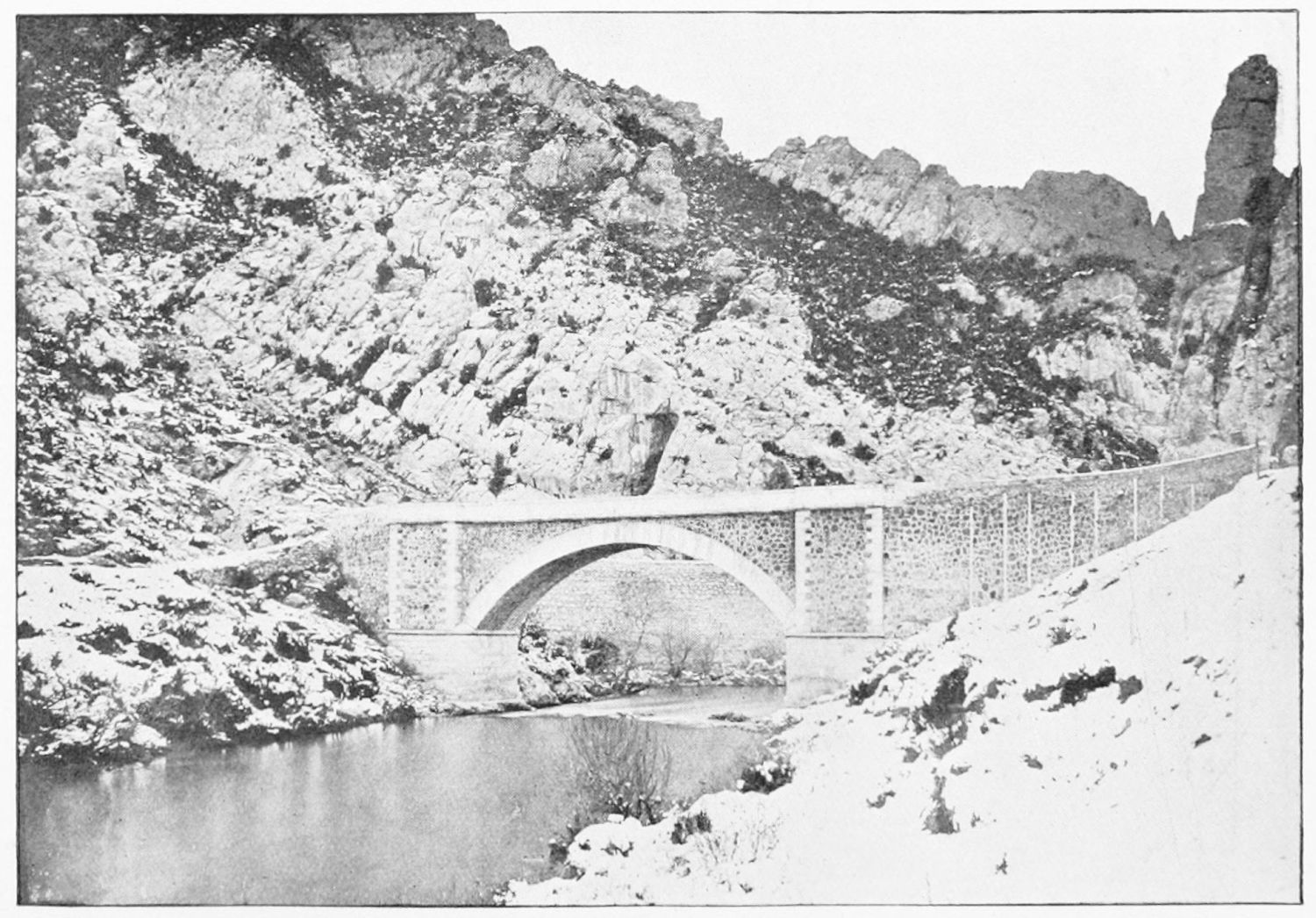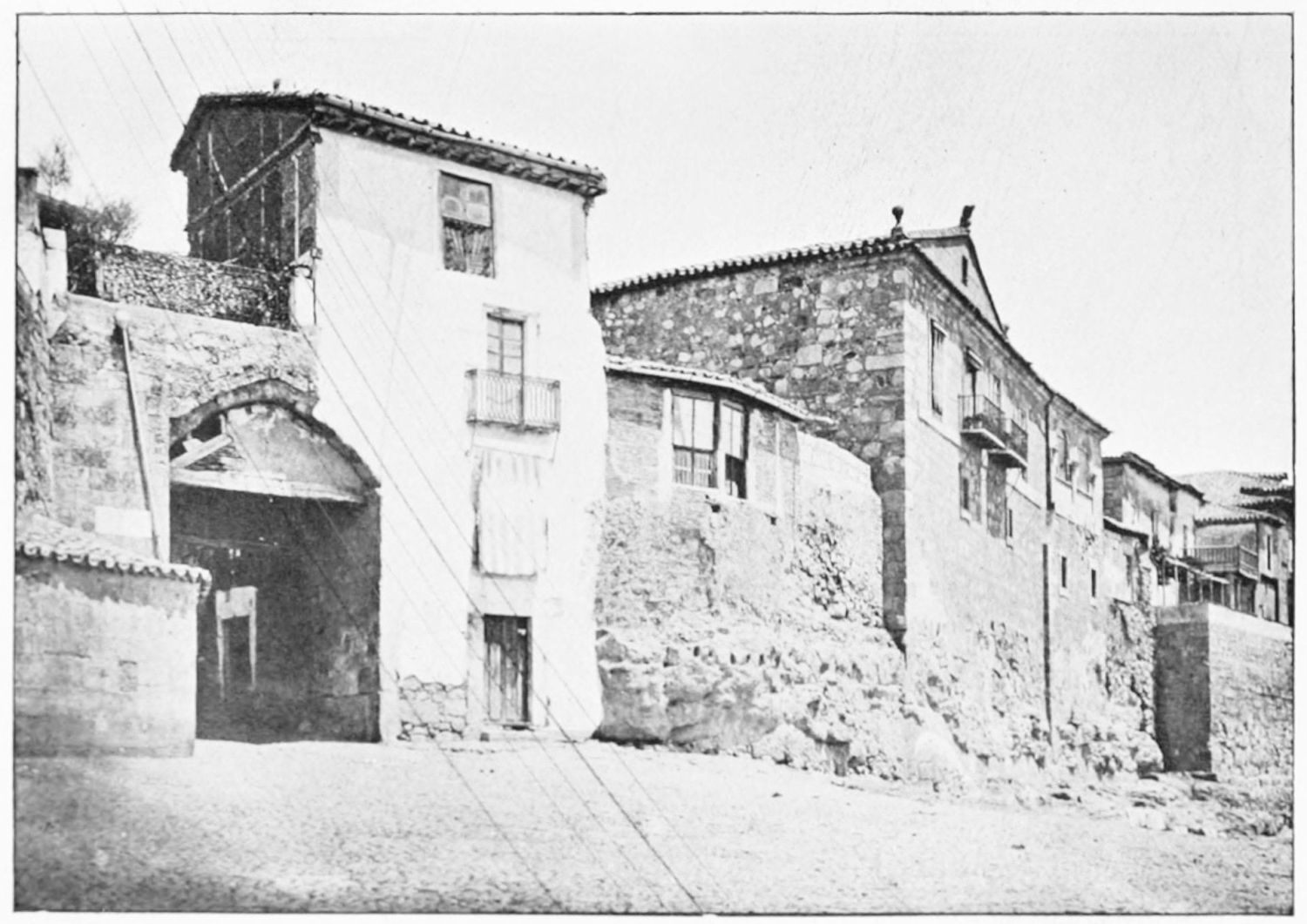 The legion which preserved the pax Romana in this remote corner of the empire may have varied in strength from six to seven thousand men of all arms. The camp was rectangular, and measured 380 by 570 metres. It was confined by the wall, of which the northern, eastern, and part of the western sides remain,—or rather the bases, for the masonry of the upper part reveals the handiwork of various subsequent ages. Walking round the city, you notice the stout round bastions outcropping between the houses which frequently obscure the trace of the wall. Of the four Roman gates, faced with marble slabs and inscribed with the names of the commanders of the{8} legion, two remain—the eastern, or Bishop’s gateway, behind the cathedral, and the low semicircular arch in the Plazuela del Conde de Luna.