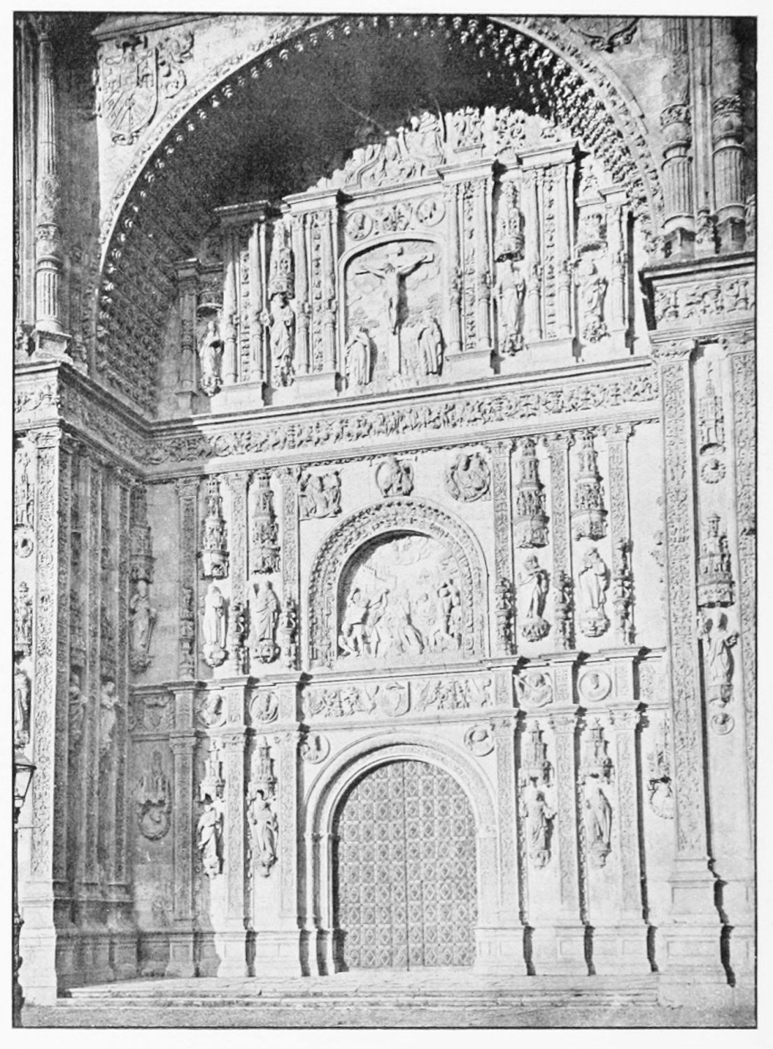 The Renaissance, which left everywhere in Spain so deep an impress, did not leave untouched this Gothic capital. Beside such triumphs of the Romanesque and pointed styles as San Isidoro and the pulchra Leonina rises the church of San Marcos, an interesting specimen of the newer school. Founded as a chapel of the new order of Santiago in 1170, the church witnessed the election of the first prior, and received in 1184 the ashes of the first grand master, Pedro Fernandez de Fuente Encalada. Fernando the Catholic ordered the church to be rebuilt in 1514,{26} but the work progressed very slowly and was not actually finished till 1715. The most important part of the fabric and the plans, however, we owe to Juan de Badajoz, who was working here about 1550. With the adjoining convent, first a hospice for pilgrims to Compostela, now the Provincial Museum, the building presents a very imposing appearance. The church occupies the eastern side of the block, the portal being contained within a very deep and lofty semicircular arch. On either side, in deep plateresque niches, are fine but damaged reliefs by Crozec. The ‘acroterium’ (to employ an expression used by Spanish writers), surmounting the arch, appears to be unfinished, as also are the towers or large buttresses flanking the portal.
