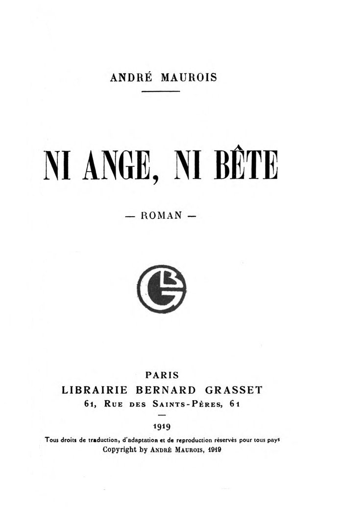 The Project Gutenberg EBook of Ni ange, ni bête, by André Maurois This eBook is for the use of anyone anywhere in the United States and most other parts of the world at no cost and with almost no restrictions whatsoever. You may copy it, give it away or re-use it under the terms of the Project Gutenberg License included with this eBook or online at www.gutenberg.org. If you are not located in the United States, you'll have to check the laws of the country where you are located before using this ebook. Title: Ni ange, ni bête Author: André Maurois Release Date: September 23, 2020 [EBook #63271] Language: French Character set encoding: UTF-8 *** START OF THIS PROJECT GUTENBERG EBOOK NI ANGE, NI BÊTE *** Produced by Laura Natal Rodrigues at Free Literature (Images generously made available by Hathi Trust.)