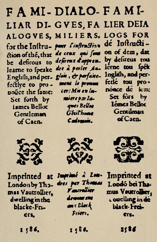 | THe experience hauing in the olde tyme learned vnto me what sorow is for them that be refugiate in a strange countrey, when they can not vnderstand the language of that place in whiche they be exiled: and when they can not make them to be vnderstood by speach to the inhabiters of that contrey, wherein they be retired: I haue bene (therefore) moued to compassion, so that for to drawe out of paine, an infinite number of persons, the whiche our last persecutions haue caused to come in this contrey, I thought good to put into their hands certeine short Dialogues in French, and Englishe in which (for their fuller Instruction) I haue written the English, not onely so as the inhabiters of the countrey do write it: But also, so as it is, and must be pronounced: Whereof they shall be made partakers vnder the fauour of your vertuous godlynesse, to the which I doe dedicate them: beseching you to take them vnder your protection: and to beare also with my rashnesse, whiche haue bene so bolde to presume to present vnto you a worke so rude, and vnfiled: and so you shall geue me occasion, not onely to dedicate vnto you my perpetuall seruice: But also to pray God, for your most happy encrease in all highnesse, and estates, with true, and honorable felicitie. | L'Experience m'aiant iadis appris quel ennuy apporte à ceux qui sont reffugiez en païs estranger, quand ilz ne peuuent entendre le language du lieu auquel ilz sont exilez: & quand ilz ne peuuent se faire entendre aux habitans de la contrée en laquelle ilz se sont retirez: i'ay esté (à ceste cause) esmeu à compassion, tellement que pour tirer de peine, vne infinité de personnes, que noz persecutions dernieres ont fait venir en ce païs, I'ay trouué bon de leur mettre en main quelques petis dialogues en Francois, & Anglois, ésquelz (pour leur plus ample instruction) I'ay escrit l'Anglois, non seulement selon que les habitans du païs l'Escriuent: Mais aussi ainsy qu'il est, & doit estre prononcé: Ce dont ilz seront fais participans souz la faueur de vostre vertueuse pieté à laquelle ie les dedie, vous suppliant les prendre en vostre protection. Et quand & quand, de supporter de ma temerité, aiant osé tant presumer que de vous presenter ouurage tant rude, & mal raboté: Et ce faisant, vous me donnerez occasion non seulement de vous dedier mon perpetuel seruice: Mais aussi de prier Dieu pour vostre tres-heureux accroissement en toute grandeur & états auec vraye & honorable felicité. | Dé experience hàuyng in dé aùld teìm lèrned ontou my houat soro is for dem dat by refugiat in a strange contré, houen dè can not onderstand dé langage of dat plàs in houitch dè by exeiled: and houen dè can not mêk dem tou by onderstoud by spìtch tou dé inhabiters of dat contré houêrin dê by reteired: ey hàf (dêrfòr) bin mouued tou compassion, so dat for tou dràà out of paìn, en infinit nomber of persons, dé houitch aour làst persecutions hàf càsed tou com in dis contré, ey taùt goud tou pout intou dêr hands certain chart Deialogs in Franch, and Inglich, in houitch (for dêr fuller (instruction) ey hàf rouitin dé Inglish, not ònelé so as dé inhabiters of dé contré dou rouit it: Bout also, so às it is, and must by pronounced: Houêrof dê chàl by mêd partàkers onder dé fàueur of yor vertueus godlynes, tou dé houitch ey dou dedicat dem: Bisitching you tou tàk dem onder yor protection: and tou bêr àlso: ouis mey ràchenes, houitch hàf bin so bauld tou presùm tou present ontou you a ouorke so rùd, and onefiled: And so, you chàl gife my occasion, not ònlé tou dedicat ontou you mey perpetuall seruis: Bout àlso tou prê God, for yor mòst happy incréés in àl heìnes, and estats, ouis trù and honorable felicité. |