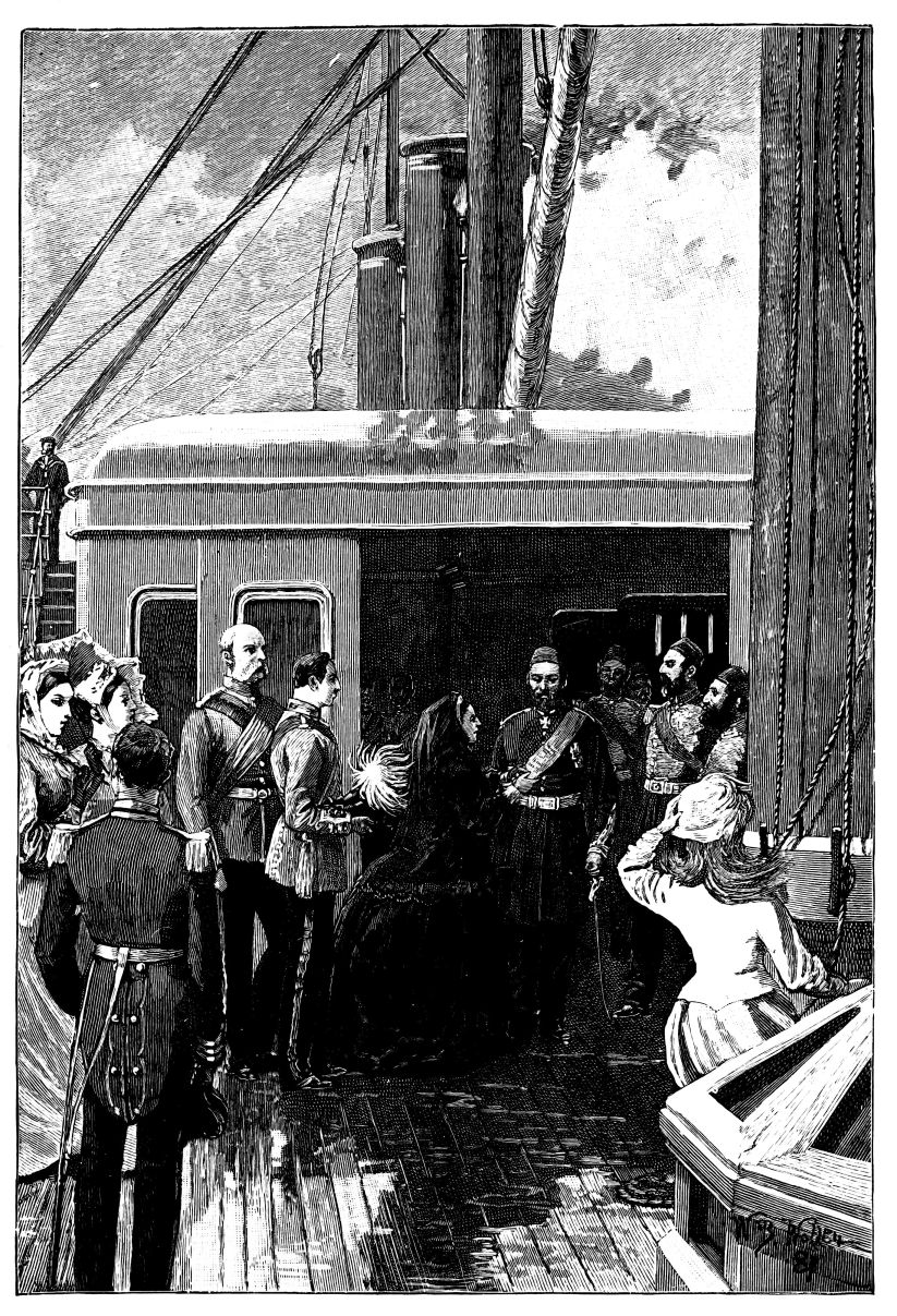 In May the Emperor of the French had sent the Queen an invitation to come and inspect the fortifications at Cherbourg. At this time the friction between France and England had been somewhat increased by a divergence of view between the two countries as to the settlement of the Danubian Principalities. England, by opposing their union, had irritated France. France, by refusing to admit that the engagements entered into by Napoleon III. at Osborne in 1857 bound her to support the English view, had annoyed England.[30] It was, however, thought that the Queen’s personal popularity in France, and her influence with the Emperor, might bring about friendlier relations between the Governments, and the Ministry pressed her to accept the Imperial invitation. Writing on the 5th of August, the day after the Queen’s arrival at Cherbourg, Lord Malmesbury, who was one of her party, says, “It blew hard in the night, but subsided towards morning. The Queen not ill. The approach to Cherbourg{22} very fine. Arrived there at 7 p.m. At 8 the Emperor and Empress came on board the Royal yacht without any suite. Nobody was admitted. Marshal Pélissier, who went in without any invitation, was immediately turned out by the Emperor.” What passed at this interview, however, was an embarrassing inquiry about the feeling against France in England. “We smiled,” writes the Queen of herself and her husband, “and said the feeling was much better, but that this very place caused alarm, and that those unhappy addresses of the Colonels had done incalculable mischief.” The grand effect of the saluting cannon seems to have impressed the Queen, and, says Lord Malmesbury, “when the Emperor left the Queen’s yacht, the electric light was thrown on the Emperor’s barge, following it the whole way into the harbour; the light shining only on the barge, whilst all around remained in darkness.” The Emperor, adds Lord Malmesbury, “was very friendly in his manner; but both he and the Empress could not digest some of the articles in the Times which had been offensive, especially against her, and I tried to make them understand what freedom the Press had in England, and how independent it was of all private and most public men.” As for the Queen, she says in her Diary that, after this grave visit she “went below,” and “read and nearly finished that most interesting book ‘Jane Eyre.’” On the morrow thunderous salutes smote her ears as she was dressing, and when she went on deck the harbour was literally swarming with craft brave with gala array. “Next morning,” writes Lord Malmesbury of this day’s proceedings, “the Queen, Prince Albert, the Prince of Wales, the Duke of Cambridge, Sir John Pakington, and myself breakfasted at the Préfecture. After which the Royal Personages drove over the town.... Returned to the Royal yacht, and accompanied the Queen to dinner on board the Bretagne. Among the officers at dinner was General Macmahon.” Here the Queen was rendered very nervous because Prince Albert had to make a complimentary speech in reply to the toast of her health, for at that moment every eye in Europe was on Cherbourg, and every ear straining for echoes of Royal and Imperial conversations on which might hang the dread issues of war. “I shook so,” writes the Queen, “that I could not drink my cup of coffee.”[31] All went off well, however, and the kindliest words on both sides were spoken. The display of 25,000 francs’ worth of fireworks ended a brilliant but fatiguing day. August 6th was devoted to leave-taking, amidst a complimentary cannonade, and the Queen got home in time to greet{23} Prince Alfred on his birthday at Osborne. “The evening,” she writes, “was very warm and calm. Dear Affie was on the pier, and we found all the other children, including Baby (Princess Beatrice), standing at the door.” A visit of inspection to Prince Alfred’s birthday presents, a little birthday fête and dance on the terrace, adds the Queen, formed “a delightful finale to our expedition.”[32] But the visit was a mistake, though, as the Ministry insisted on it, the blame was theirs alone. It produced an abundant crop of alarms and attacks in the press on the menacing preparations for war which had been seen at Cherbourg. It caused the Queen to have a controversy with Lord Derby, who would pay no heed to her appeal to provide a counterpoise to the threatening stronghold which she had inspected.