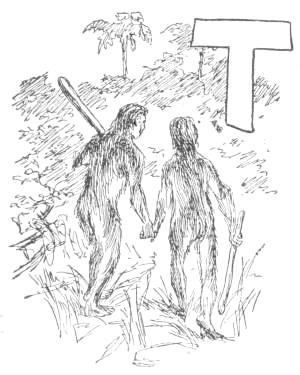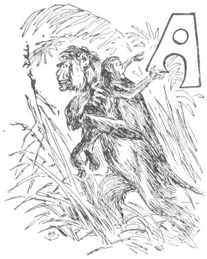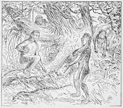 There were two principal species of Apes at this time, the Ammi, who afterwards became known as men, and the Lali, who were the enemies of the Ammi on the other side of the swamp; and, though there had come to be marked differences between the two, (of which we shall presently speak,) they were, at this time, both living together as Apes (the Man-Apes of Biology), and were[15] alike interested in ridding the country of the stronger beasts.