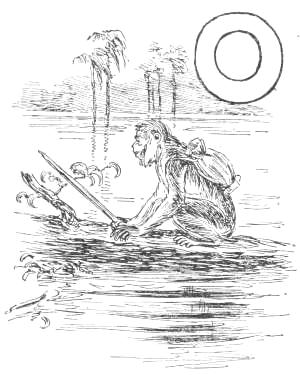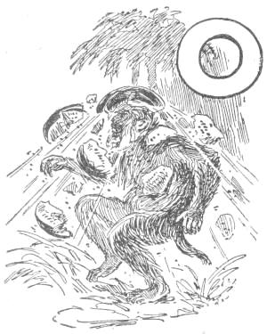 He related also that when hunting owls at night, after killing all that were in the forest, and having nothing more to throw at, he threw his stone at the moon, and hit it with such force that he cut off a piece; and, as evidence of this, he pointed to the moon, which was, indeed, seen to have a large piece gone, so that many Apes believed him for once, though they knew he was habitually a liar. For the evidence of their senses was generally deemed enough for the Apes. Shamboo, however, doubted the story and asked Shoozoo why he did not bring home the other piece of the moon. “When I cut it off,” he replied, “it fell into the Swamp and was swallowed by an alligator. I expect to catch that alligator, and then I will show you the rest of the moon.”