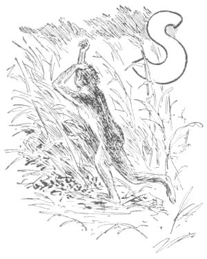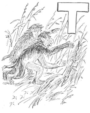 So they ran, and the earth rapidly receded behind them. The other two apes followed, but at a distance, so that the tiger and Shamboo were practically alone, and must soon, it seemed, try their strength in single combat. The tiger, however, was too scared to take an inventory of what he was carrying, while Shamboo’s thoughts were divided equally between how to hold on and how to let go. The tiger himself soon solved this problem for Shamboo by running through a hole in a thicket which was too small to admit both, so that Shamboo was knocked off. He fell into a cluster of bushes, and the fall was so violent as to cause him to turn several summersets, so that he did not know in which direction he had been going. The tiger, lightened of his load, but not of his scare, kept on, and was soon out of sight and out of this story.