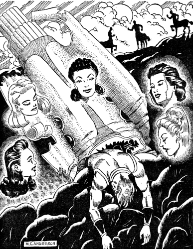 With a sigh of relief, he started to sit down. A lithe red-head sprang forward and held his chair. They all waited politely for him to be seated before they took their places. He felt silly. He felt like a captive princess. All the confidence engendered by the familiar settings of the space ship went out of him like wind. He, Jonathan Fawkes, was a castaway on an asteroid inhabited by twenty-seven wild women.
