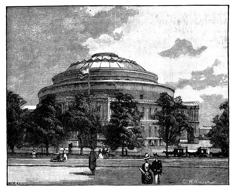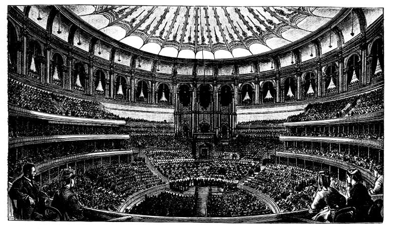 On the 29th of March, in the presence of a brilliant and fashionable crowd of upwards of 10,000 persons, the Queen opened the Royal Albert Hall at Kensington. The Members of the Provisional Committee met the Prince of Wales, their President, and, on the arrival of the Queen at half-past twelve o’clock, the Heir Apparent read the address to her Majesty, which could hardly be heard, because a provoking echo mimicked the tones of his voice whilst he described the completion of the Hall. The Queen having handed to the Prince a written answer, said, “I wish to express my great admiration of this beautiful Hall, and my earnest wishes for its complete success.” After a prayer from the Bishop of London, the Prince exclaimed, “The Queen declares this Hall to be now opened!” an announcement which was followed by a burst of cheering, the National Anthem, and the discharge of the Park guns. Then a concert was given, which included the performance of a cantata written expressly for the occasion by Sir Michael Costa.{410}