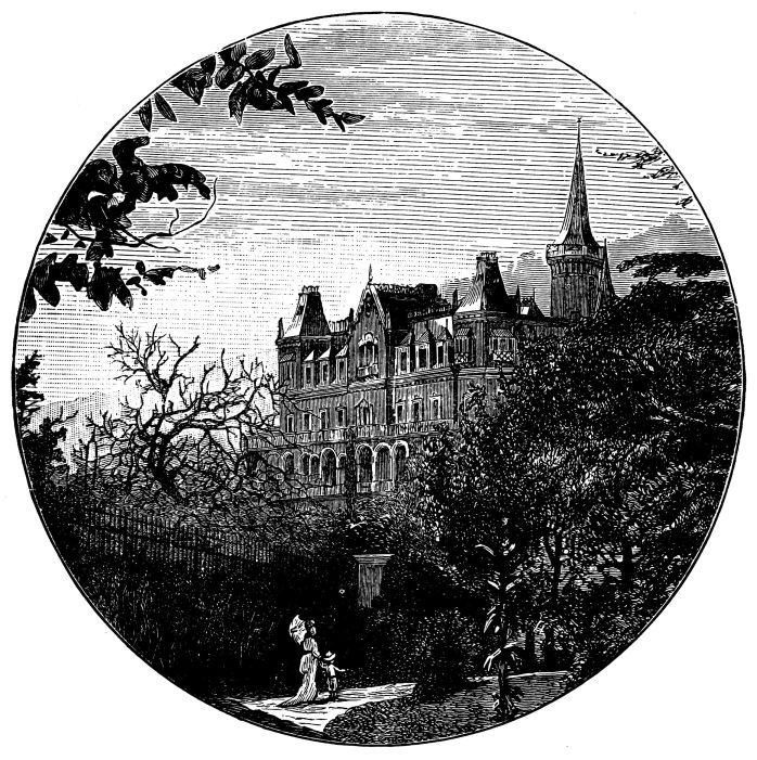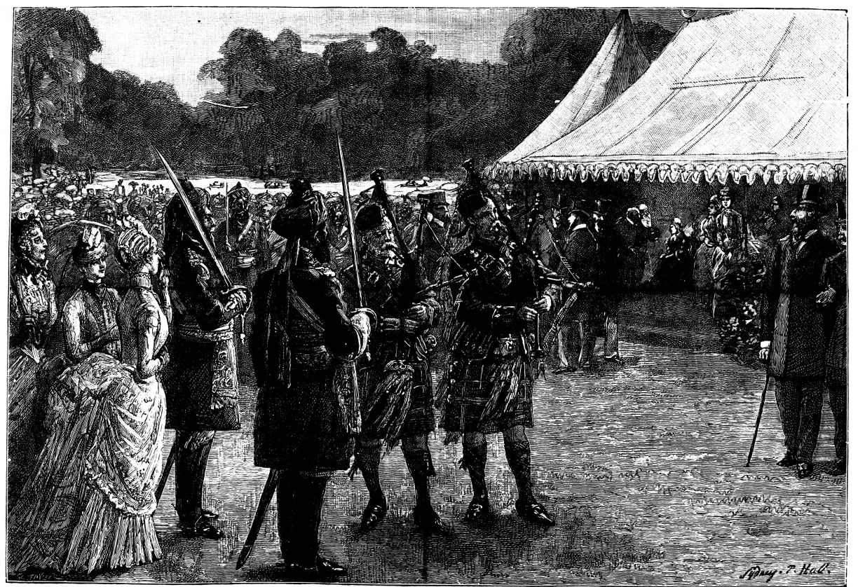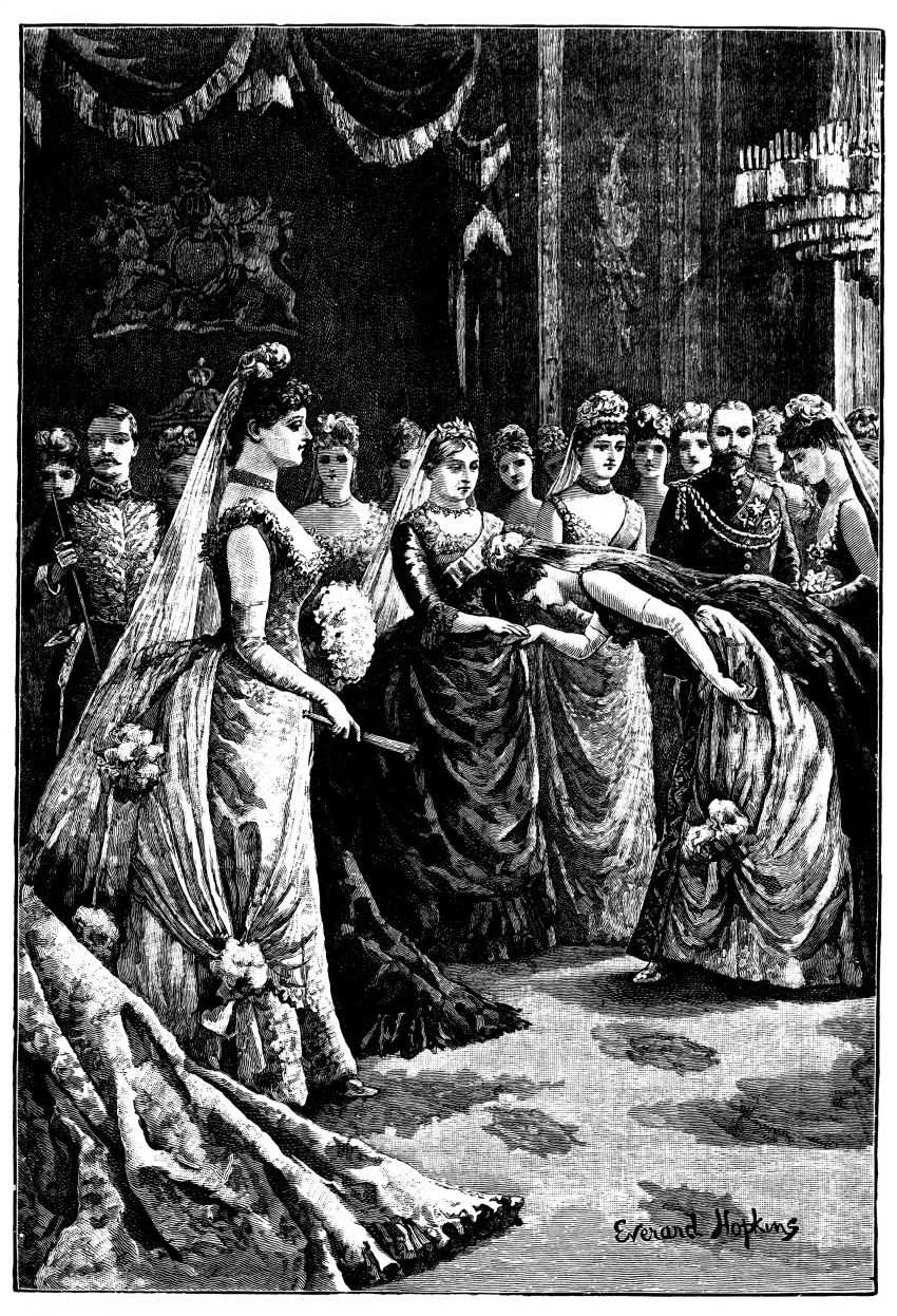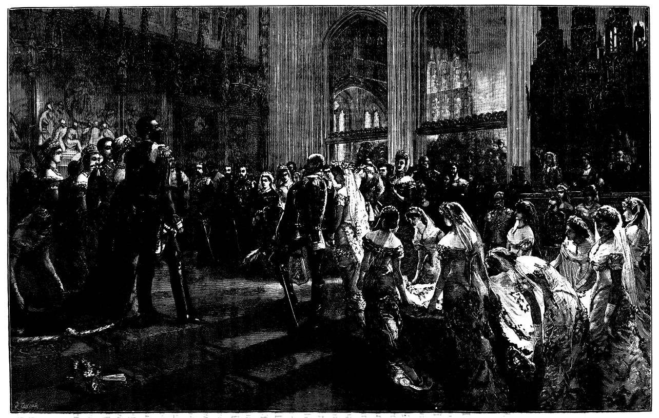 The town of Windsor was en fête for the occasion, the people crowding the Castle Green, and the Eton boys occupying the Castle Hill. The police and soldiery kept a passage open for the guests who came from London by special train, and who were conveyed in Royal carriages to St. George’s Chapel amid general cheering and joyous ringing of bells. The Ministers of State, Foreign Princes and Ambassadors, and other prominent persons, were gay in rich and glittering uniforms. Of the bridal party, the first to arrive was the Duke of Argyll, with his family. He wore the dress of a Highland chieftain, with philabeg, sporran, claymore, and jewelled dirk. A plaid of Campbell tartan was thrown across his shoulders, over which was also hung the Order of the Thistle. He was accompanied by the Duchess of Argyll, who shone in silver and white satin. The Lord Chancellor, in wig and gown, and Lord Halifax, in Ministerial uniform of blue and gold, walked up the central aisle and took their{408} seats, along with members of the Cabinet and the Privy Council, in the stalls to the left of the altar. Then came the Princess Christian, in pink satin, trimmed with white lace, and some Indian potentates, radiant in auriferous scarlet. Lord Lorne, the bridegroom, next entered, arrayed in the uniform of the Argyllshire Regiment of Volunteer Artillery, of which he was Colonel, looking pale and nervous. He was supported by his groomsmen, Lord Percy and Lord Ronald Leveson-Gower. The Princess Beatrice arrived evidently in high spirits, and wearing a pink satin dress, her sunny hair flowing freely down her back. The Princess of Wales, who received an almost affectionate greeting, was the last of the Royal party to come. All the members of the Royal Family were then present, with the exception of Prince Alfred. As the procession advanced up the nave, the bride was supported on the right by the Queen, and on the left by the Prince of Wales and the Duke of Saxe-Coburg and Gotha. The Princess, in her dress of white satin and veil of Honiton lace, was voted one of the most charming brides on whom the sun had shone. Eight bridesmaids followed, all daughters of dukes and earls, clad in white satin, decorated with red camellias. The Queen appeared in black satin, relieved by the broad blue ribbon of the Garter, and by a fall of white lace, which nearly reached to the ground. The service was read by the Bishop of London, the Queen giving away her daughter.[30] After the ceremony, the Queen took the bride in her arms, and kissed her heartily, while the Marquis of Lorne knelt and kissed the Queen’s hand. The Royal wedding breakfast was served in the magnificent oak-room of Windsor Castle, the company including the Prince and Princess of Wales, Prince Arthur, the Duke and Duchess of Cambridge, Prince and Princess Teck, the Duke of Saxe-Coburg, Prince and Princess Christian. Another breakfast for the general company was served in the Waterloo Gallery. When the newly-married pair left the Castle for Claremont, it was noticed that the bride wore a charming travelling costume of Campbell tartan. As they departed, their numerous relatives showered over them a quantity of white satin slippers, and, following an ancient Highland usage, a new broom was also thrown after them as they got into the carriage. The Oriental custom of flinging rice after a wedded couple, introduced into England by the family of Musurus Pasha, the Turkish Ambassador, had not then become the mode in the highest circles of Society.[31]