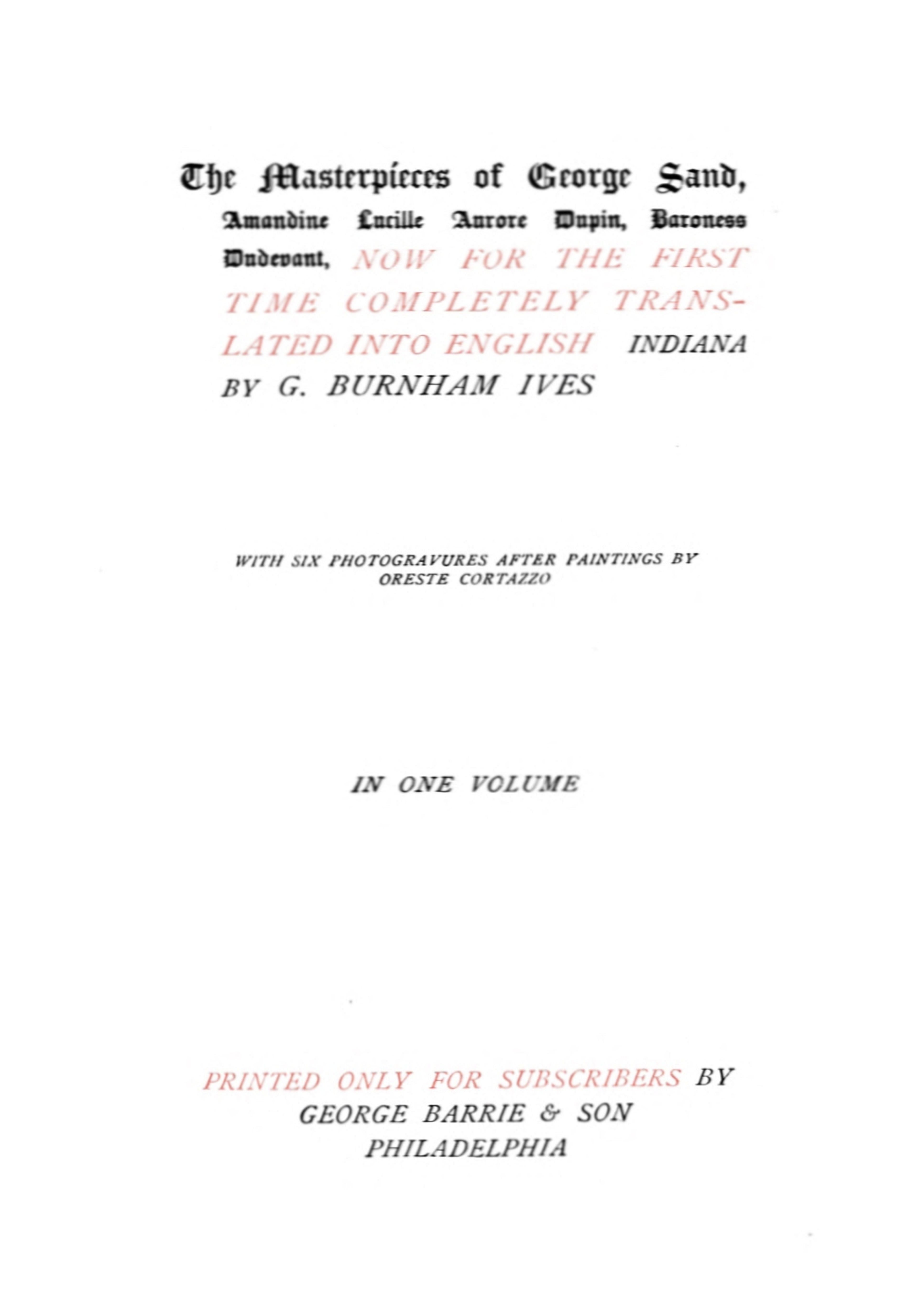 The Project Gutenberg EBook of Indiana, by George Sand This eBook is for the use of anyone anywhere in the United States and most other parts of the world at no cost and with almost no restrictions whatsoever. You may copy it, give it away or re-use it under the terms of the Project Gutenberg License included with this eBook or online at www.gutenberg.org. If you are not located in the United States, you'll have to check the laws of the country where you are located before using this ebook. Title: Indiana Author: George Sand Illustrator: Oreste Cortazzo Translator: George Burnham Yves Release Date: October 12, 2020 [EBook #63445] Language: English Character set encoding: UTF-8 *** START OF THIS PROJECT GUTENBERG EBOOK INDIANA *** Produced by Dagny and Laura Natal Rodrigues at Free Literature (Images generously made available by Hathi Trust.)