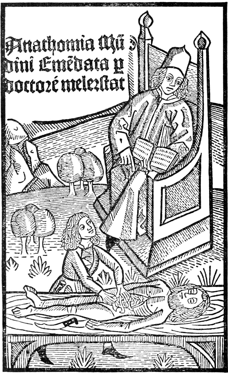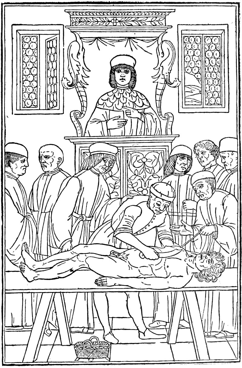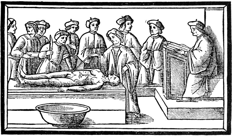 In the year 1315, in the old Italian city of Bologna, an event occurred which marks an important epoch in the history of medicine. A wondering crowd of medical students witnessed the dissection of a human cadaver—one of the few procedures of the kind that had occurred since the fall of the Alexandrian University. Acting under royal authority Mondino, a man far in advance of the age, placed the body of a female upon a table where for many centuries before only the cadavera of apes, of swine and of dogs had been studied.