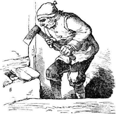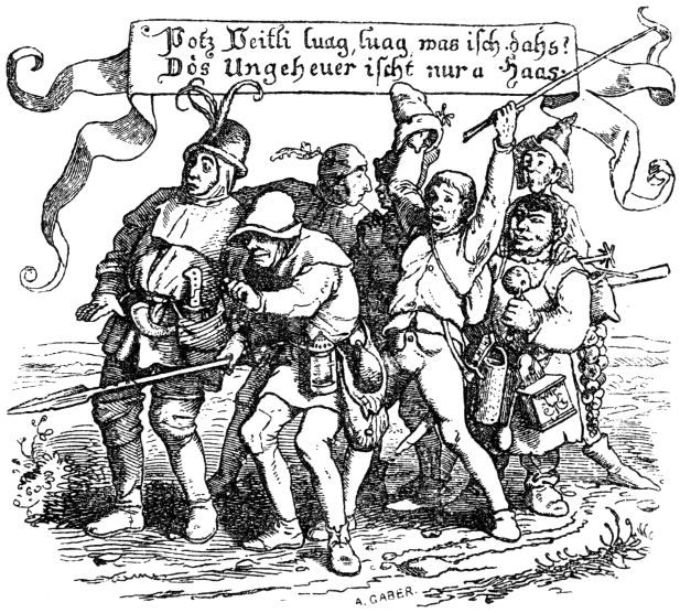 Als der gute König sahe, daß alle seine treuen Diener um eines einzigen Mannes willen ihn verlassen wollten, ward er traurig, wie nie zuvor, und wünschte, daß er den Helden doch nie möge gesehen haben; scheute sich aber doch, ihn hinwegzuschicken, weil er fürchten mußte, daß er samt all seinem Volk von ihm möchte erschlagen, und hernach sein Königreich von dem stracklichen Krieger möchte besessen werden. Da nun der König in dieser schweren Sache Rat suchte, was doch zu tun sein möge, um alles gütlich abzutun und zum Besten zu lenken, so ersann er letztlich eine List, mit welcher er vermeinte, des Kriegsmannes (den niemand für einen Schneider schätzte) ledig zu werden und abzukommen. Er sandte sogleich nach dem Helden und sprach zu ihm, wie er (der König) wohl vernommen, daß ein gewaltigerer und stärkerer Kampfheld auf Erden nimmer zu finden sei, denn er (der Schneider). Nun hauseten im nahen Walde zwei Riesen, die täten ihm aus der 8 Maßen großen Schaden mit Rauben, Morden, Sengen und Brennen im Lande umher, und man könne ihnen weder mit Waffen noch sonst wie beikommen, denn sie erschlügen alles, und so er sich’s nun unterfangen wolle, die Riesen umzubringen, und brächte sie wirklich um, so solle er des Königs Tochter zur ehelichen Gemahlin, und das halbe Königreich zur Aussteuer erhalten, auch wolle der König ihm hundert Reiter zur Hilfe gegen die Riesen mitgeben.