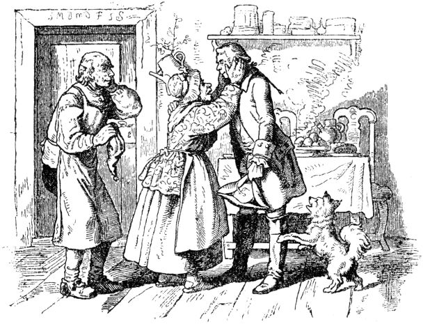Des Königs Räte, so den schlafenden Schneider gleichfalls gesehen, taten solches Sr. Majestät, ihrem allergnädigsten König, zu wissen, mit dem untertänigsten Bemerken, daß, so sich kriegerischer Zwiespalt erhebe, dieser Held ein sehr nützlicher Mann werden und dem Lande gute Dienste leisten könne. Dem König gefiel diese Rede wohl, sandte alsbald nach dem geharnischten Schneider, und ließ ihn fragen, ob er Dienste begehre? Der Schneider antwortete, eben deshalb sei er hergekommen, und bäte die Königliche Majestät, wo höchstdieselbe ihn zu brauchen gedächte, ihm allergnädigst Dienste zu verleihen. Der König sagte dem Schneiderlein Dienste zu, verordnete ihm ein stattliches Losament und Zimmer, und gab ihm eine 7 gute Besoldung, von der es, ohne etwas zu tun, herrlich und in Freuden leben konnte.