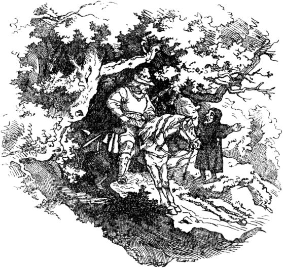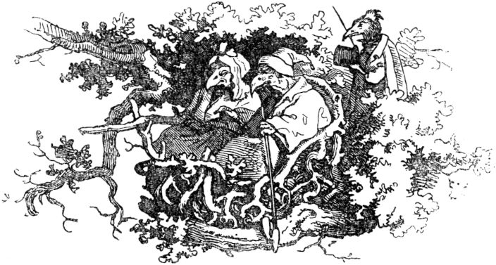 Auf diese Rede des Königs ward dem Schneiderlein ganz wohl zumute und deuchte ihm schön, daß es sollte eines Königs Tochtermann werden und ein halbes Königreich zur Aussteuer empfangen; sprach daher kecklich: er wolle gern dem König, seinem allergnädigsten Herrn, zu Diensten stehen, und die Riesen umbringen, und sie wohl ohne Hilfe der hundert Reiter zu töten wissen. Darauf verfügte er sich in den Wald, hieß die hundert Reiter, die ihm auf des Königs Befehl dennoch folgen mußten, vor dem Walde warten, trat in das Dickicht, und lugte umher, ob er die Riesen irgendwo sehen möchte. Und endlich nach langem Suchen fand er sie beide unter einem Baume schlafend, und also schnarchend, daß die Äste an den Bäumen, wie vom Sturmwind gebogen, hin- und herrauschten.