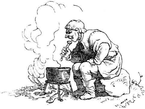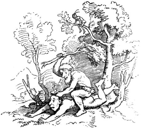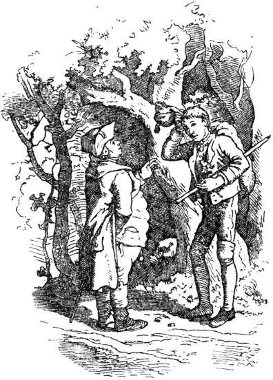 Auf diese Rede des Königs ward dem Schneiderlein ganz wohl zumute und deuchte ihm schön, daß es sollte eines Königs Tochtermann werden und ein halbes Königreich zur Aussteuer empfangen; sprach daher kecklich: er wolle gern dem König, seinem allergnädigsten Herrn, zu Diensten stehen, und die Riesen umbringen, und sie wohl ohne Hilfe der hundert Reiter zu töten wissen. Darauf verfügte er sich in den Wald, hieß die hundert Reiter, die ihm auf des Königs Befehl dennoch folgen mußten, vor dem Walde warten, trat in das Dickicht, und lugte umher, ob er die Riesen irgendwo sehen möchte. Und endlich nach langem Suchen fand er sie beide unter einem Baume schlafend, und also schnarchend, daß die Äste an den Bäumen, wie vom Sturmwind gebogen, hin- und herrauschten.