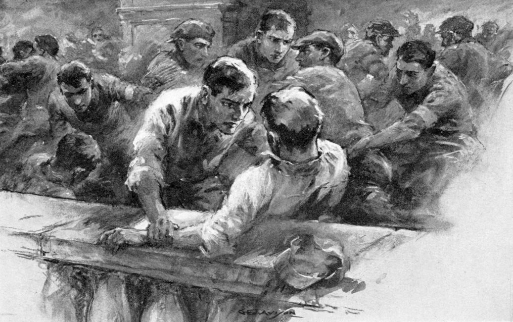 “It’s the pure quill,” said Merkle. “Dark night; single-span concrete bridge about a mile back in the country. Sophomores defend it; Freshies try to rush it. Two upper classes on hand to keep the murder list as low as possible. You’ll like it.”